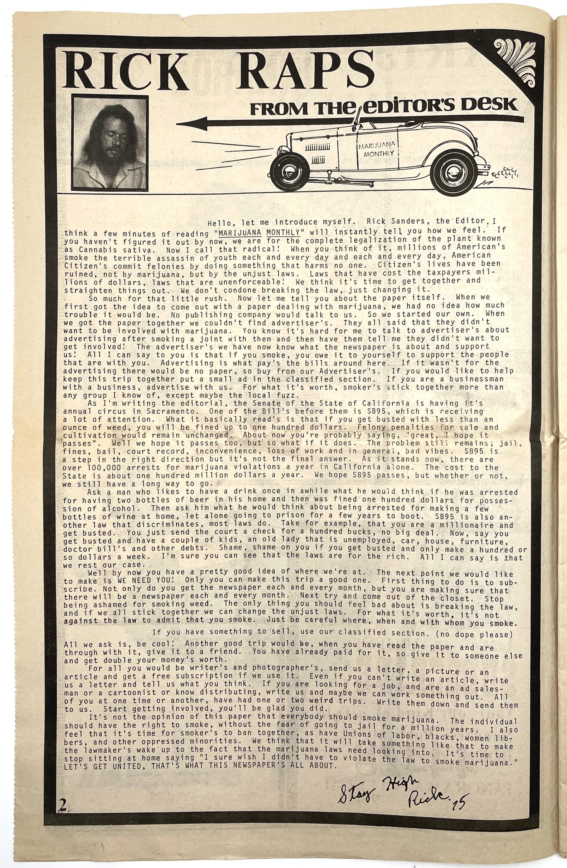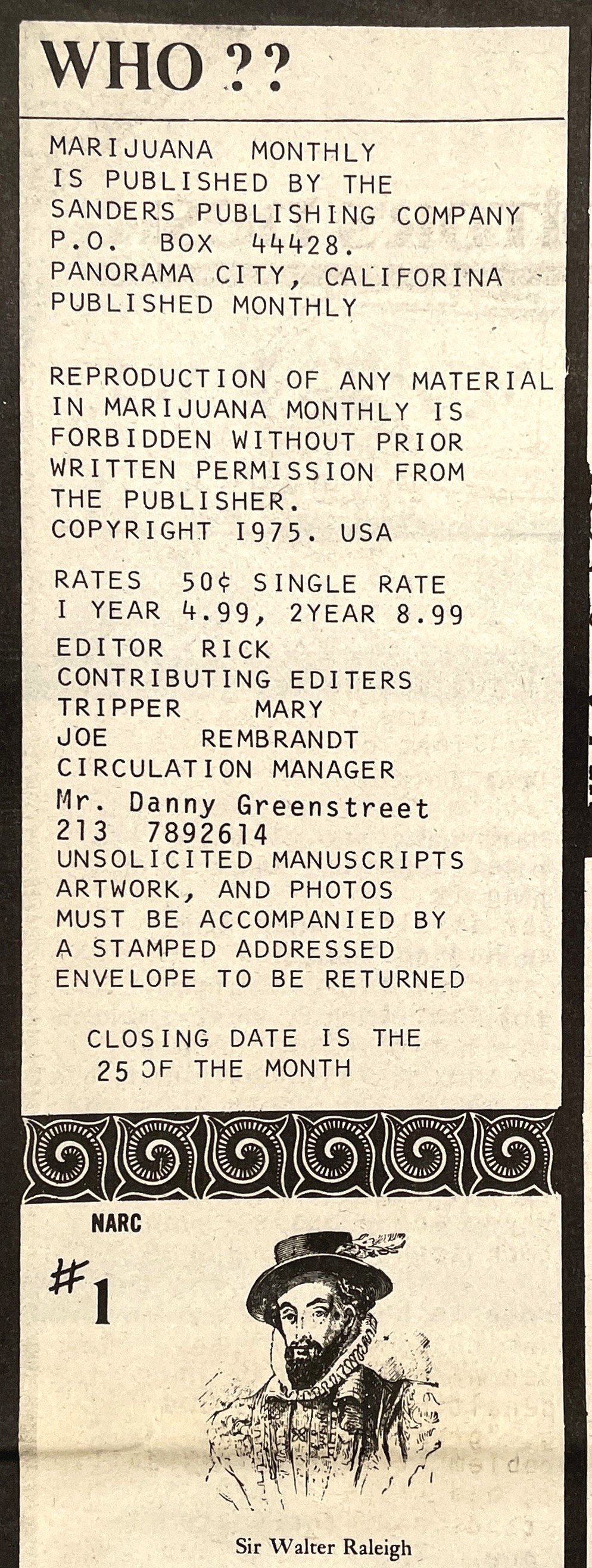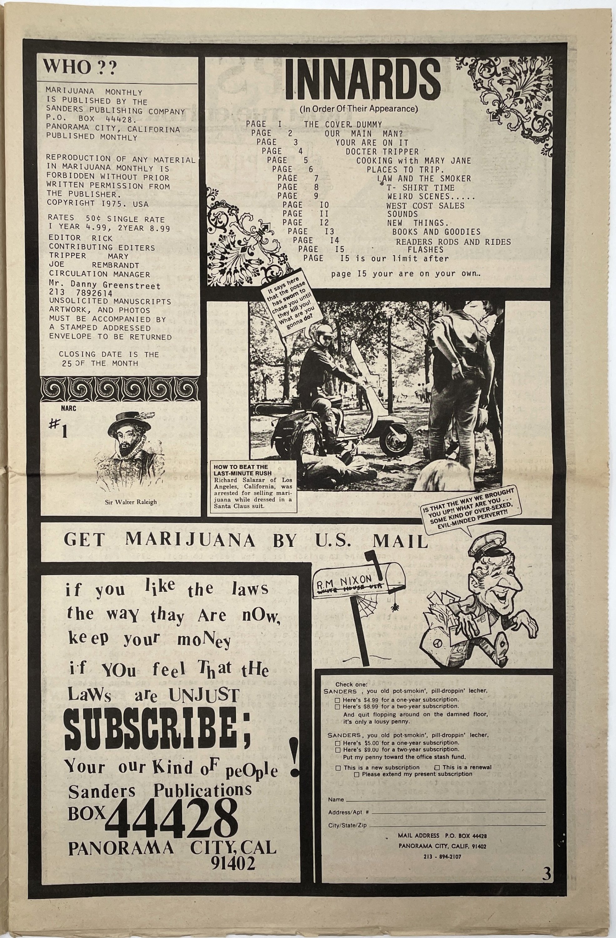 Rick Sanders, editor. Marijuana Monthly, Issue No. 1. Panorama City, CA: Sanders Publishing Co., 1975. First edition.
