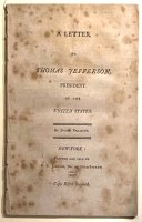 JEFFERSON, THOMAS.) [Johnson, P.R.?] A Letter to Thomas Jefferson. 8vo, disbound; moderate foxing, minor wear to margins. New York, 1802. About as vicious an attack on the third president as you could ever hope to find, in the form of an open letter signed by "Junius Philænus," but generally attributed to the pamphlet's printer, P.R. Johnson. Declares that Jefferson's "principles and views . . . are destructive to the good of this country, and indeed of any country on earth." Among his other crimes, he is alleged to have "polluted the consecrated ashes of Washington with the tears of a crocodile." When accusing Jefferson of crimes "of a private and black nature," the author is likely alluding to the Sally Hemings scandal, which was then just coming to light. Howes J77; Sabin 36926. No copies known at auction since 1941.
