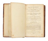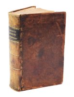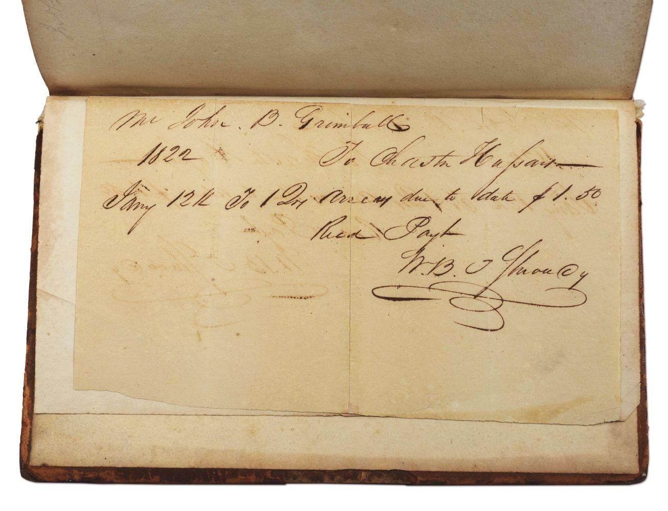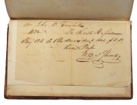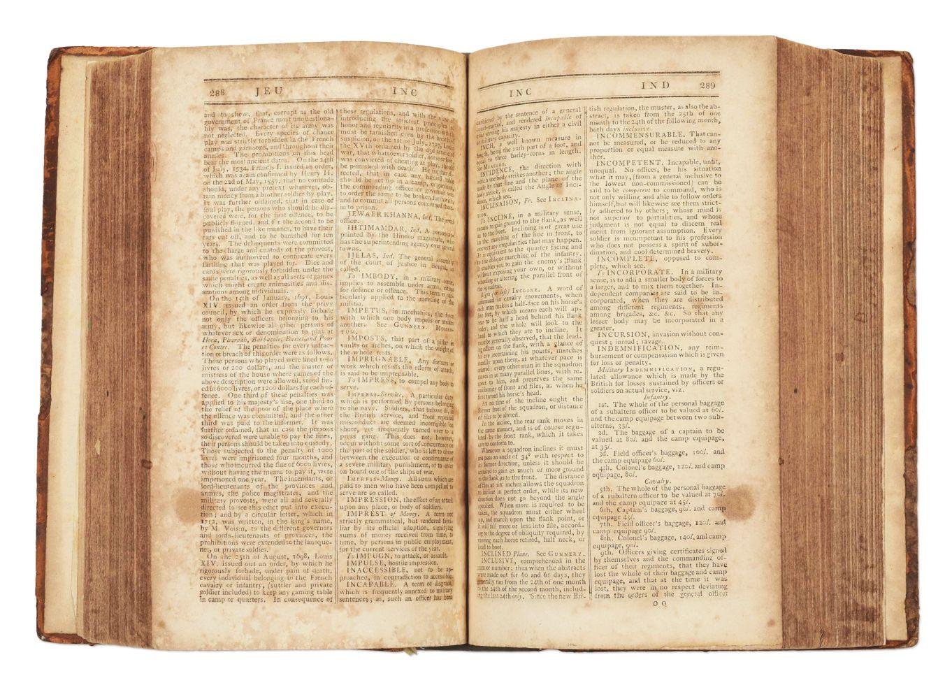 William Duane. "A MILITARY DICTIONARY; or, Explanation of the Several Systems of Discipline of Different Kinds of Troops, Infantry, Artillery, and Cavalry; The Principles of Fortification, and All the Modern Improvements in the Science of Tactics: Comprising the Pocket Gunner, or Little Bombardier; The Military Regulations of the United States; The Weights, Measures, and Monies of All Nations; The Technical Terms and Phrases of the Art of War in the French Language. Particularly Adapted to the Use of the Military Institutions of the United States." 1st and ony edition. Large quarto, xii, 748 pp. Double column text. Contemporary tree calf with recent leather spine, bearing gilt black leather spine label. Scarce. Ownership inscription in graphite on upper right of title page of original owner, "John Berkley Grimball/Charleston So. Ca.", with a related receipt found inside book and now tipped in book between end papers, being a receipt for $1.50 from the Charleston Hussars to Grimball for his quarterly dues payment (then in arrears), dated January 12, 1822. From a important Charleston, South Carolina collection.