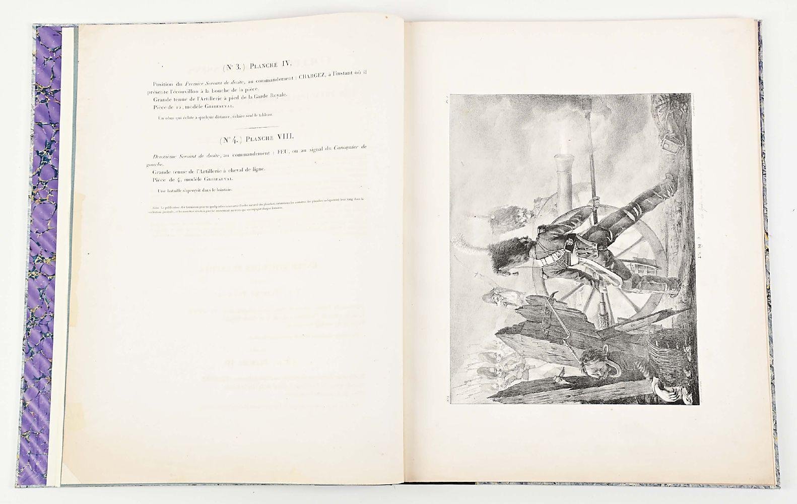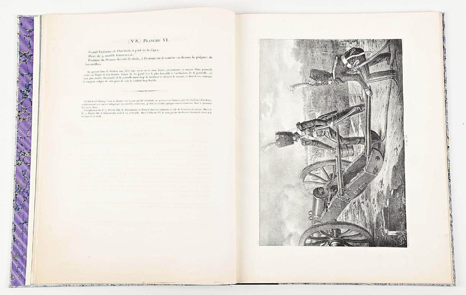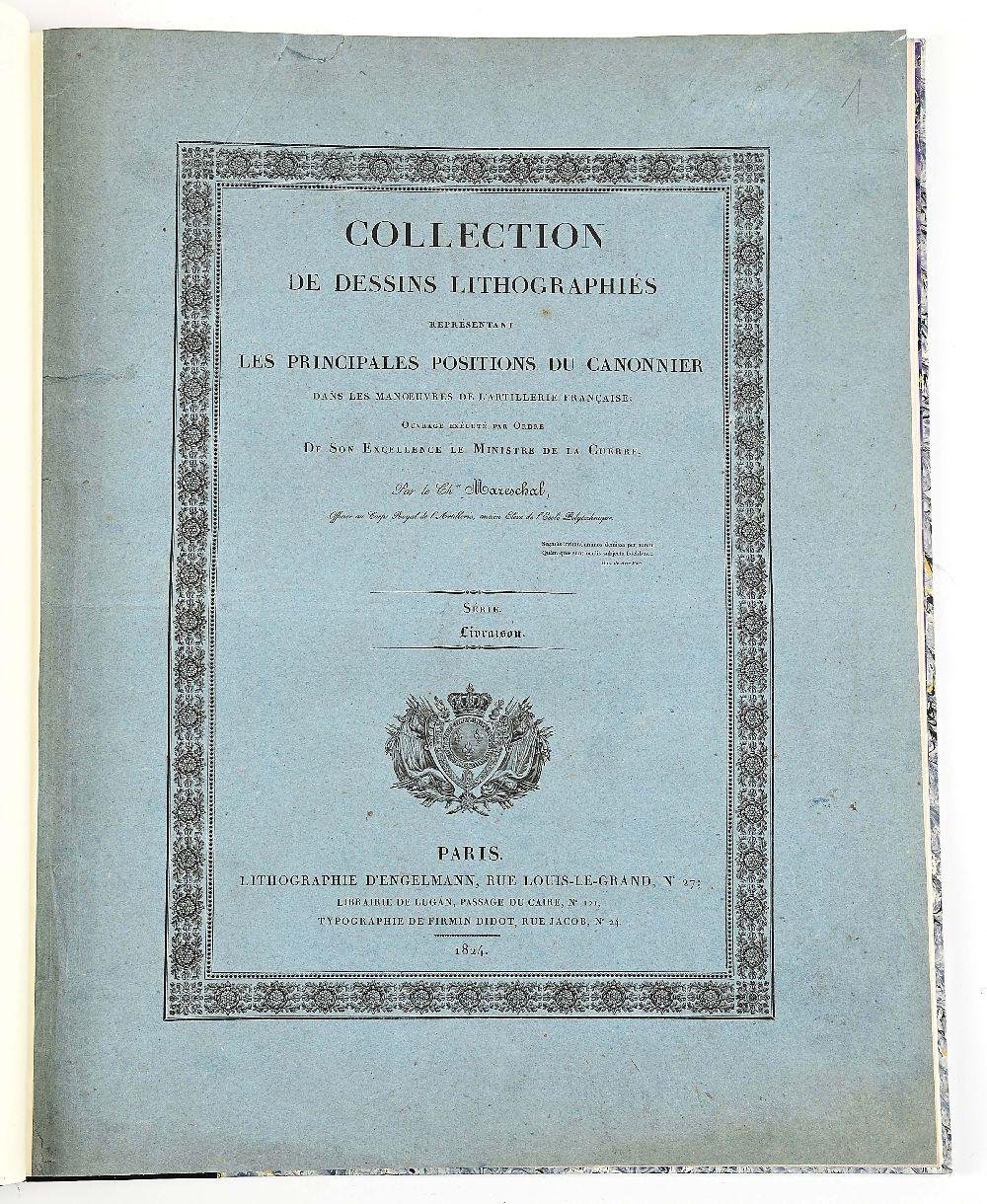 MARESCHAL, Armand-Adrien. "Collection de Dessins Lithographiés représentant les Principales Positions du Canonnier, dans les Manoeuvres de lArtillerie Française; Ouvrage exécuté par Ordre de Son Excellence le Maréchal Duc de Bellune, Ministre de la Guerre, par le Cher. Mareschal, Officier au Corps Royal de lArtillerie, ancien Elève de lEcole Polytechnique." (Collection of lithographed drawings representing the main positions of the gunner in the maneuvers of the French artillery....)." Paris: Lithographie d'Engelmann, rue Lois-le-Grand, No. 27 (plates) and Firmin-Didot, 1824 (text sheets). In-folio, 12 sheets of plate explanations and 36 plates. Handsome modern binding of 1/4 leather and marbled boards with new endpapers, encompassing the entire original set within its publisher's blue paper covers. Extremely rare and superb collection engraved by Engelman after the drawings of the talented artist-author Mareschal, a professional artillery officer and member of the École polytechnique. This handsome series on artillery drill and the guns and carriages was produced at the request of the Minister of War. It was originally started in 1820, with the first series released in 1823 but not completed and published in its entirety until 1824. We see intrepid mustachioed cannoneers handling artillery pieces with terrible coolness, in the midst of the smoke of the battlefields. (Colas 1982--copy cited by Colas contains only the first series of 20 lithographs; the complete collection as presented here, has all 36 litho. plates). CONDITION: very good to excellent overall; text pages and plates bright and clean the first few text pages with some marginal smudging; all plates in very good condition, with strong impressions; the final series of 4 plates and text very light toned.