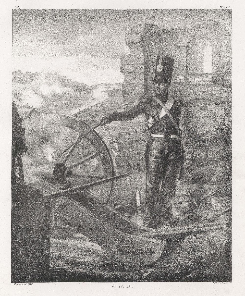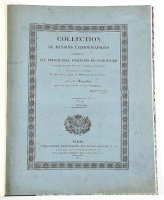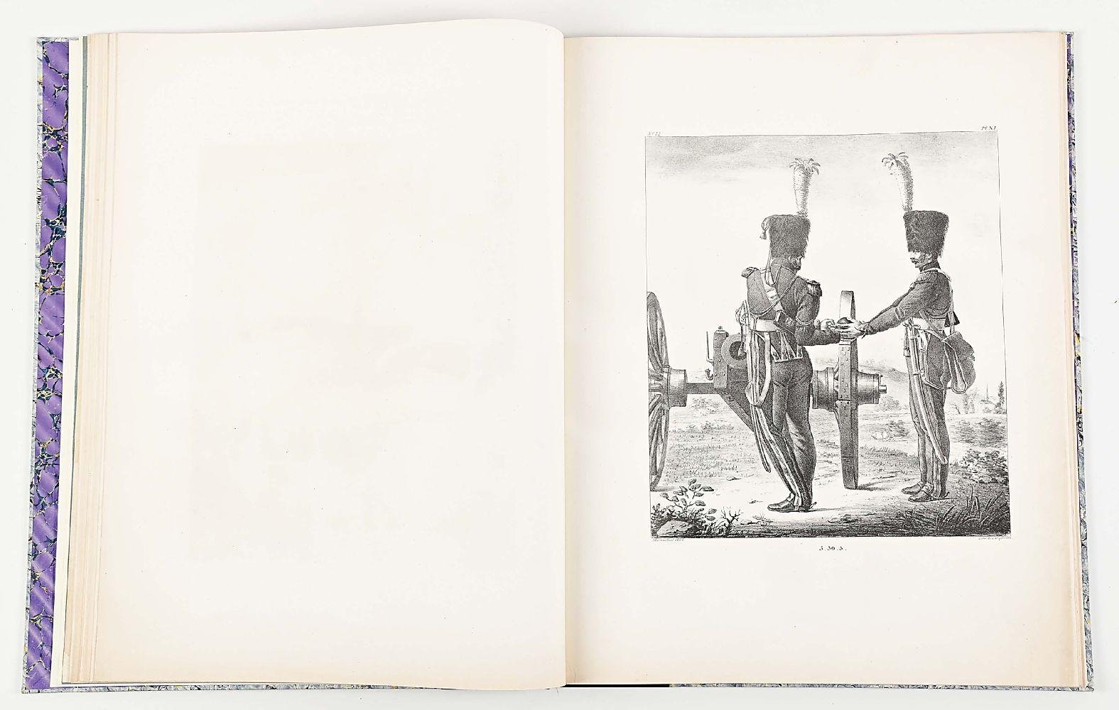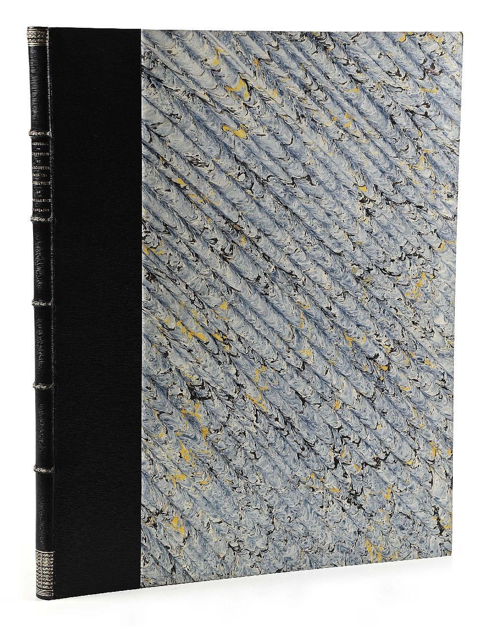 MARESCHAL, Armand-Adrien. "Collection de Dessins Lithographiés représentant les Principales Positions du Canonnier, dans les Manoeuvres de lArtillerie Française; Ouvrage exécuté par Ordre de Son Excellence le Maréchal Duc de Bellune, Ministre de la Guerre, par le Cher. Mareschal, Officier au Corps Royal de lArtillerie, ancien Elève de lEcole Polytechnique." (Collection of lithographed drawings representing the main positions of the gunner in the maneuvers of the French artillery....)." Paris: Lithographie d'Engelmann, rue Lois-le-Grand, No. 27 (plates) and Firmin-Didot, 1824 (text sheets). In-folio, 12 sheets of plate explanations and 36 plates. Handsome modern binding of 1/4 leather and marbled boards with new endpapers, encompassing the entire original set within its publisher's blue paper covers. Extremely rare and superb collection engraved by Engelman after the drawings of the talented artist-author Mareschal, a professional artillery officer and member of the École polytechnique. This handsome series on artillery drill and the guns and carriages was produced at the request of the Minister of War. It was originally started in 1820, with the first series released in 1823 but not completed and published in its entirety until 1824. We see intrepid mustachioed cannoneers handling artillery pieces with terrible coolness, in the midst of the smoke of the battlefields. (Colas 1982--copy cited by Colas contains only the first series of 20 lithographs; the complete collection as presented here, has all 36 litho. plates). CONDITION: very good to excellent overall; text pages and plates bright and clean the first few text pages with some marginal smudging; all plates in very good condition, with strong impressions; the final series of 4 plates and text very light toned.