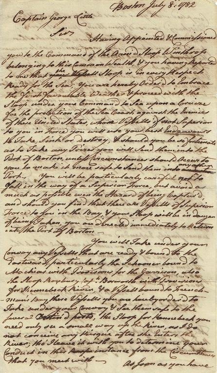 "Having Appointed & Commissioned you to the Command of the Arm'd Sloop Winthrop belonging to this CommonWealth...you are hereby Order'd to Embrace the first favorable Weather and proceed with the Sloop under your Command to Sea upon a Cruise for the protection of the Sea Coast against the Enemies of these United States, whose Vessells if not Superior to you in Force you will use your best Endeavours to Take, Sink or Destroy, & should you be so fortunate as to Take any Prizes you will Send them into the Port of Boston...You will Take under your Convoy any Vessells that are ready & bound to the Eastward, particularly the Schooner bound to Machias with provisions for the Garrison, also the Sloop Roxbury Cap’n Bosworth with Provisions for Kennebeck River, & a Vessell bound to Frenchman's Bay, those Vessells you are hereby order'd to Take under your Convoy & See them safe to the Several Destin'd ports....You will be careful that the Regulations of the Common Wealth with respect to Arm’d Vessels be strictly adher’d to, & that good order & proper Discipline be preserv’d on board the Winthrop.