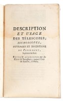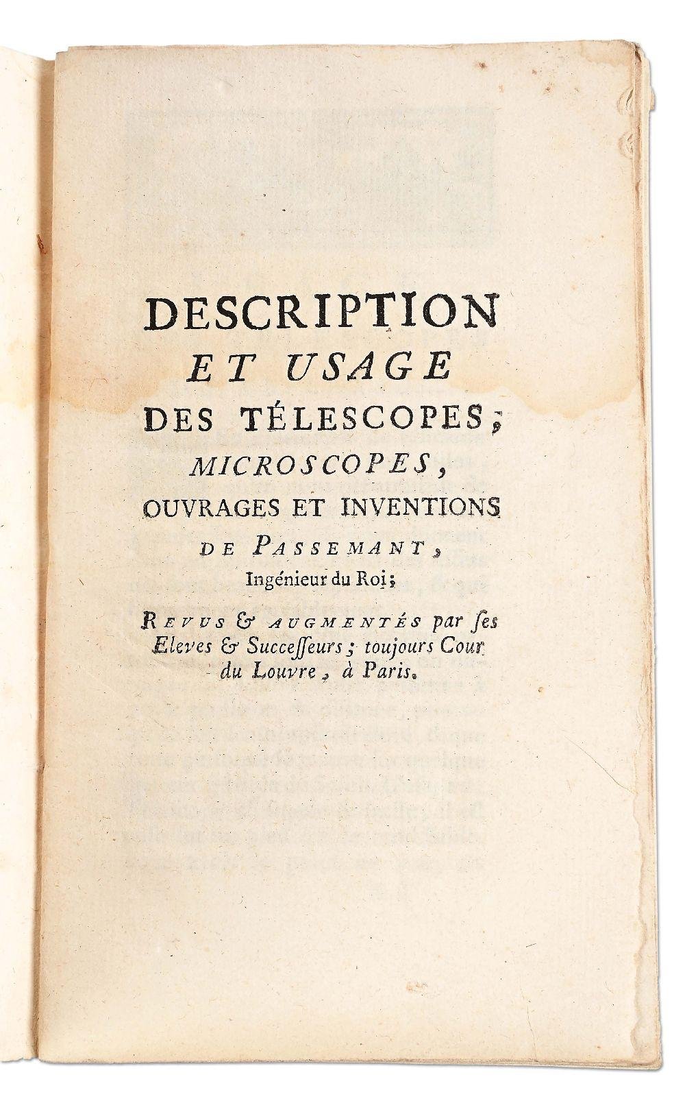 Octavo, np., nd. (Paris, circa 1769). 116 pp. with folding plate, in original printer's marbled paper covers. Last edition of this highly important description and user manual for microscopes and telescopes by Passemant, the most famous French optical instrument manufacturer of the eighteenth century. In addition to these instruments, there are barometers, physics instruments, pneumatic or electric machines, astronomical clocks, clocks, watches, etc. The first edition, around 1750, was only 29 pages long. This was revised and expanded "by his pupils and successors", who were Ollivier and Nicolet. It is illustrated with a fold-out engraving representing a compound Cuff-type microscope to which two micrometers invented by Passemant have been added. At the end: "Table of prices of reflection telescopes, & of Passemant's microscopes." PROVENANCE: The 18th century library of General Francois-Marie d'Aboville and by descent to 2023. CONDITION: A very good and clean copy, with bright pages and plate, marred only by very light dampstaining to the upper 1/3rd of the first 24 pp.