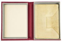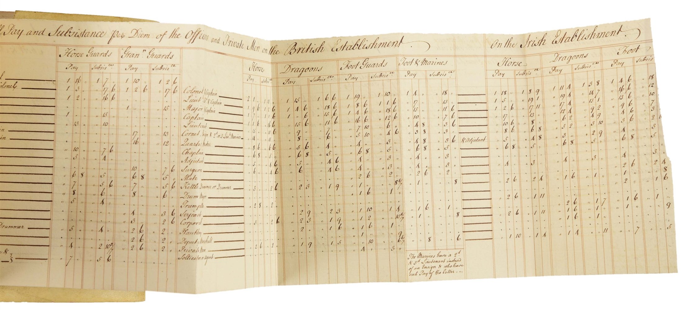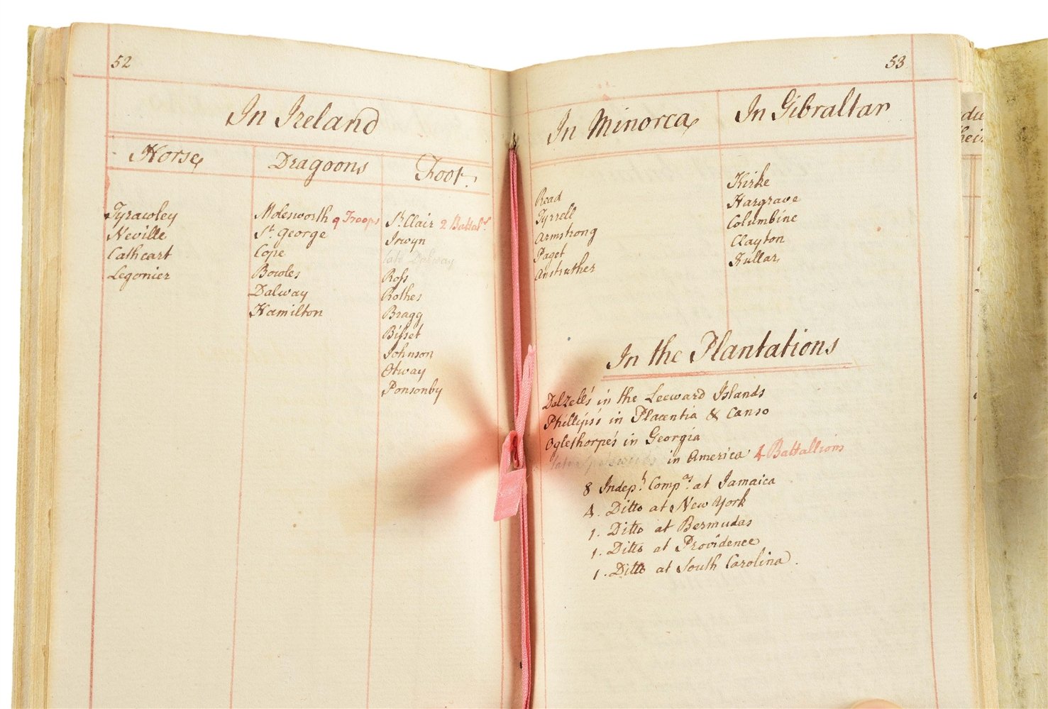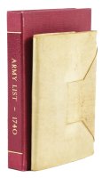 [Untitled Manuscript Army List of 1739/1740]. 99 pp. excluding blanks, with folding manuscript table of officers’ pay and allowances; written in black ink, but annotated and ruled in red, bound with red silk ribbon within integral vellum, folding wallet with tongue closure; housed in modern, clamshell box with red morroco and gilt-lettered spine label. Essentially, a List of of the General and Field Officers by seniority and corps, Regiments and Duty Stations, and breakdowns of the Military Establishment of the British Army, 1739/1740 during the period of King George’s War or the “War of Jenkin’s Ear”. Inscribed on first page: "W. Hetzler In Orange Court near King Street Chappel Golden Square St. James's Parish at the Green Lamp - who humbly offers his service in any Business subject to the Pen, with the utmost Expedition.” CONDITION: vellum wallet slightly soiled; pages clean and bright.