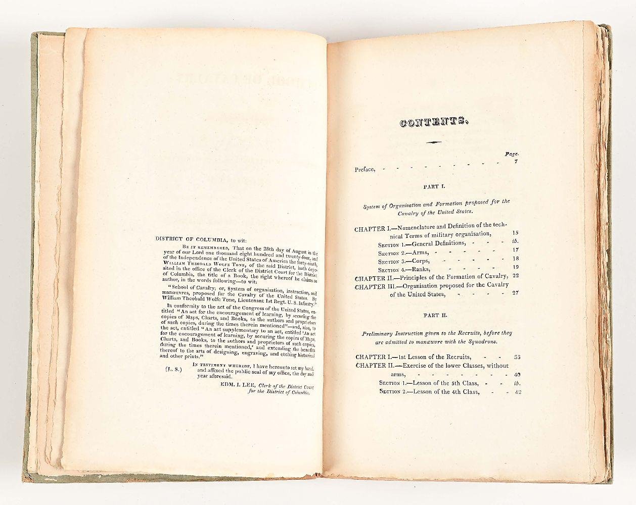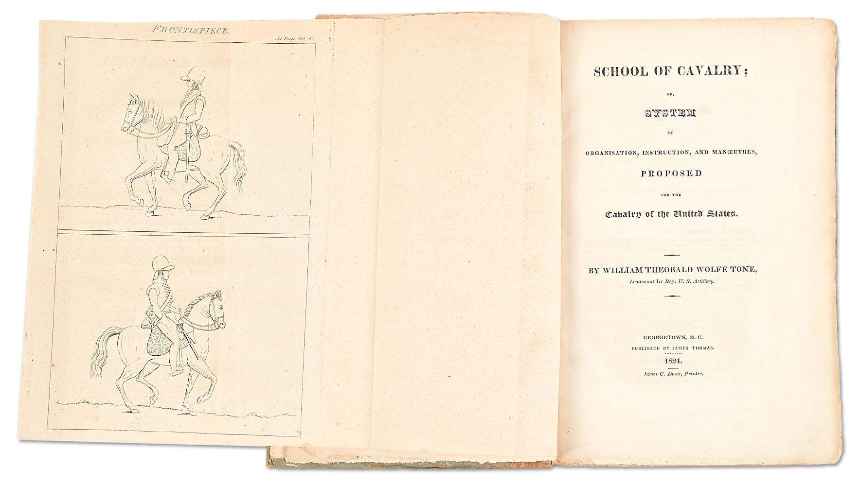 By William Theobald Wolfe Tone, Lieutenant 1st Reg. U.S. Artillery. Georgetown, D.C. Published by James Thomas. 1824. James C. Dunn, Printer. Original blue printer's boards with white spine. Quarto, xiii, 177 pp. with 17 folded plates, including frontispiece. Signed on inside of front cover "J.C. Pegram / Major of Cavalry" Besides the rarity of this work, it should receive more notice than it has, as the author was the son of Wolfe Tone, father of Irish republicanism and leader in the Independence movement. William Theobold Wolfe Tone (1791-1828) became a naturalized French citizen and fought with Napoleon, earning the Legion of Honor. After Waterloo, he left France and came to the US, where he eventually was commissioned in the US Army as a lieutenant of artillery in 1820. He resigned his commission in 1828 due to illness and died shortly thereafter. Extremely rare, only 7 copies found in OCLC and no record of auction sale since 1940s. (SABIN 96160). CONDITION: Very good, some minor chips and edge wear to the boards, the spine toned, the binding tight and the pages clean and bright, one signature with light toning.