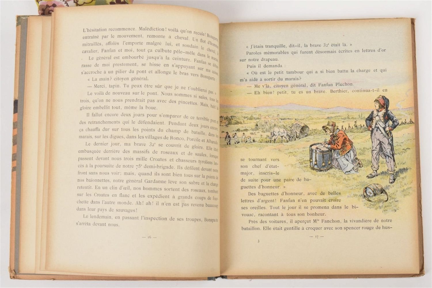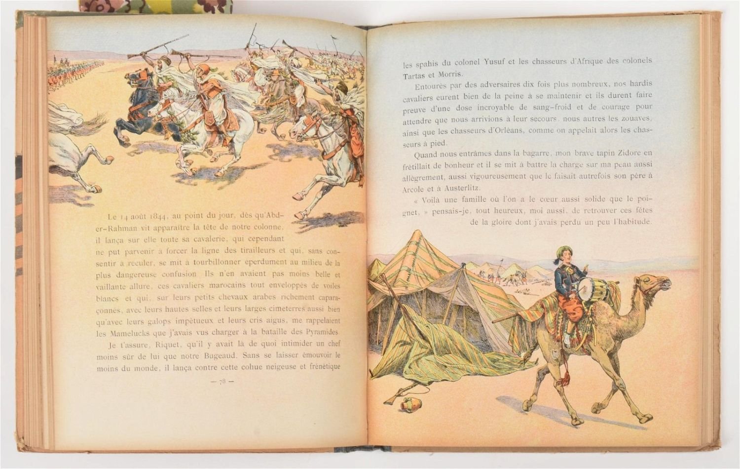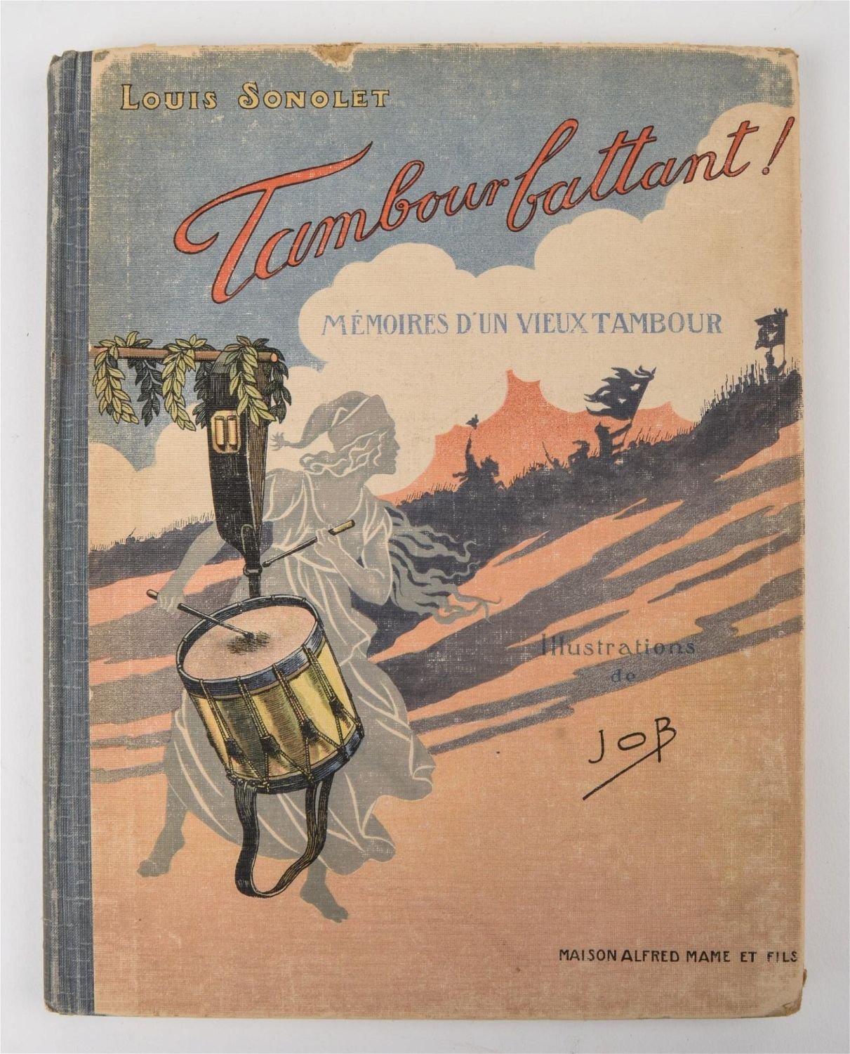[French Drummer Boys at War]. Tambour Battant! Memoires d’un Vieux Tambour (1792-1918). Paris : Mame, nd. [1922]. Numerous full-page plates and vignettes in full color, as well as BW illustrations, by the incomparable JOB"(Jacques-Marie Gaston Onfray de Breville), with text by Louis Sonolet. Octavo with colored pictorial cloth. Illustrated children’s book on the service of drummer boys in the French Army from the Revolution through World War I. Very good copy of a desirable and scarce work.