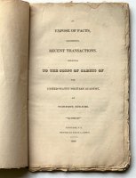 [WEST POINT]. An Expose of Facts, Concerning Recent Transactions, Relating to the Corps of Cadets of the United States Military Academy, at West-Point, New-York. Newburgh, NY: Printed by Uriah C. Lewis, 1819. 1st ed. vii,68pp. [bound with] RAGLAND, Thomas. Defence before a General Court-Martial, Held at West-Point, in the State of New-York, in the Month of May, Eighteen Hundred and Nineteen. [second title]: Memorial to Congress. Newburgh, NY: Printed by Uriah C. Lewis, 1819. 1st ed. 29; 9 pp. Orig. unprinted wrappers, sewn as issued. Very old water-staining along edges of upper margins and on the bottom corner of the final few leaves, otherwise near fine. Uncut leaves. Rare in the trade. Shaw and Shoemaker 47932, 49231, 48677 (this last should not be listed separately as The Memorial is conjugate with the Defence). Inscribed in ink on the front wrapper, "Honb: / T[homas]. Butler /Congress U.S. / Washington City" Thomas Butler (1785-1847) was a member of the U.S. House of Representatives from 1818 to 1821 representing the state of Louisiana. He served one and a half terms as a Democratic-Republican. Butler was born near Carlisle, Pennsylvania, studied law and was admitted to the bar in 1806 and commenced practice at Pittsburgh, Pa.; moved to Mississippi Territory about 1807; admitted to the bar there in 1808; captain of a Cavalry troop in the Mississippi Territory Militia in 1810; purchased land in the parish of Feliciana, Orleans Territory and settled there in 1811; appointed parish judge December 14, 1812; appointed judge of the third district by Governor Claiborne of Louisiana March 4, 1813; elected as a Republican to the Fifteenth Congress to fill the vacancy caused by the resignation of Thomas B. Robertson in 1818 and was re-elected the same year to the 16th Congress. A rare expose, printed by five former cadets accused of leading a revolt at the Academy. Rebelling against the Commandant of Cadets’ use of physical force, the five were placed under arrest and confined to quarters for twelve months, court-martialed, and subsequently reinstated. They resigned and petitioned President Monroe, Secretary of War Calhoun, and Congress for redress and to bring public attention to improprieties in the management of the U.S. Military Academy. Only 25 copies found in Worldcat.