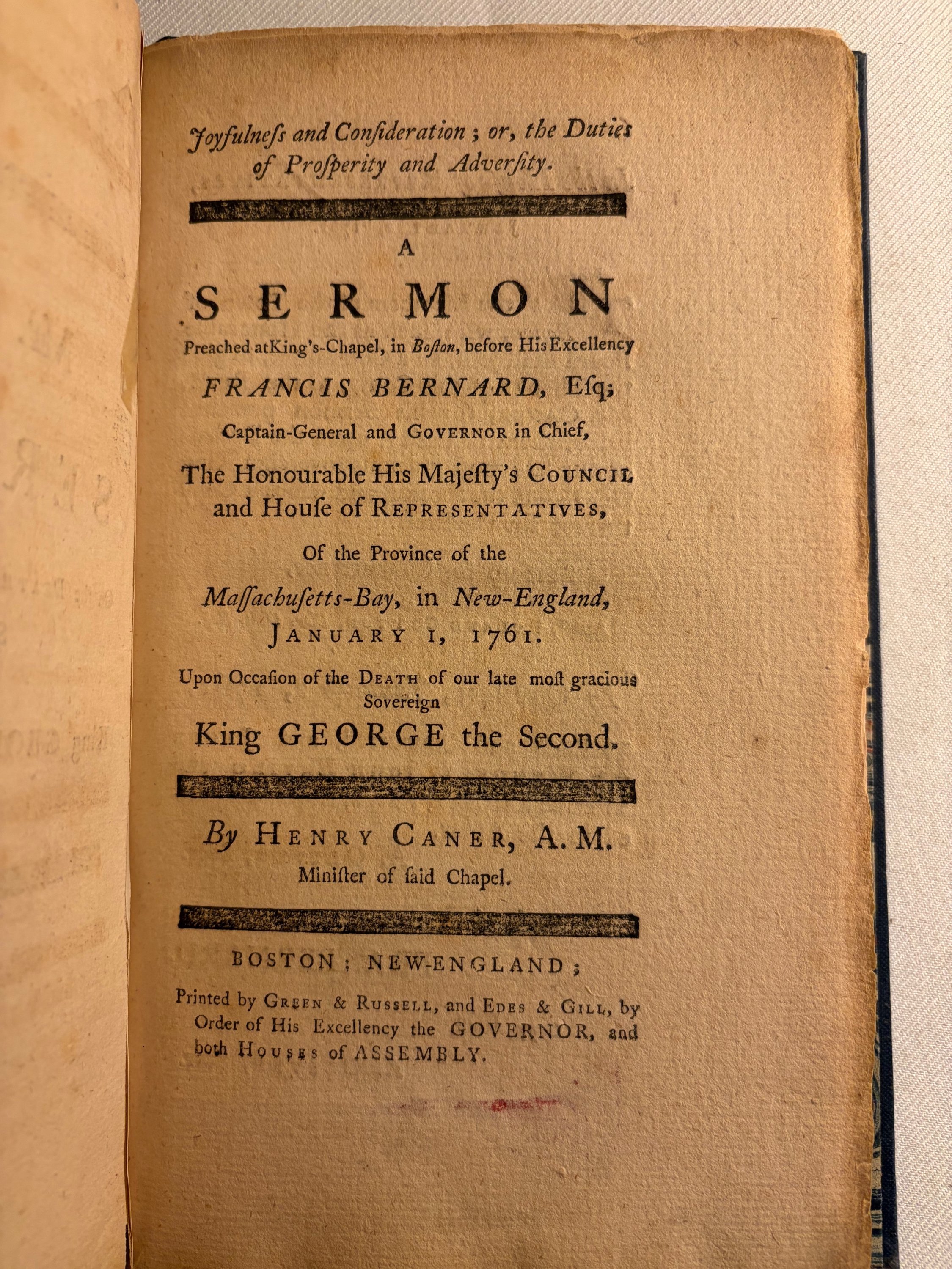 This is a 31 page sermon printed in Boston in 1761. It has been bound in blue boards with marbled papers inside. It does have the half-title.