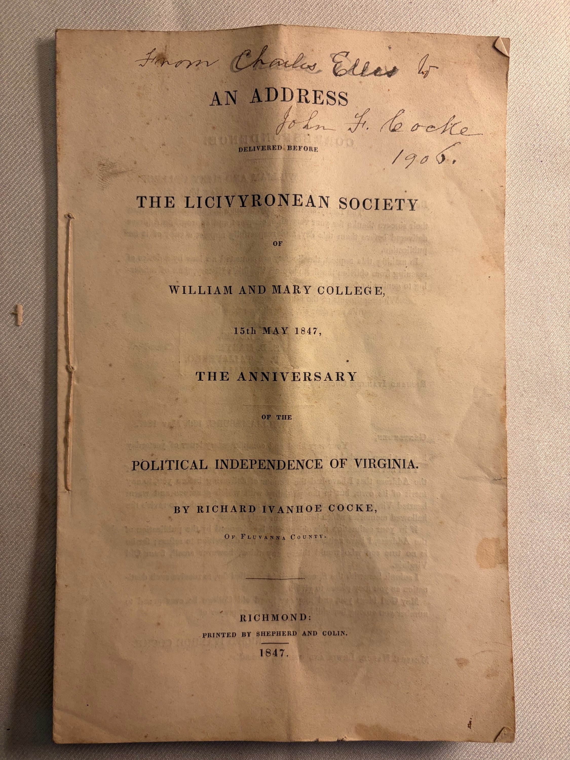 This speech delivered at the College of William and Mary celebrated the 71st anniversary of Virginia's declaration of independence from England. A convention was assembled in Williamsburg, Va on the 6th of May in 1776 and Edmund Pendleton was elected president. "But it was on the 15th of May 1776, that by a resolution unanimously adopted, the first decisive, great, irrevocable step was taken, which placed Virginia beyond the Rubicon, and pledged her to the maintenance of her independence then asserted, whether sustained or abandoned by the rest of the colonies, and in defiance of a power before which all Europe trembled." On the title page is inscribed "From Charles Ellis to John F. Cocke 1906". OCLC only records 8 holders.