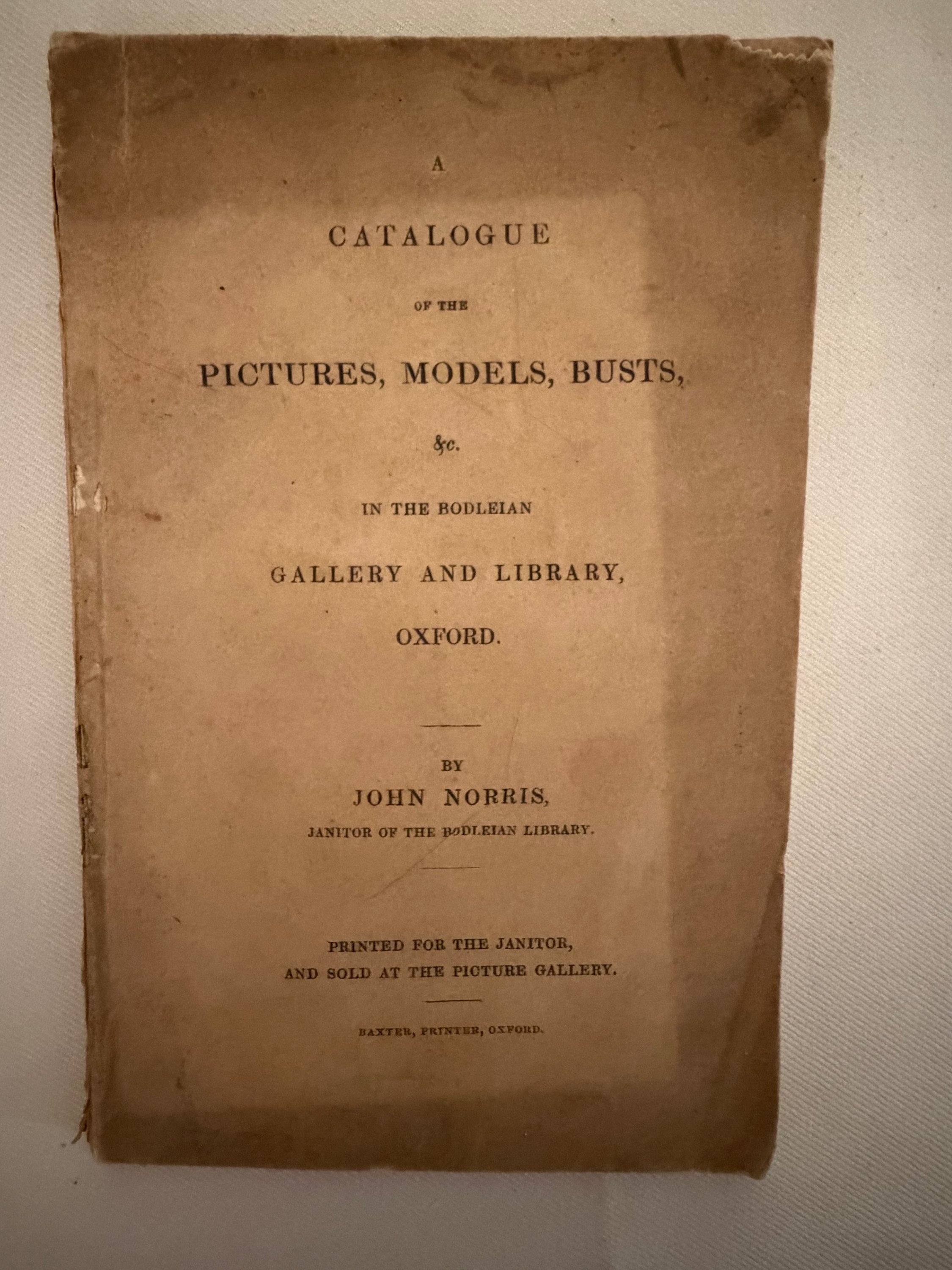 The Janitor of the Bodleian Library in Oxford, England prepared this publication. It was printed for him and was offered for sale at the Picture Gallery. It contains the detailed descriptions of all the art work exhibited in the gallery. The cover is soiled.