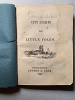This is a charming travel book for the younger crowd. It is centered on New York but Boston and Philadelphia are also represented. It is filled with illustrations. It covers professions and places of interest such as Bunker Hill and Independence Hall. This copy has a faded cover both front and back.