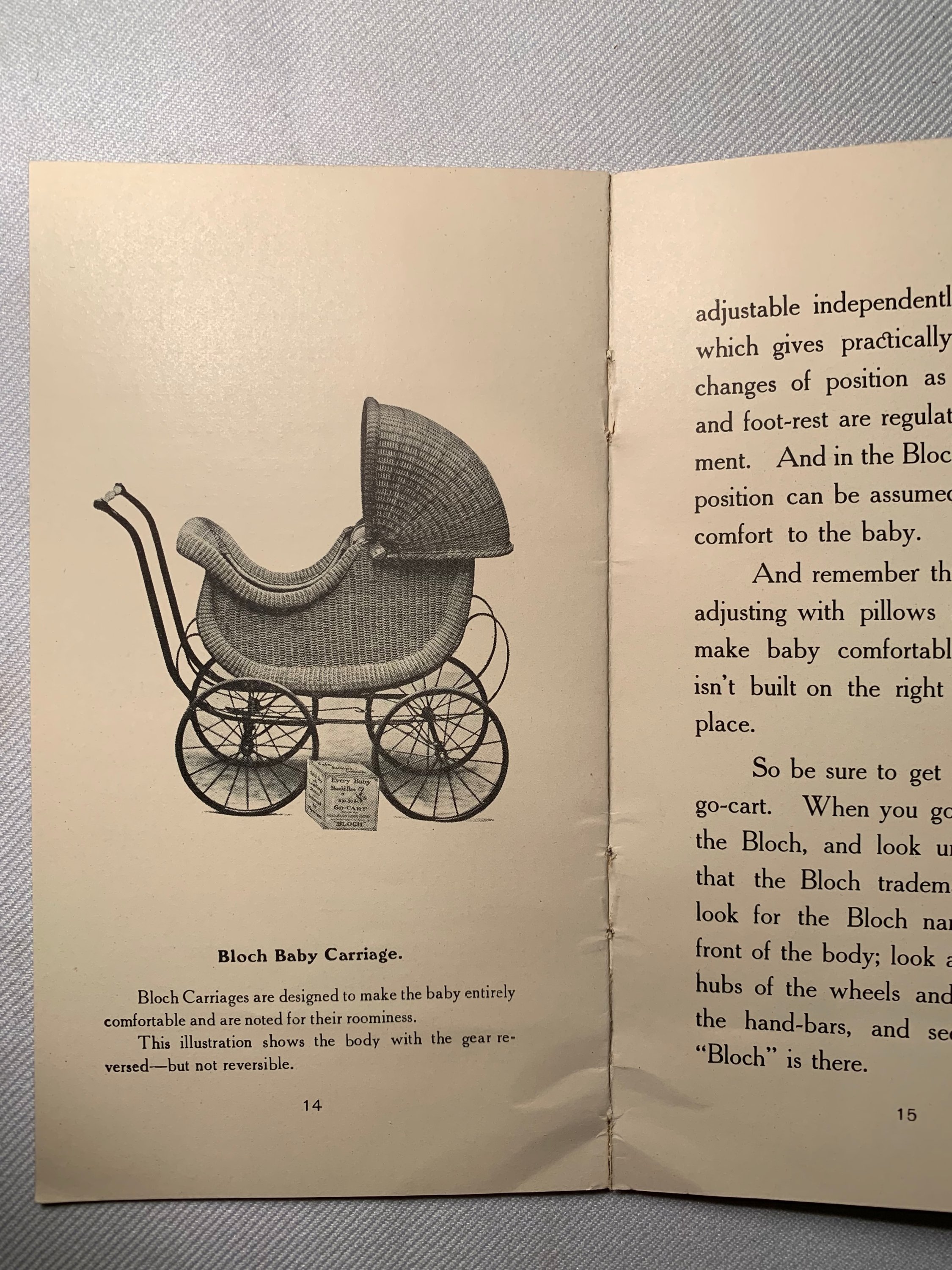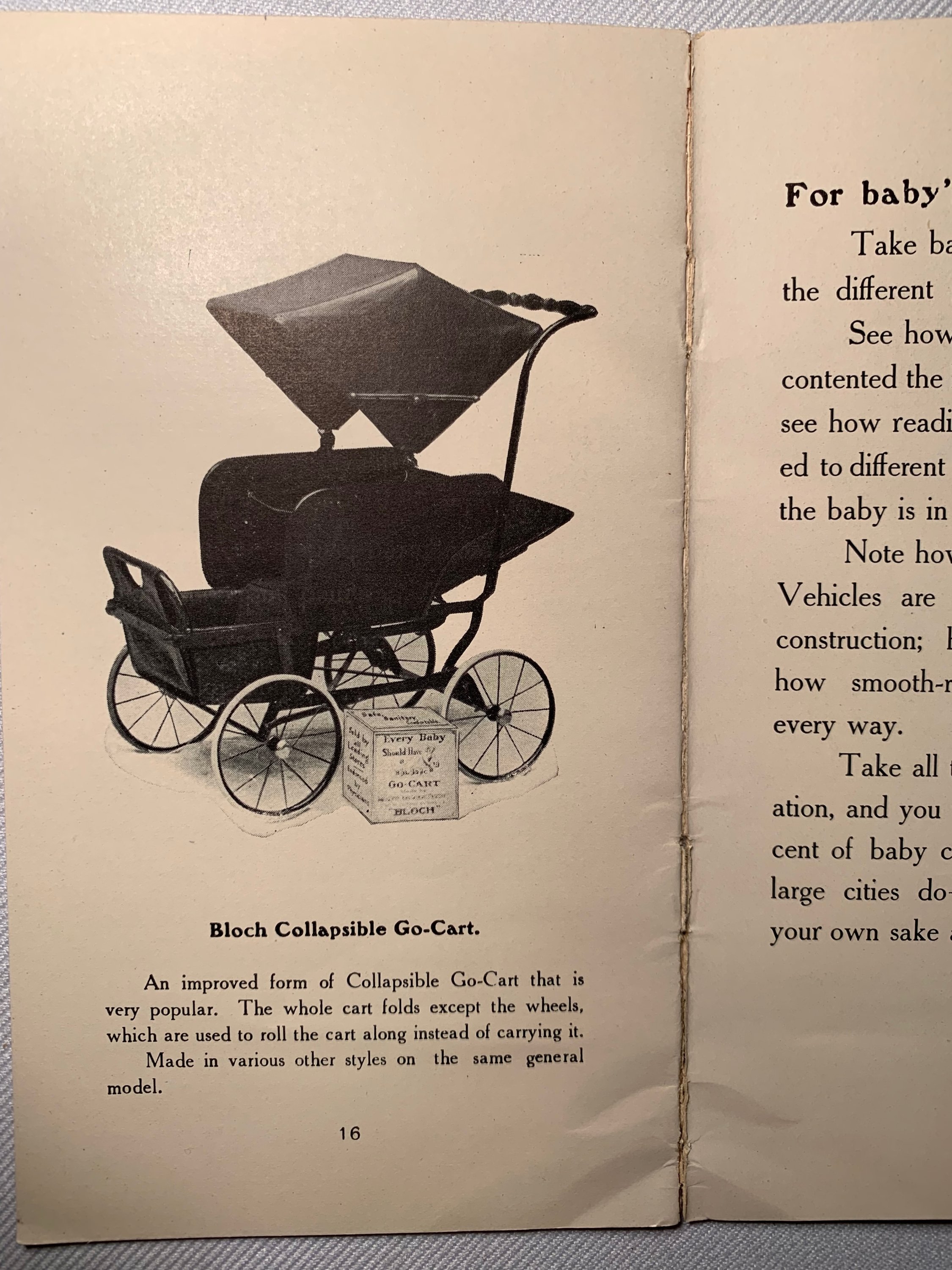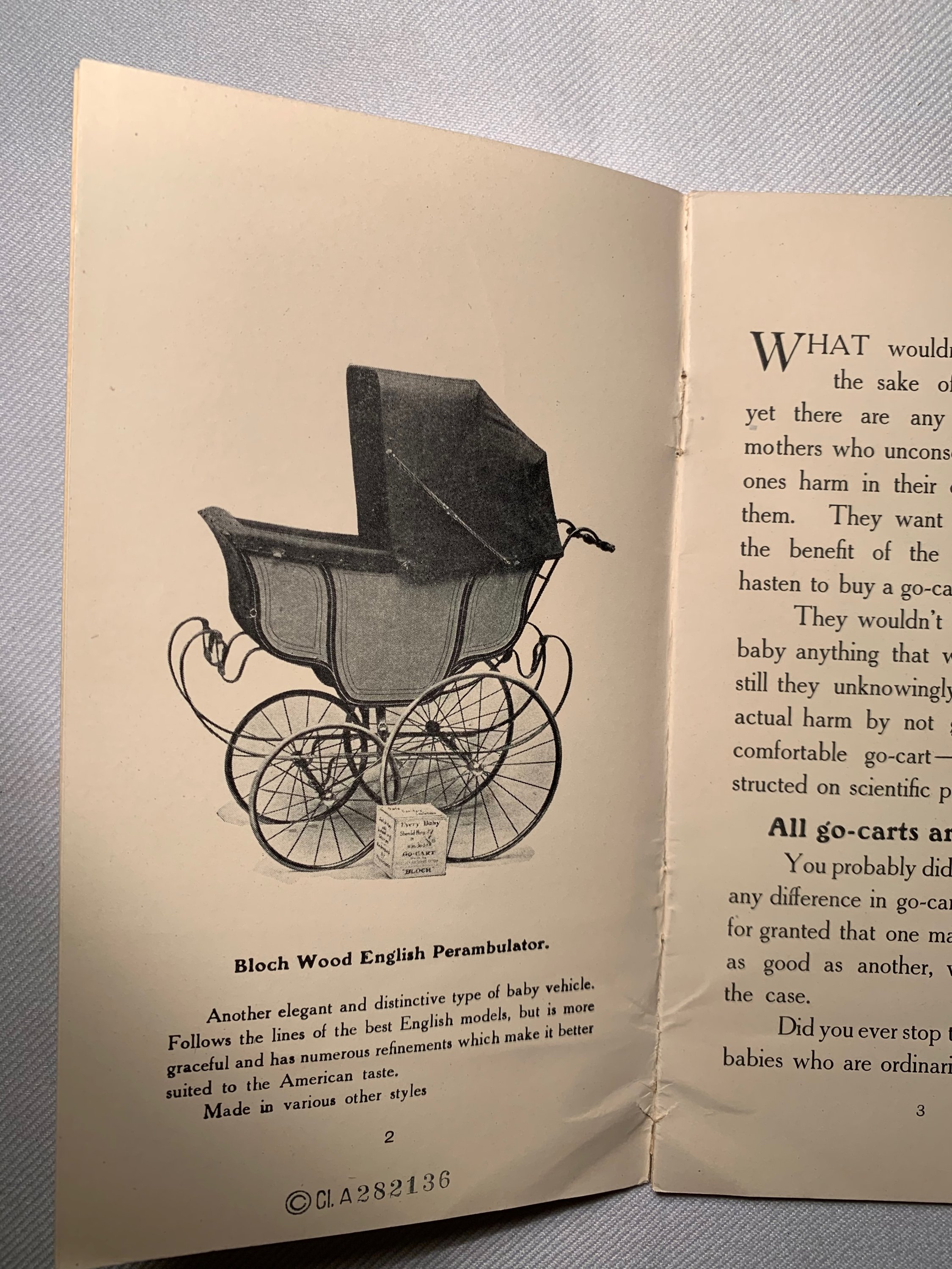 This is an 18 page catalog from the Bloch Go-Cart Company of Philadelphia illustrating the various baby carriages the offer. This copy was submitted to the Library of Congress for copyright and then discarded.