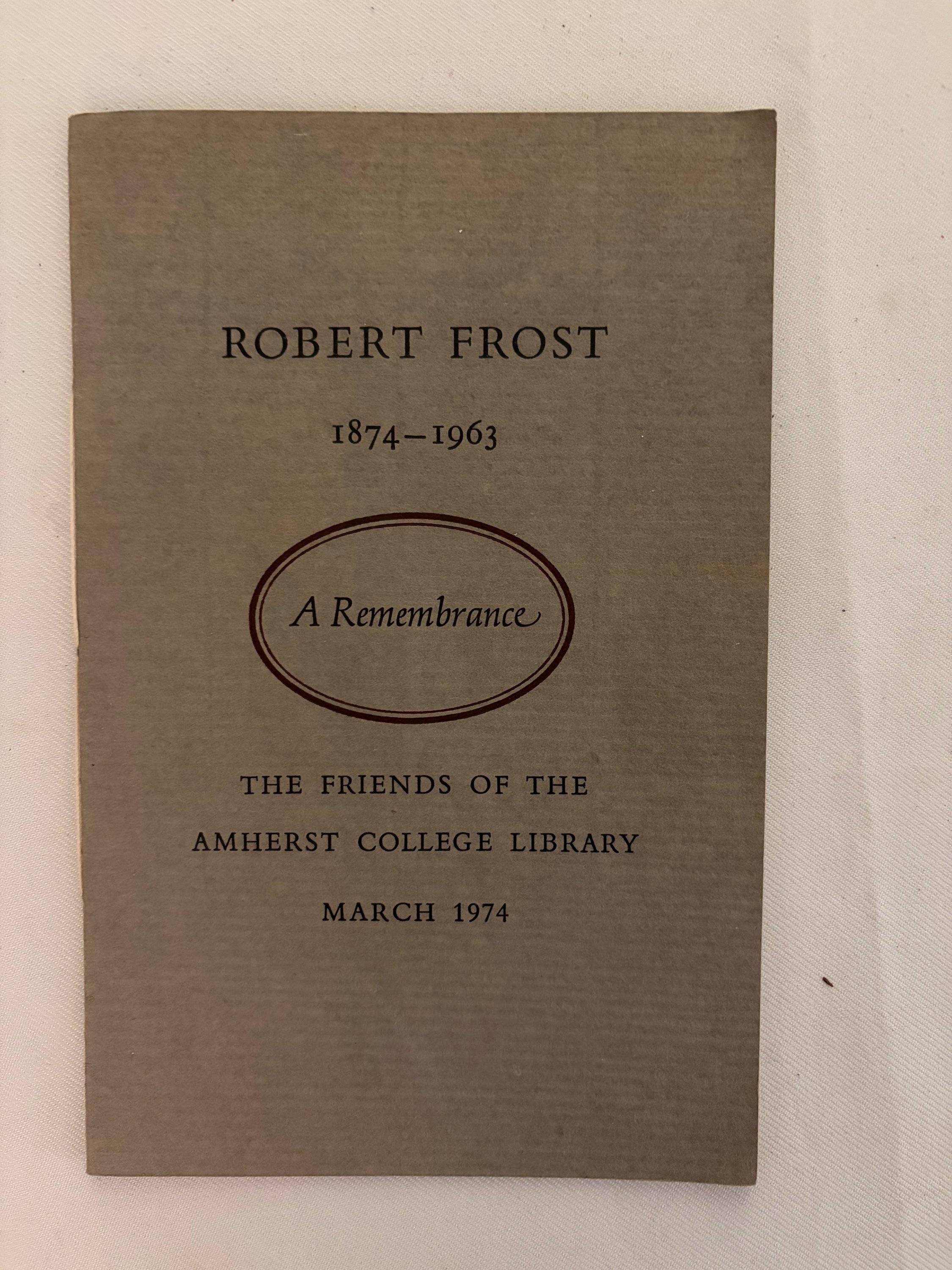 This is a keepsake for the Friends of the Amherst College Library from an exhibit of Robert Frost's works in print and in manuscript celebrating the 100th year of his birth. Here is a facsimile of a poem "Fragment Writing in England in 1914,13" and signed to Katharine Cowles . This was a limited edition of 500 copies printed at Stinehour Press, Lunenburg, Vermont, the facsimile of Frost's poem reproduced at The Meriden Gravure Company....Typography by Joseph Blumenthal