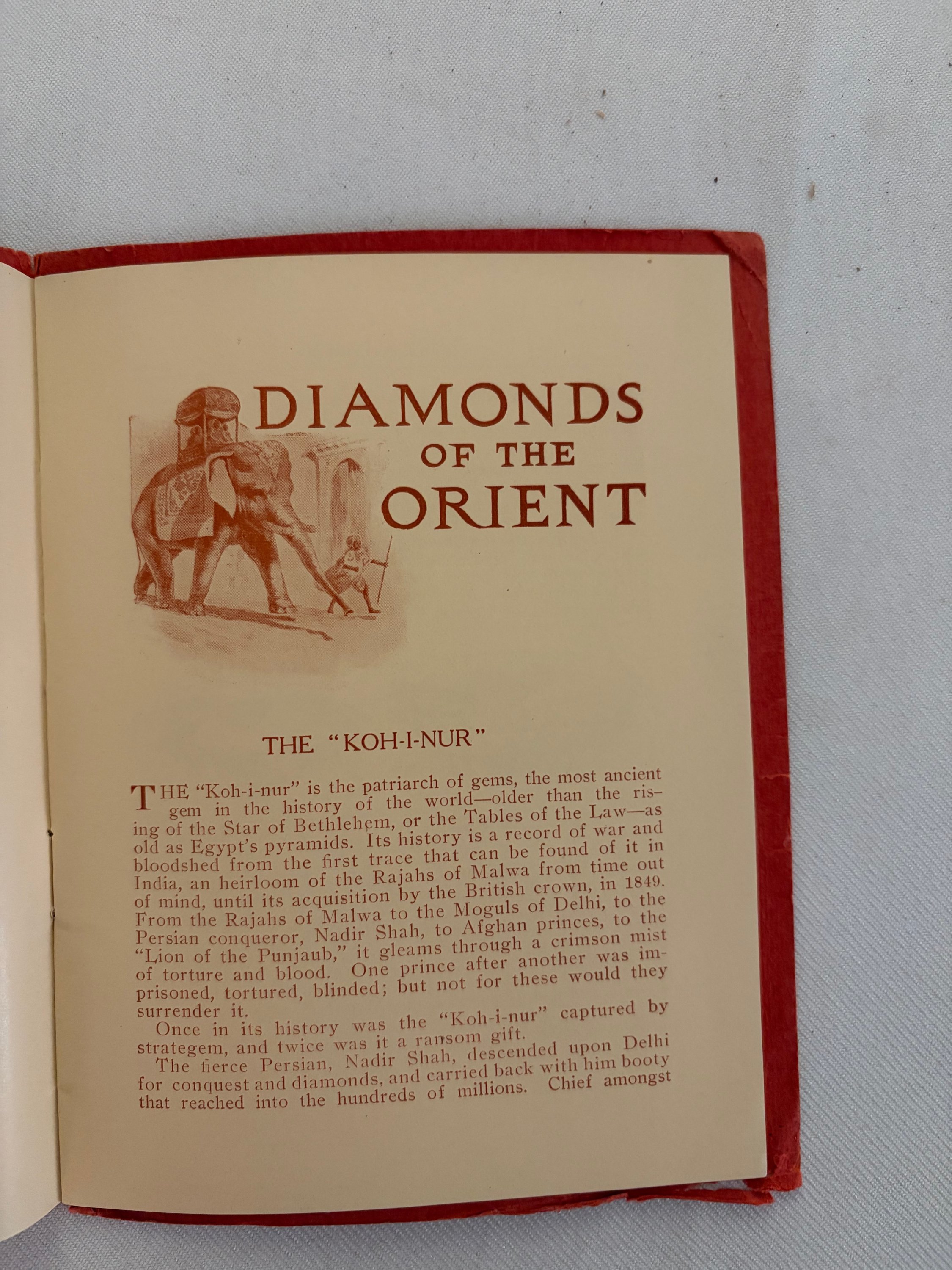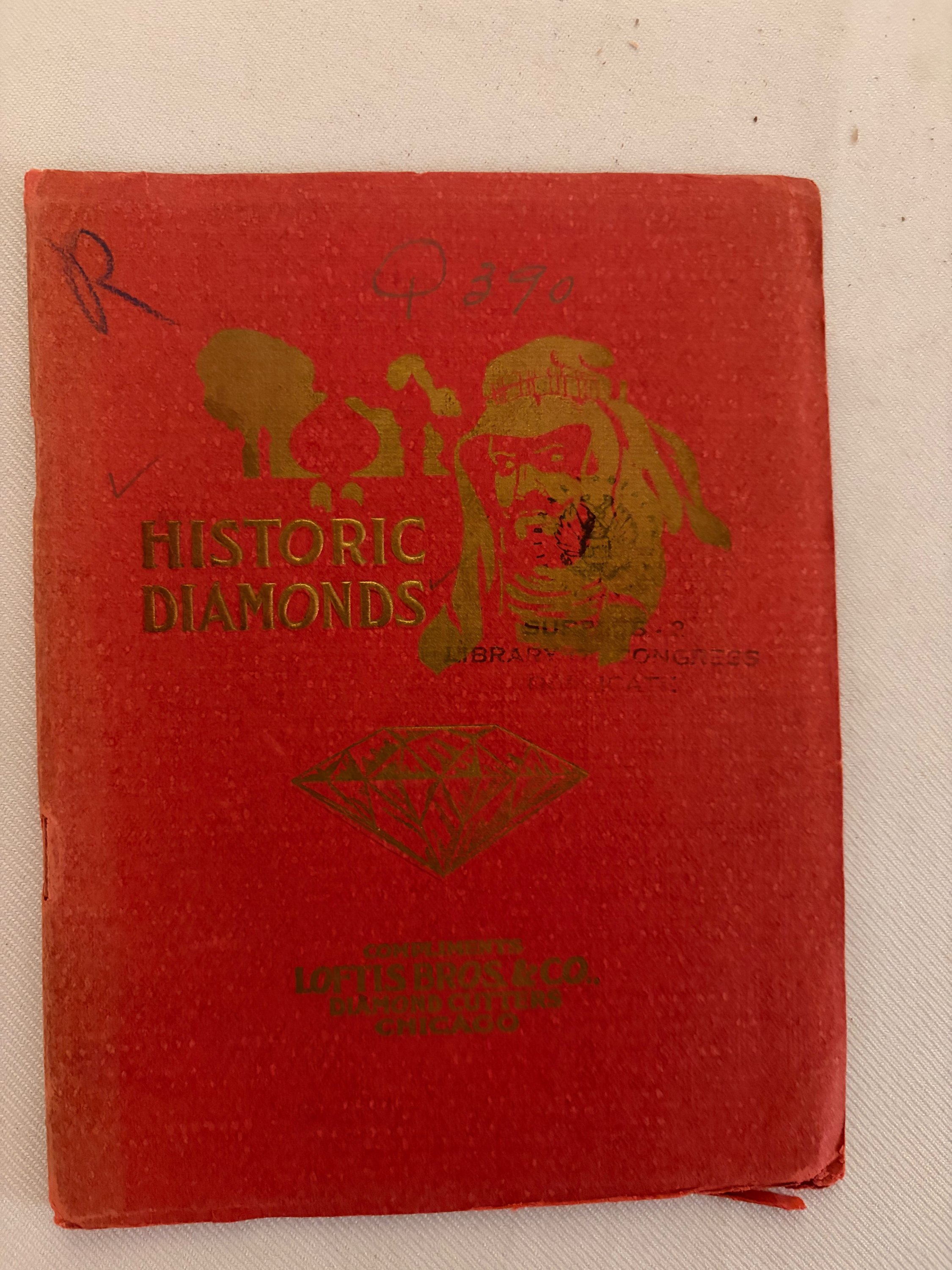 This is a 40 page history of famous diamonds discovered in South Africa and the Orient. This is a catalog as well produced by Loftis Brothers and Company, Diamond Cutters, Watchmakers and Jewelers in Chicago. This copy was submitted to the Library of Congress for copyright and then discarded.