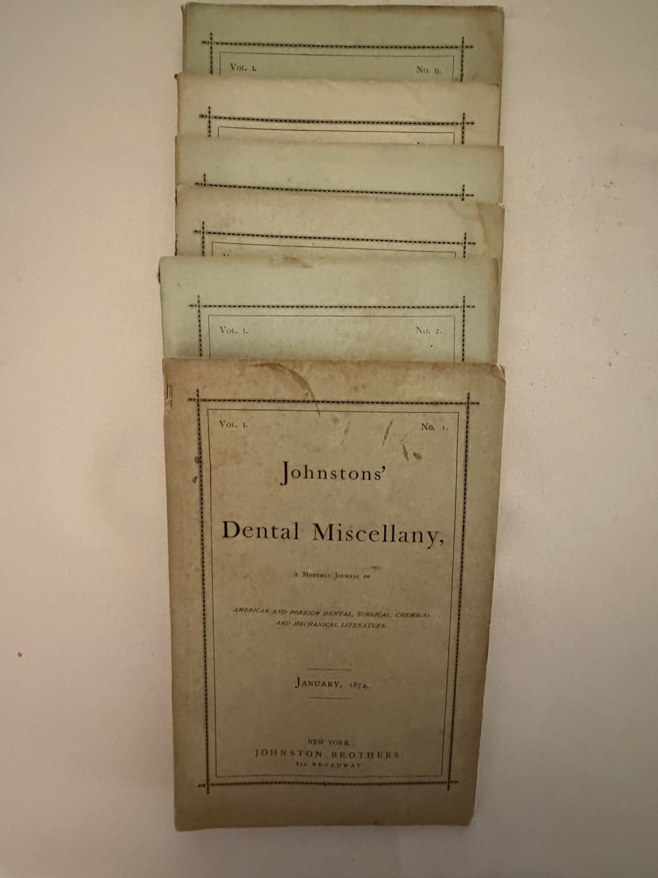This magazine is directed to dentists. There are numerous illustrations of equipment such as a surgeon's case, tools used in dentistry, various tooth pastes etc. There are 6 issues and include, volume 1 (1874)# 's 1,2,3,4,7 and 9.