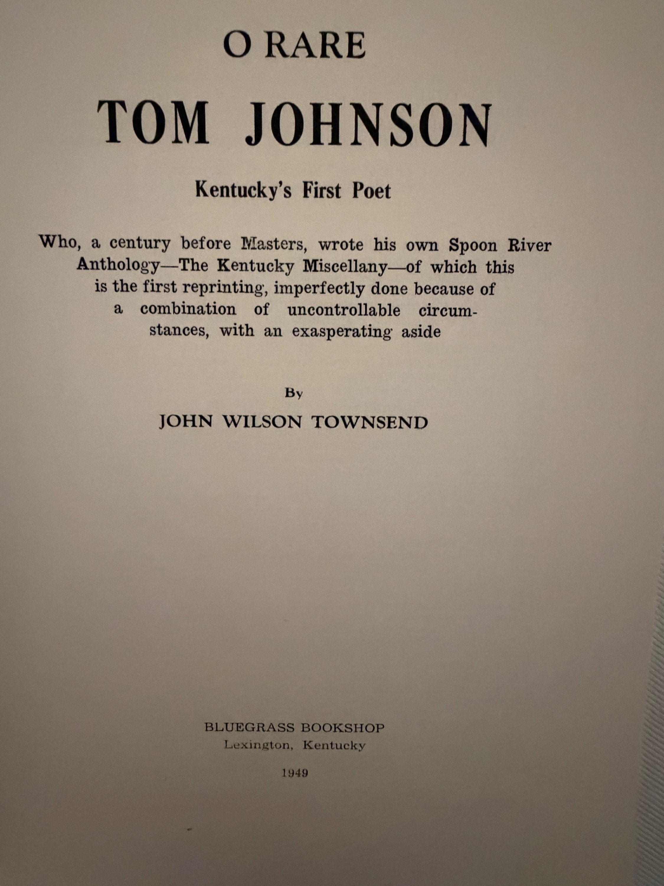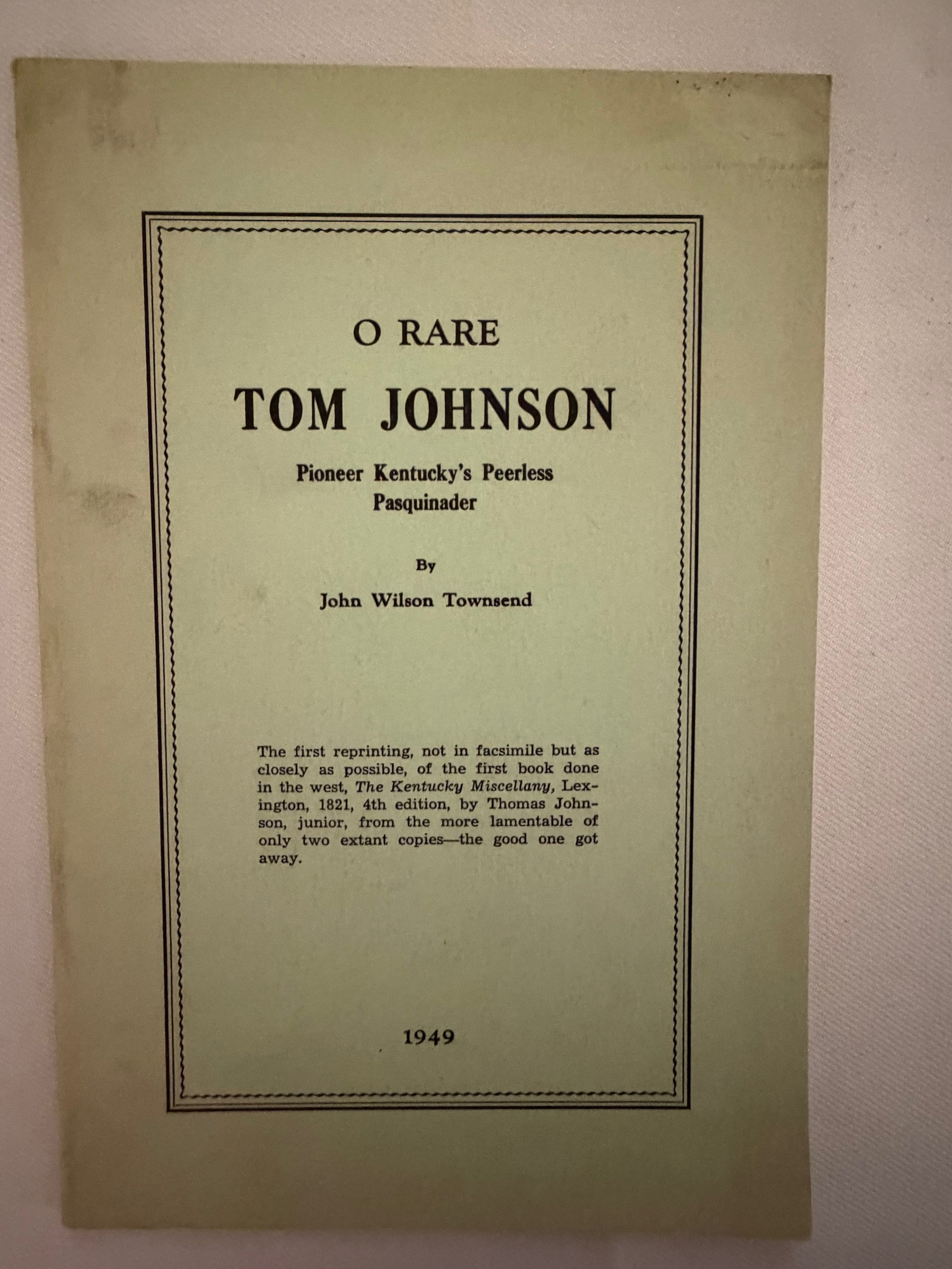 The first edition of Tom Johnson's Kentucky Miscellany was published in 1789. "That first edition was not only the first volume of Kentucky verse, but the first book both printed and published in the about-to-be-admitted state. This reprint was from the 1821 edition.