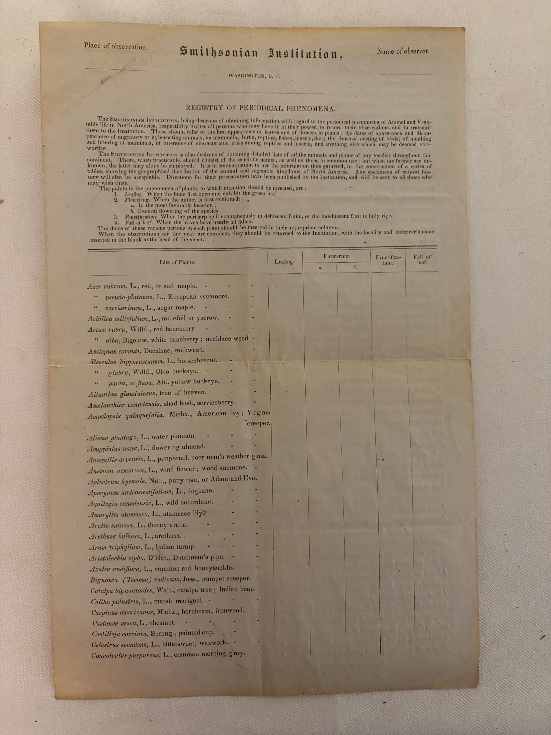 This is a 4 page printed Circular created by the Smithsonian Institution to monitor sightings of various plants and animals. The summary description from the S. I. reads as follows " Meteorological observers receive a circular requesting information regarding seasonal phenomena of plants and animals and general phenomena of climate. They are also invited to submit natural history specimens to the Smithsonian. The information gathered is intended to be used to derive general laws relating to the geographical distribution of species of animals and plants in North America." This circular has not been filled out.