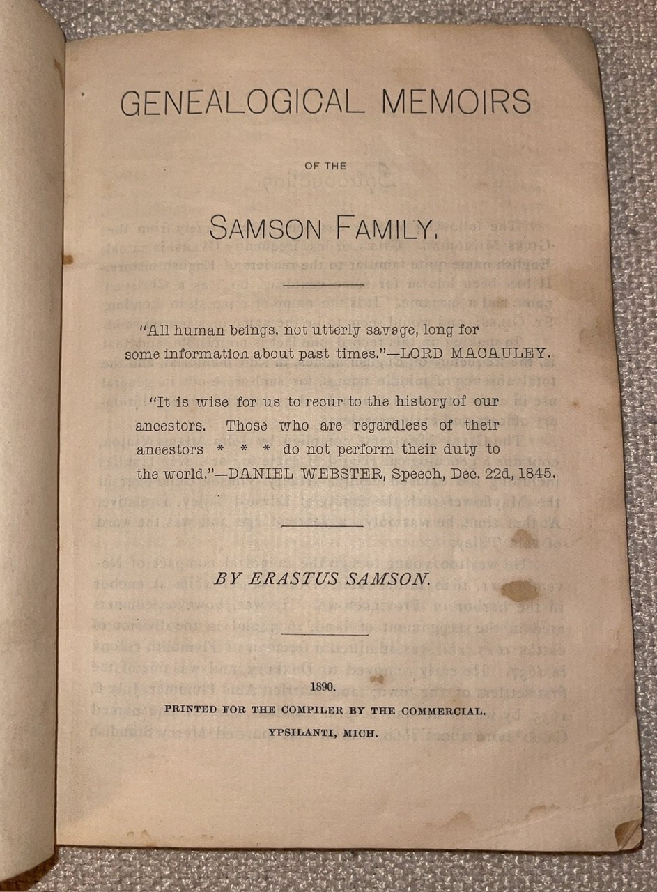 Samson, Erastus. Genealogical Memoirs Of The Samson Family. Ypsilanti, Mich. : Printed for the Compiler by the Commercial, 1890. First Edition. sm. 12mo., 18pp.. Original plain wrappers. Softcover. Good Lightly stained on the wrapper and first few leaves, spine chipped. A good copy of a scarce genealogy.
