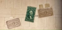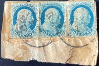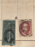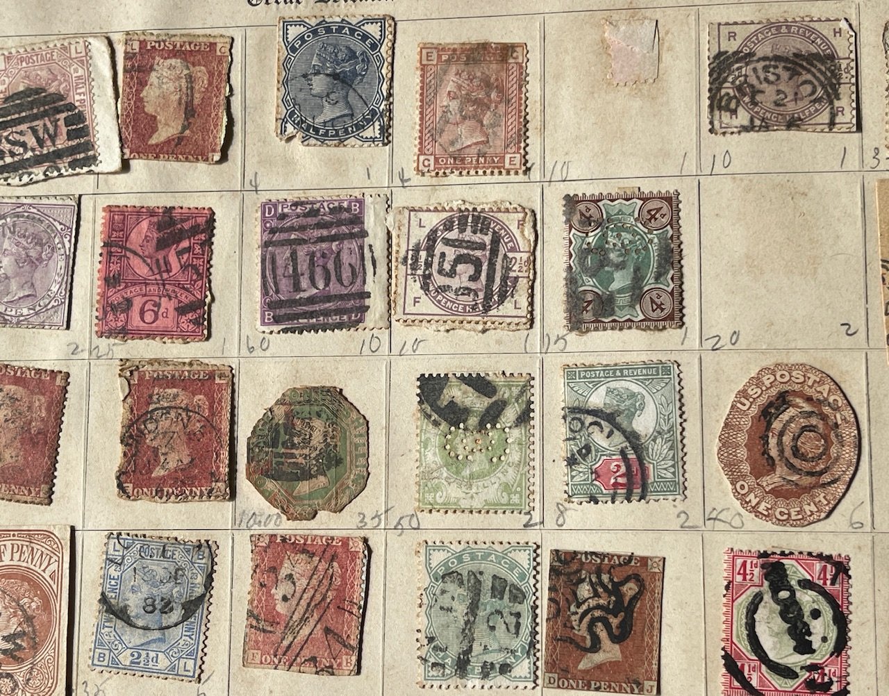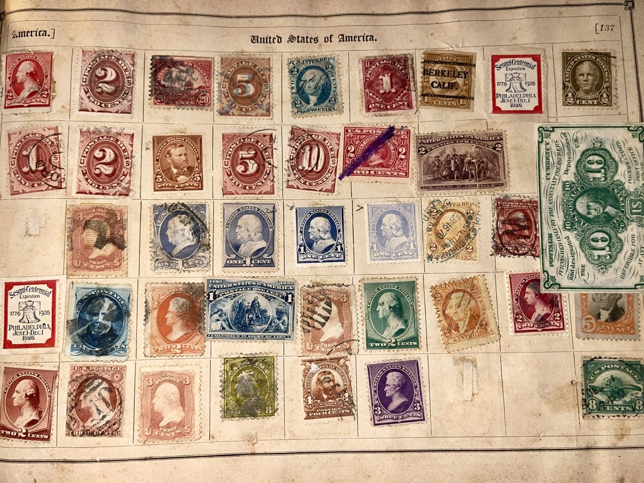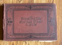Worldwide Stamp Album, ca. 1890–1895, with added material. Cosmopolitan Postage Stamp Album (London & New York: The Philatelic Publishing Co.). Brown cloth, worn, many leaves & stamps loose, obvious gap. A substantial late-Victorian worldwide collection anchored by 19th-century U.S. issues (1850s–1890s)—including a 90¢ Bank Note, Civil War revenues, postal stationery cut squares, and strong cancel variety—together with Great Britain, German States, China, Hong Kong, and Japan (early Coiling Dragons and Junk types). United States, 1851 One-Cent Franklin (Scott #7) imperforate strip of 3 tied to paper fragment by circular cancels. Etc. Unsophisticated & unresearched.
