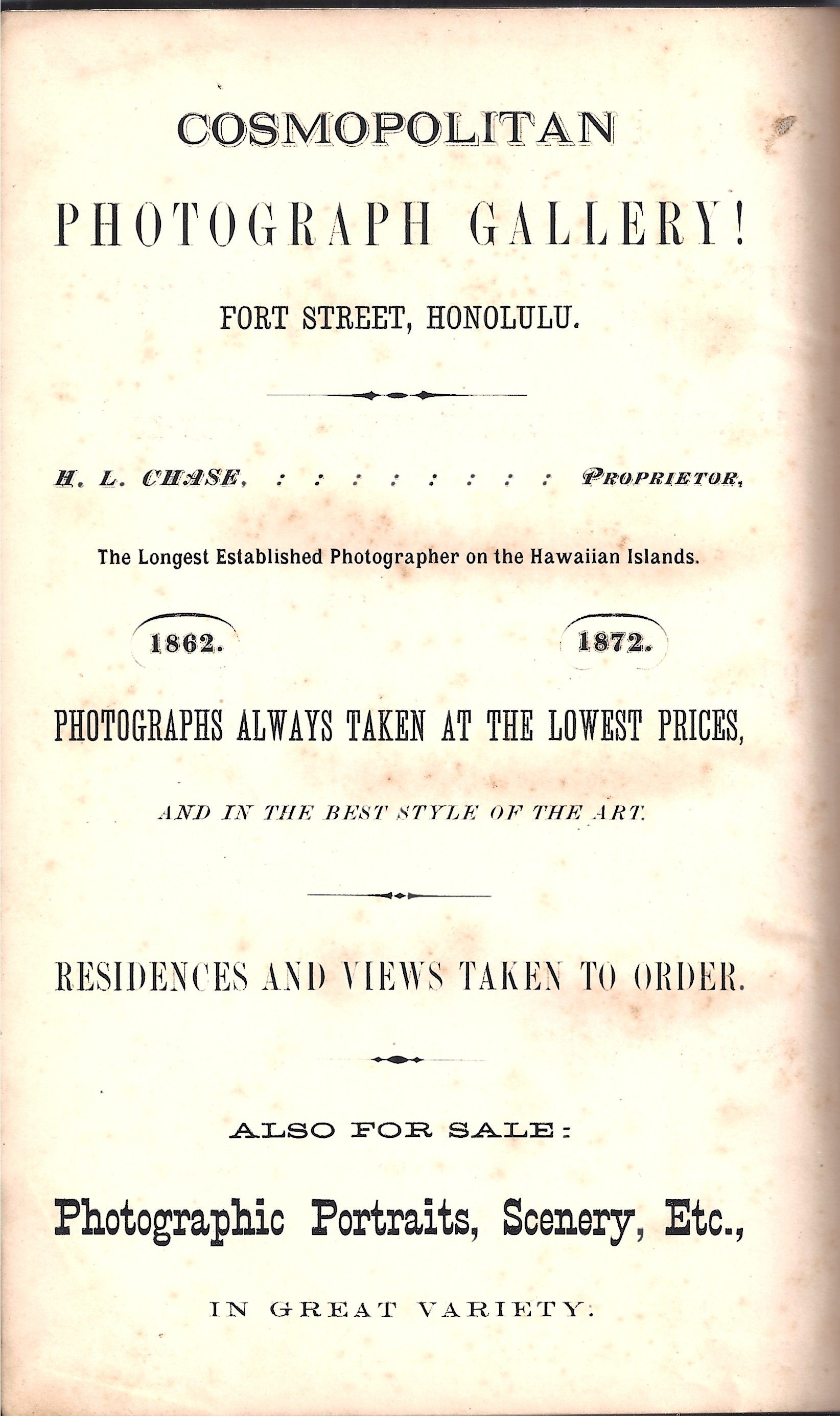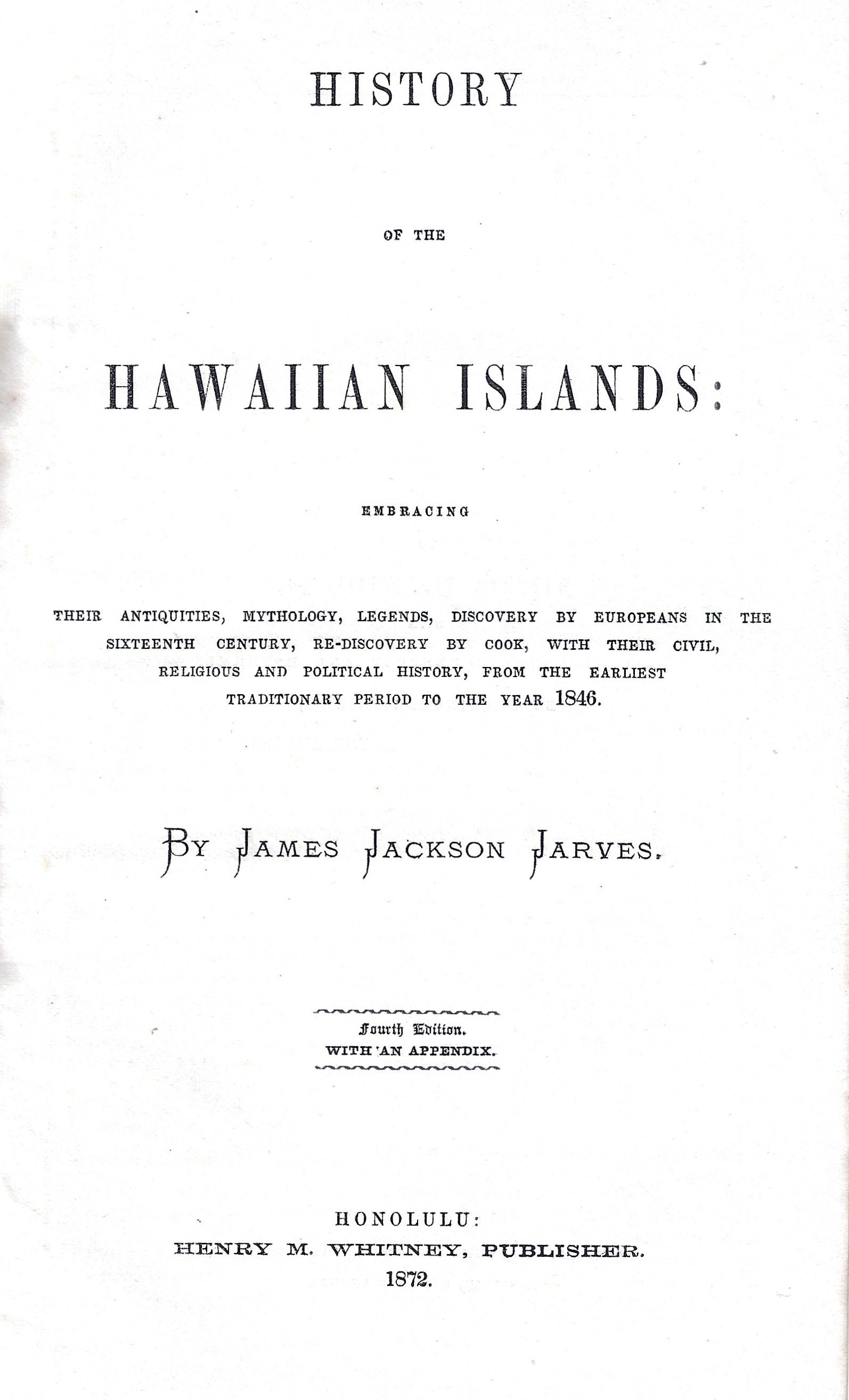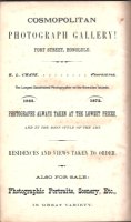 4th edition. 1872. Frontispiece original albumen photograph of Kamehameha 242pp. +20pp. advertising including Cosmopolitan Photograph Gallery and Henry M. Whitney publisher and seller of Hawaiian books.