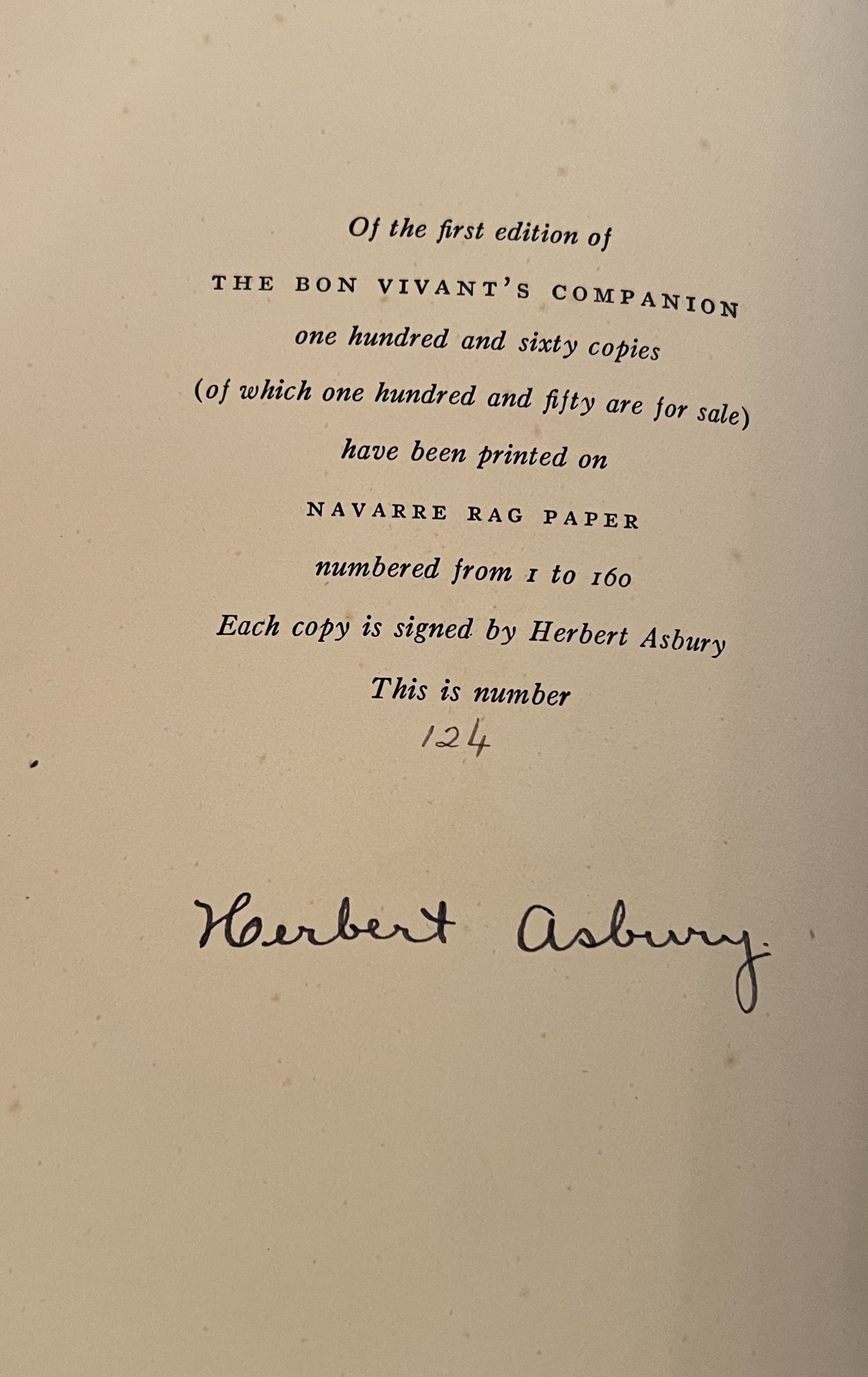 169pp. 160 copies numbered and signed. #124. This is a highly sought after mixology classic. Rubbing to the edges of the paper-covered boards. Spine slightly dulled. A very sound volume with deckled-edge rag paper. Very good+.
