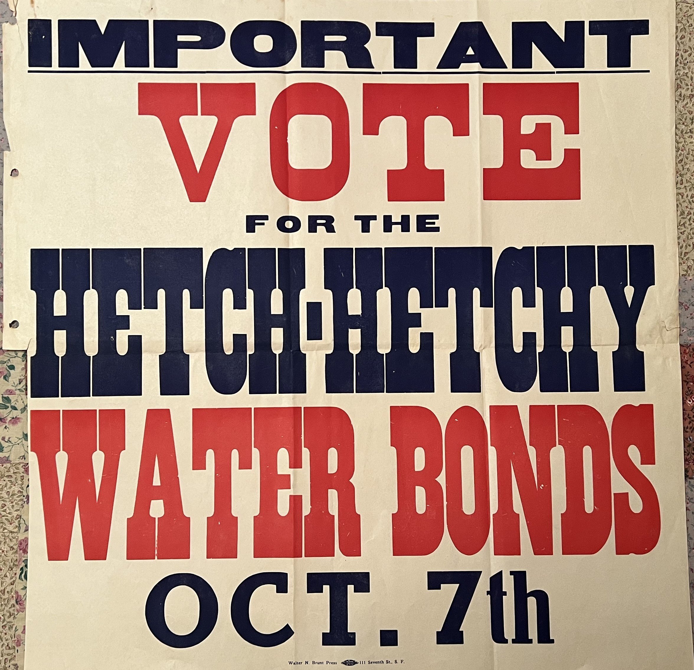 On December 19, 1913, following six years of heated debates, President Wilson signed into law the Raker Act, giving San Francisco full rights to flood Hetch-Hetchy Valley to transport fresh water to San Francisco. Following the completion of the damn in 1923 San Francisco began a campaign to issue Water Bonds in order facilitate the building of the pipeline that would transport the water to its its cisterns and customer's. This poster was likely posted in and on public transportation such as streetcars and ferry boats as well as their terminals.
