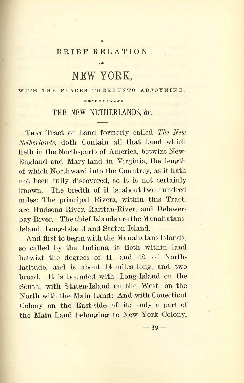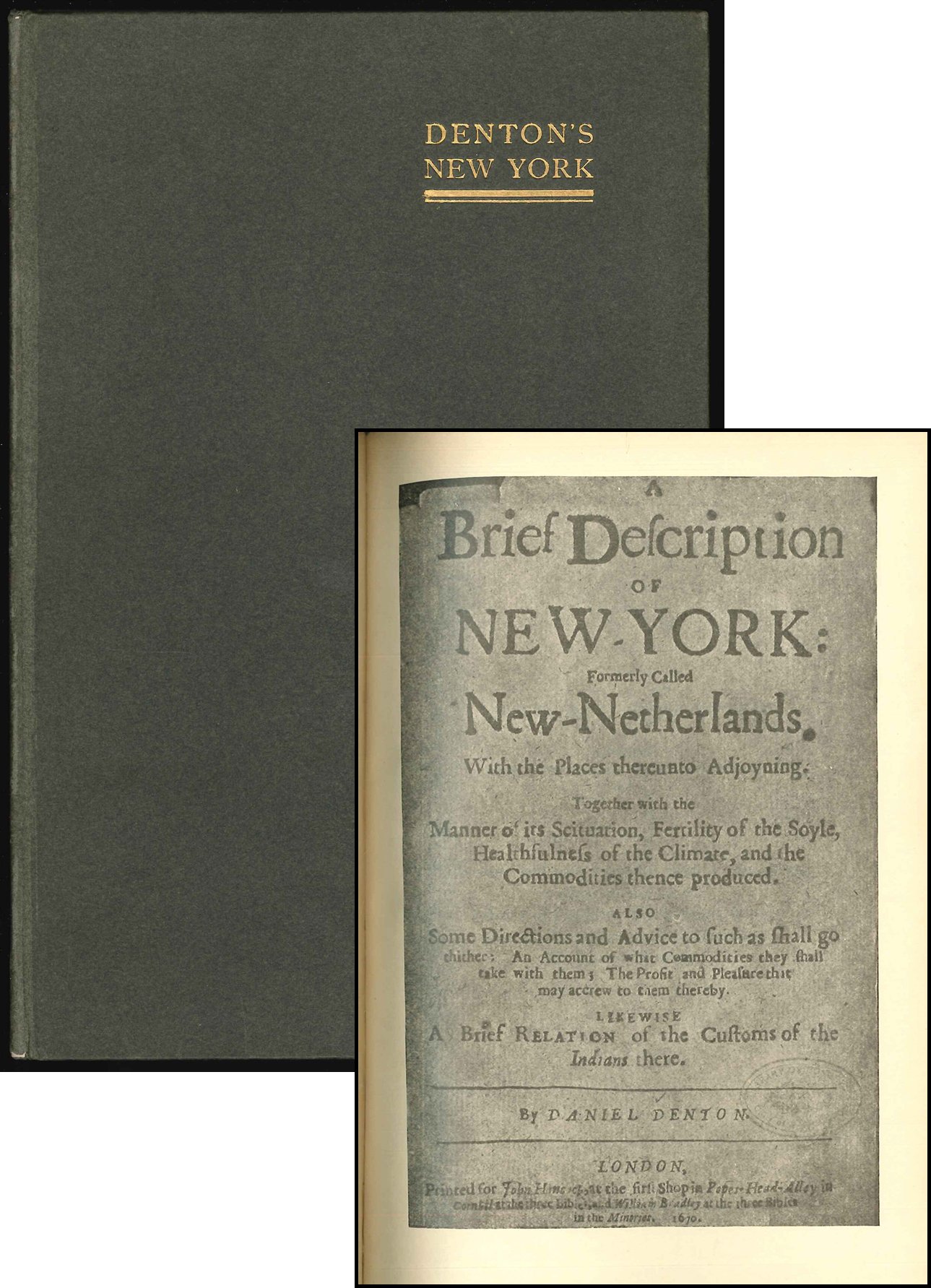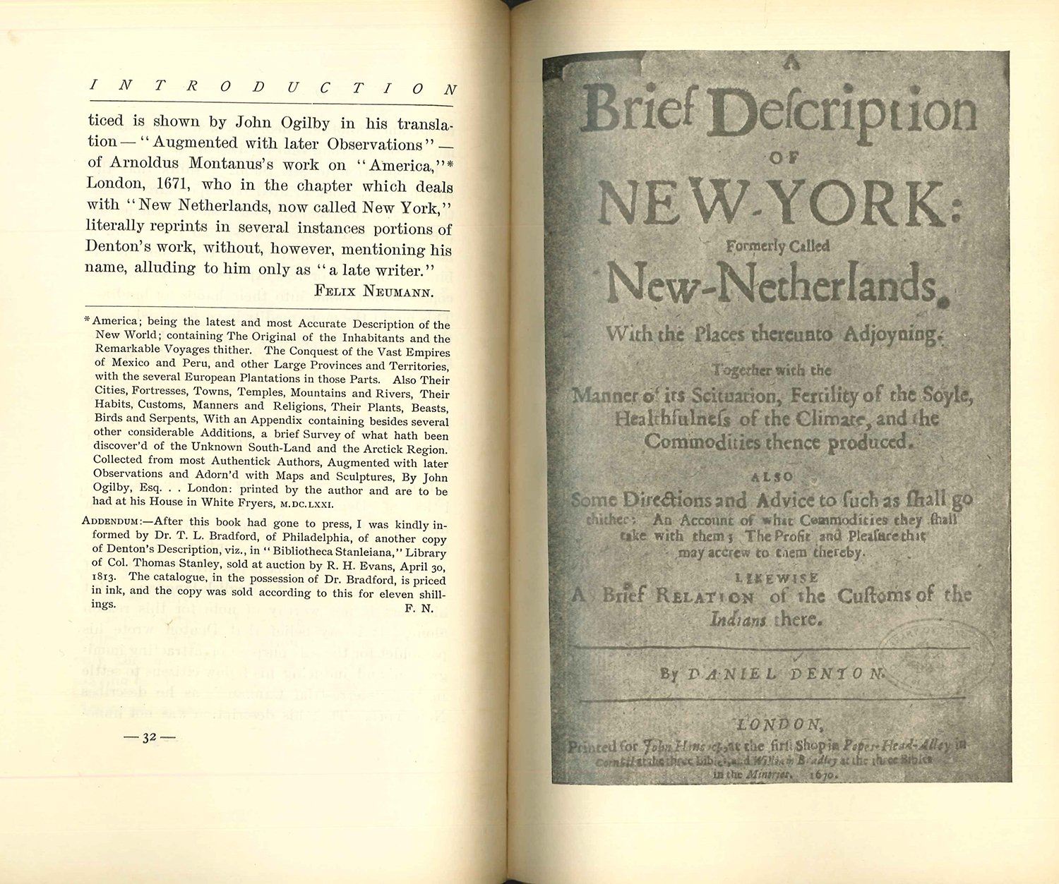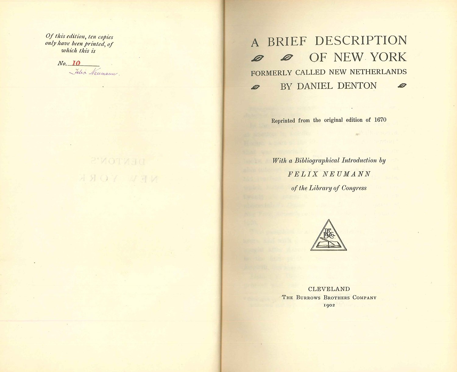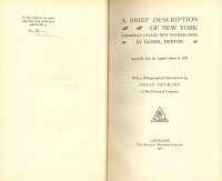Limited to 10 numbered copies, signed by the editor on front free endpaper. Reprint from the original edition of 1670, in the Library of Congress. Bibliographical introduction and notes in text by Felix Neumann. Includes a facsimile of the title of the original edition. The first book about New York in English. Unopened. Edges of text slightly tanned.