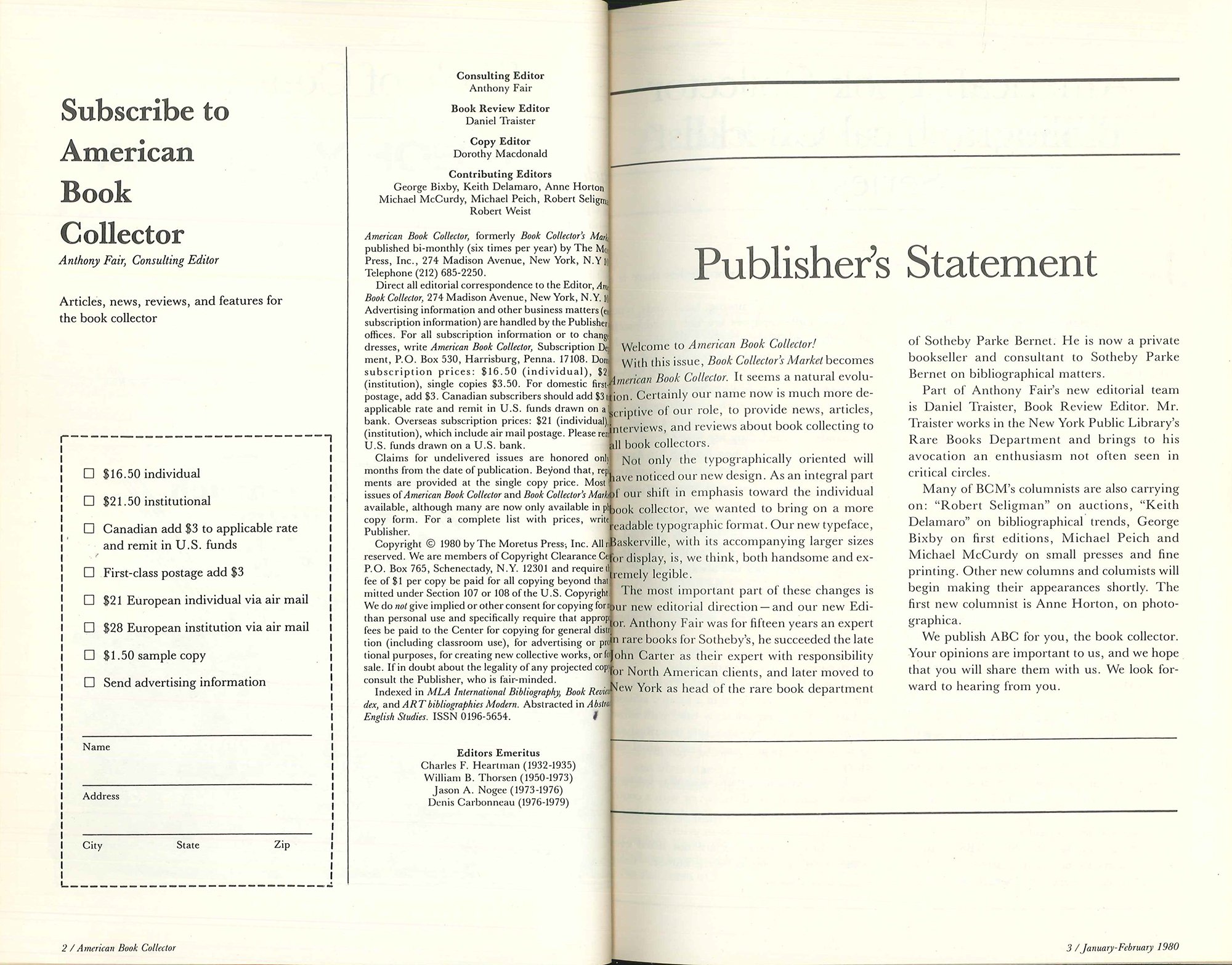 Being Volume 1, no.1 to Volume 8, no.6, a total of 54 issues. Exlibrary with markings. Else a fine set. Filled with information of interest to those who collect books and sell books. With various articles on binding (See S-K).