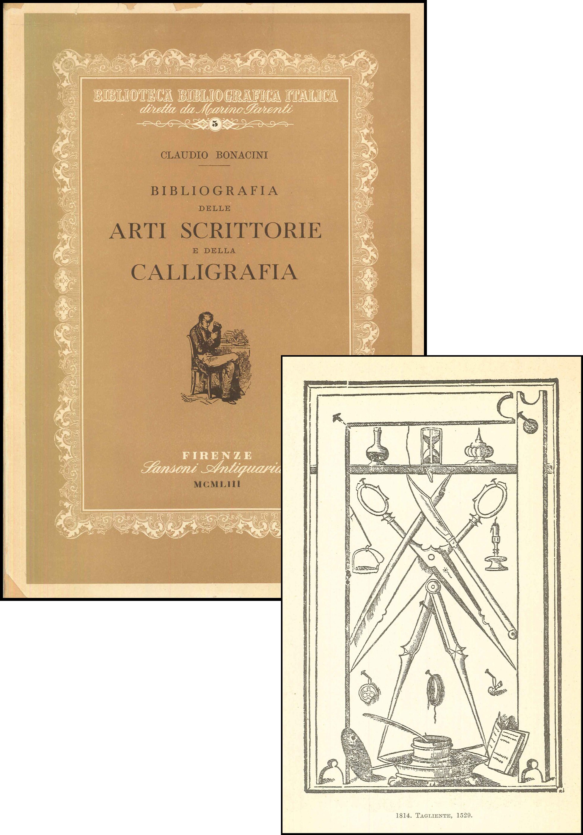 First edition, limited to 666 numbered copies. Never reprinted. Covers and spine chipped along the edges with a few tears, otherwise internally fine condition. Bibliography of calligraphy books in all languages. Notes are in Italian. Essential reference book on the subject.
