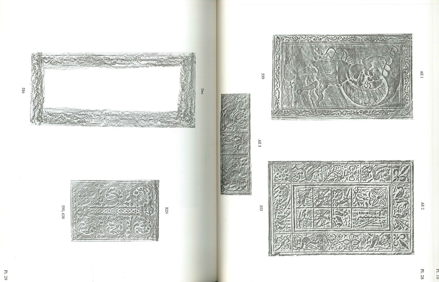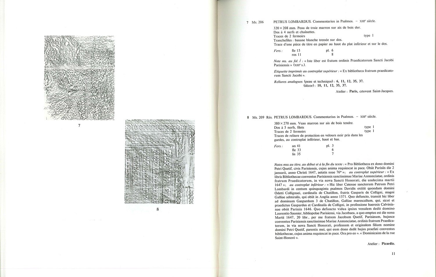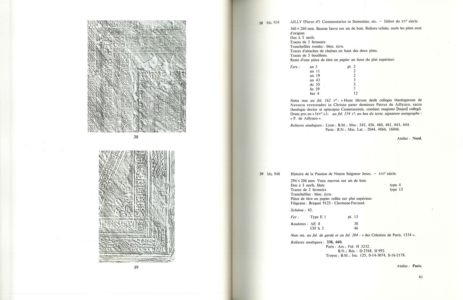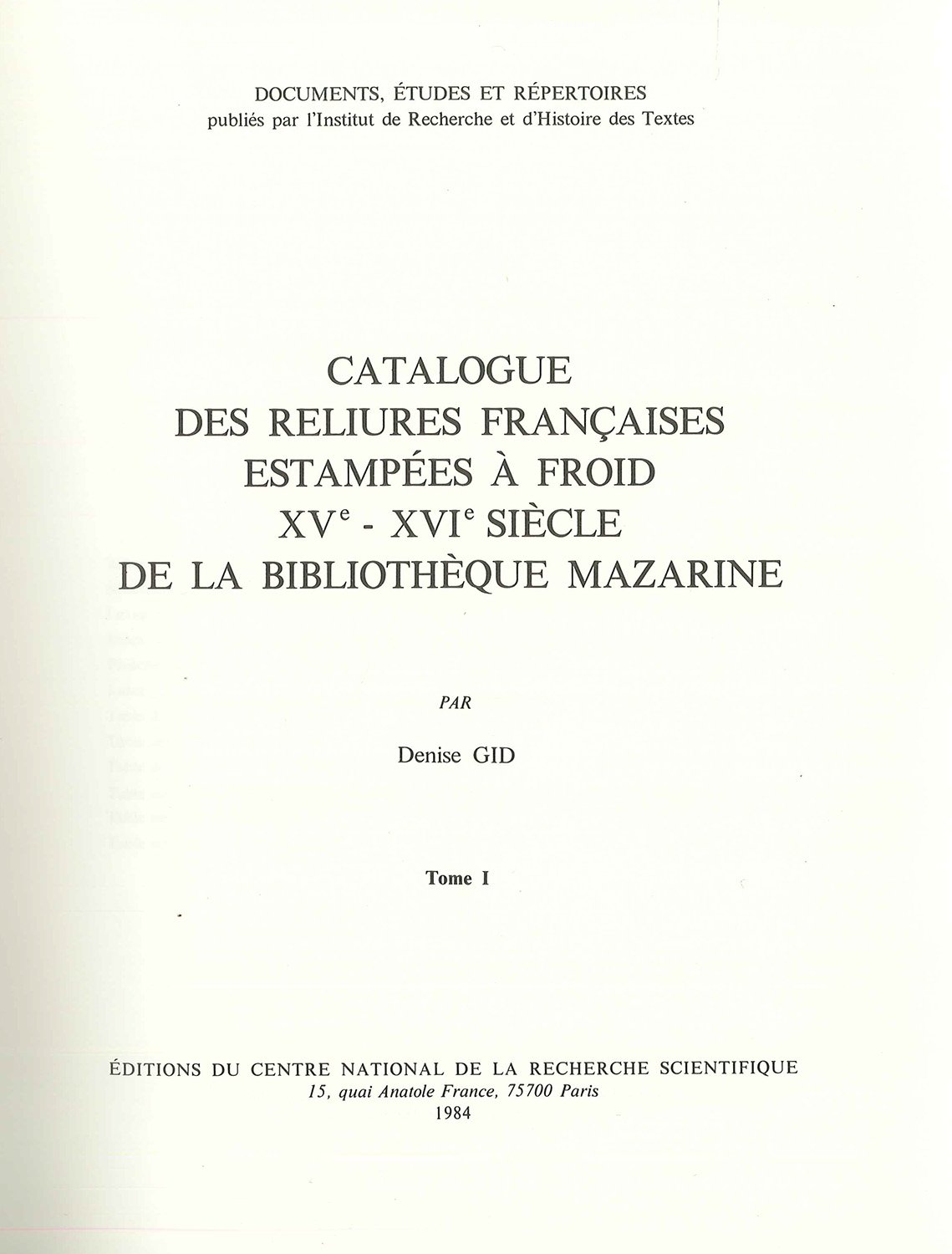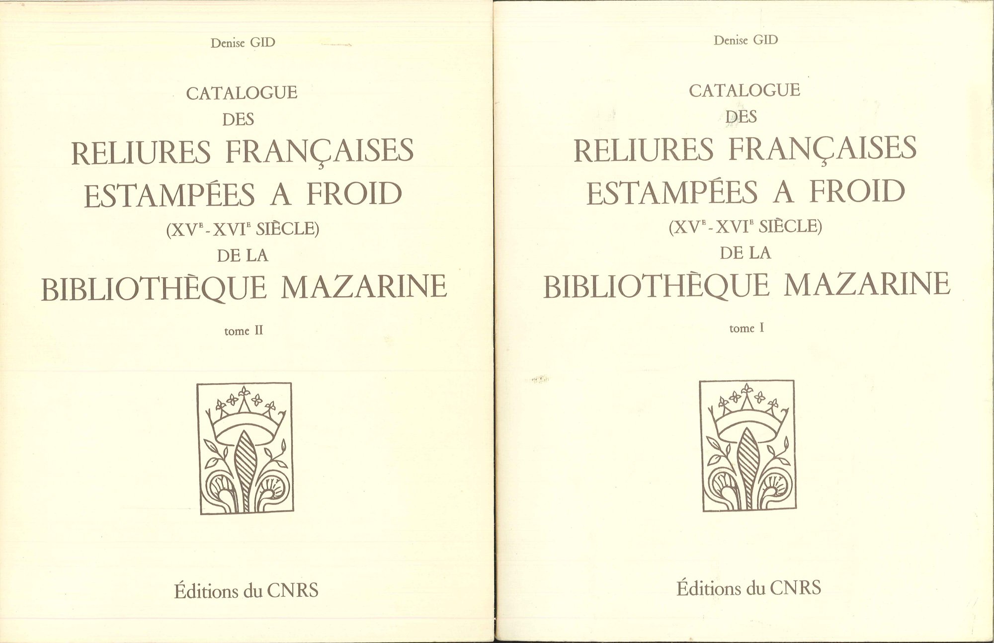 Comprehensive catalogue of French blind-stamped bookbindings done "à froid," or without heated tools, from the fifteenth and sixteenth centuries from the collection of the Bibliothèque Mazarine. The heart of this library was the personal collection of Cardinal Mazarin who bequeathed it to the newly formed collège Mazarin or the Quatres Nations with the stipulation that the volumes be available to the public two days a week. Now, as part of the Institut de France, the spirit of his request still benefits scholars from all over the world. Each of the six hundred entries in Volume one is accompanied by a pencil rubbing from the cover of the book being described.