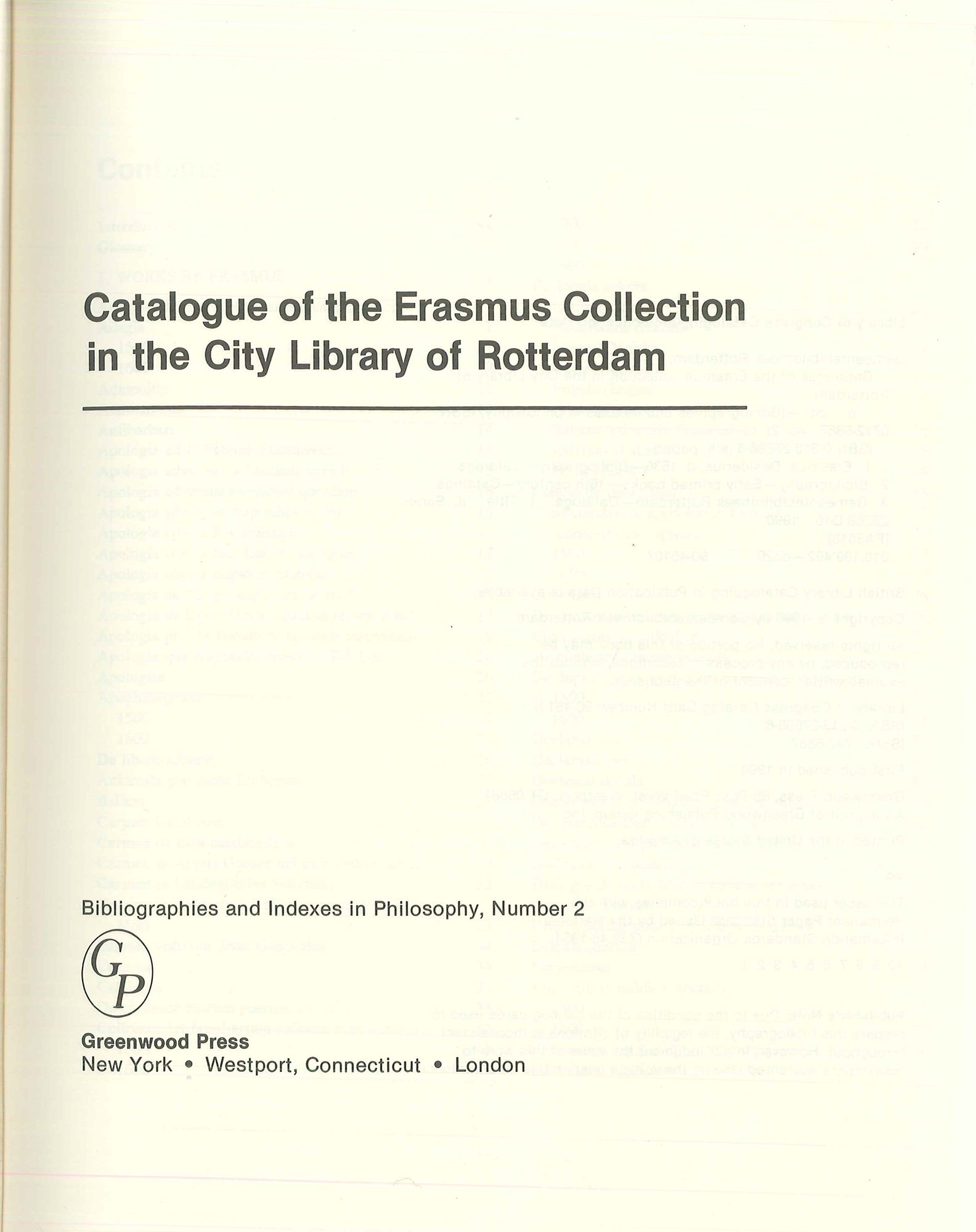 The Rotterdam City Library contains the world's largest collection of works by and about Desiderius Erasmus (1469?-1536), perhaps Rotterdam's most famous son. The origin of this unique collection dates back to the seventeenth century when the city fathers established a library in the Great or St. Laurence Church. This bibliography of the Erasmus collection lists, for the first time, all of the Rotterdam Scholar's works and most of the studies written about him from his time to the present day.