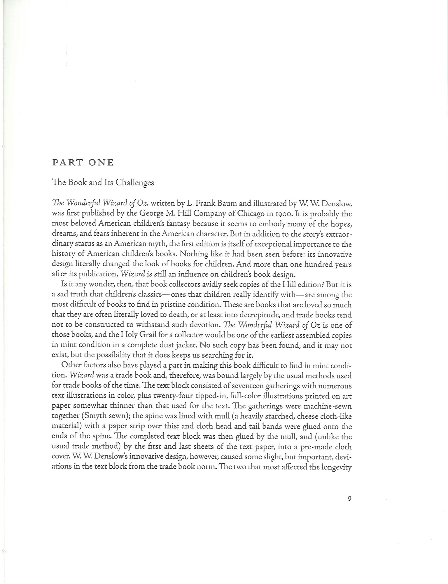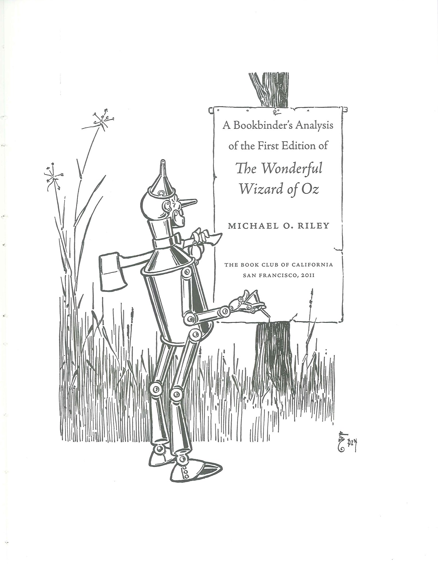 Acknowledgments, table of contents, introduction, two appendices. Includes an original leaf from the first edition of The Wonderful Wizard of Oz (Chicago, 1900). 77 color plates. Also includes a companion volume, Michael O. Riley, A Bookbinder's Analysis of the First Edition of The Wonderful Wizard of Oz (San Francisco: The Book Club of California, 2011). This volume includes an appendix listing changes between State A and State B of the text.