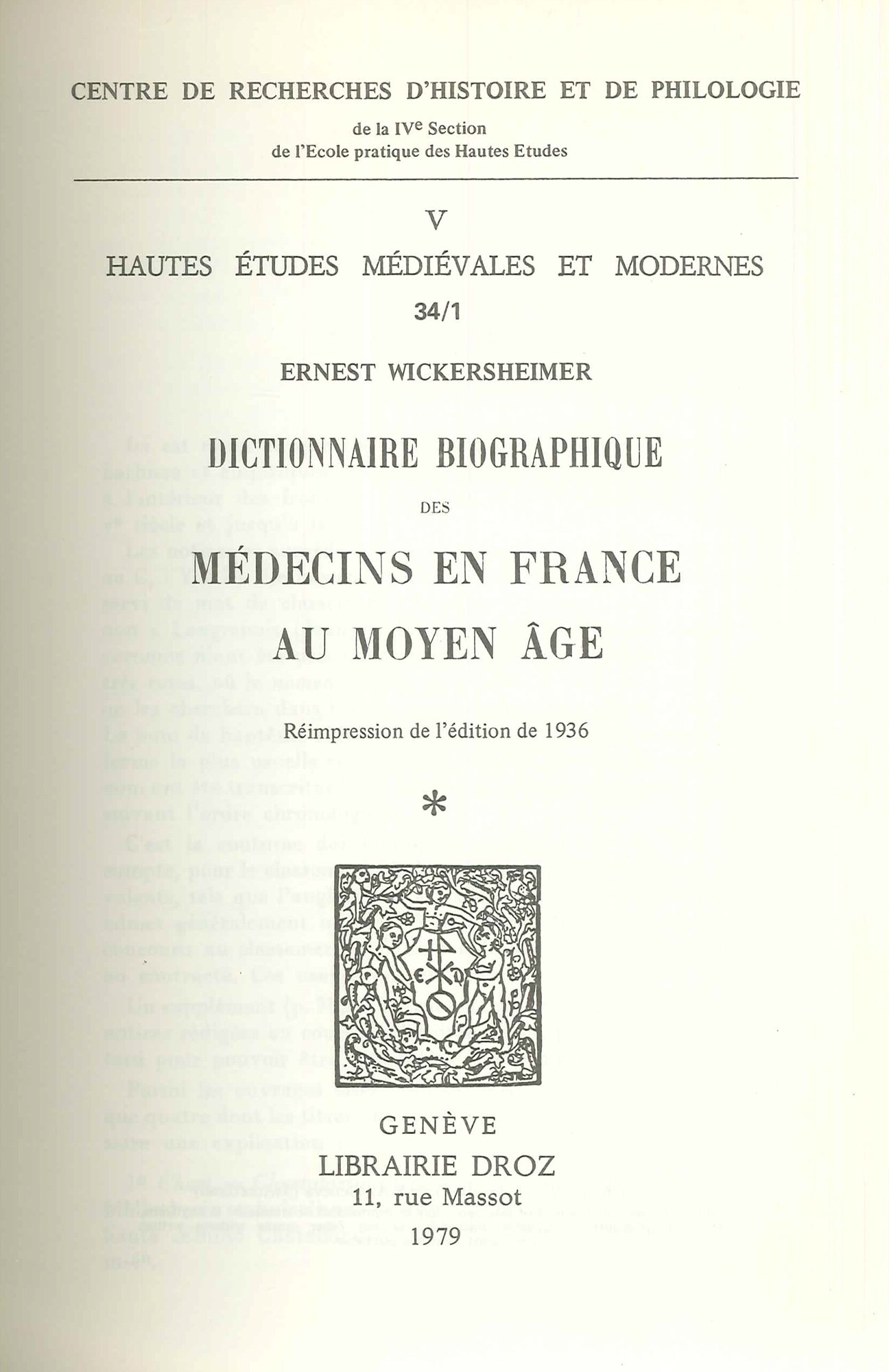 Scholarly work published by the Center for Research in History and Philology, from the Collection of "Hautes Etudes Médiévales et Modernes". The first two volumes are a reprint of the 1936 edition. The supplement by Danielle Jacquart is published under the direction of Guy Beaujouan. Among the most famous doctors: Arnauld de Villeneuve, Albert the Great, Petrus Hispanus, William of Conche, etc. A compendium on medicine in the Middle Ages. The author (1880-1965), a French physician, historian of medicine and librarian, directed the National and University Library of Strasbourg from 1919 to 1950.
