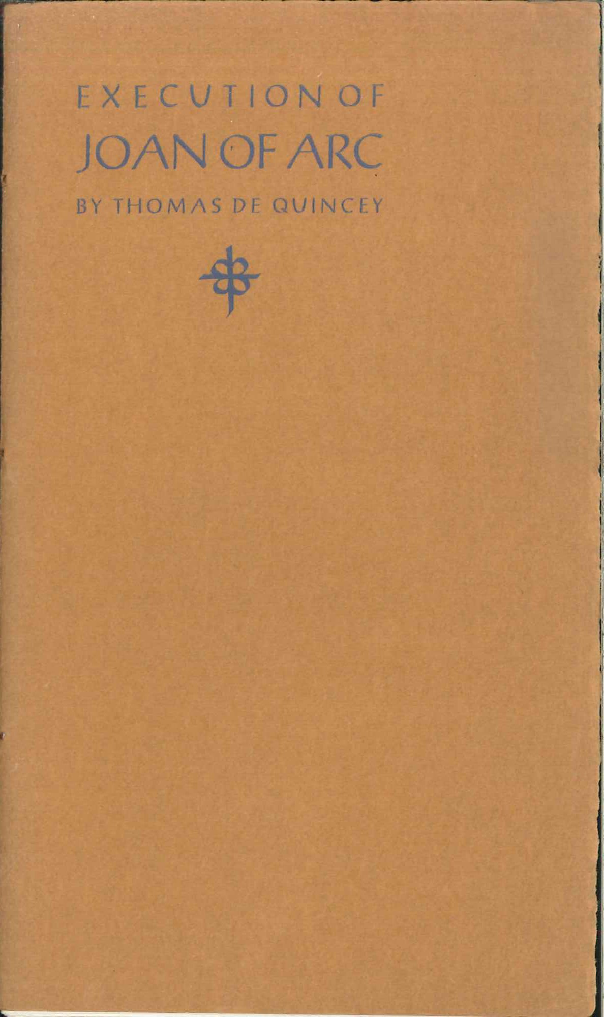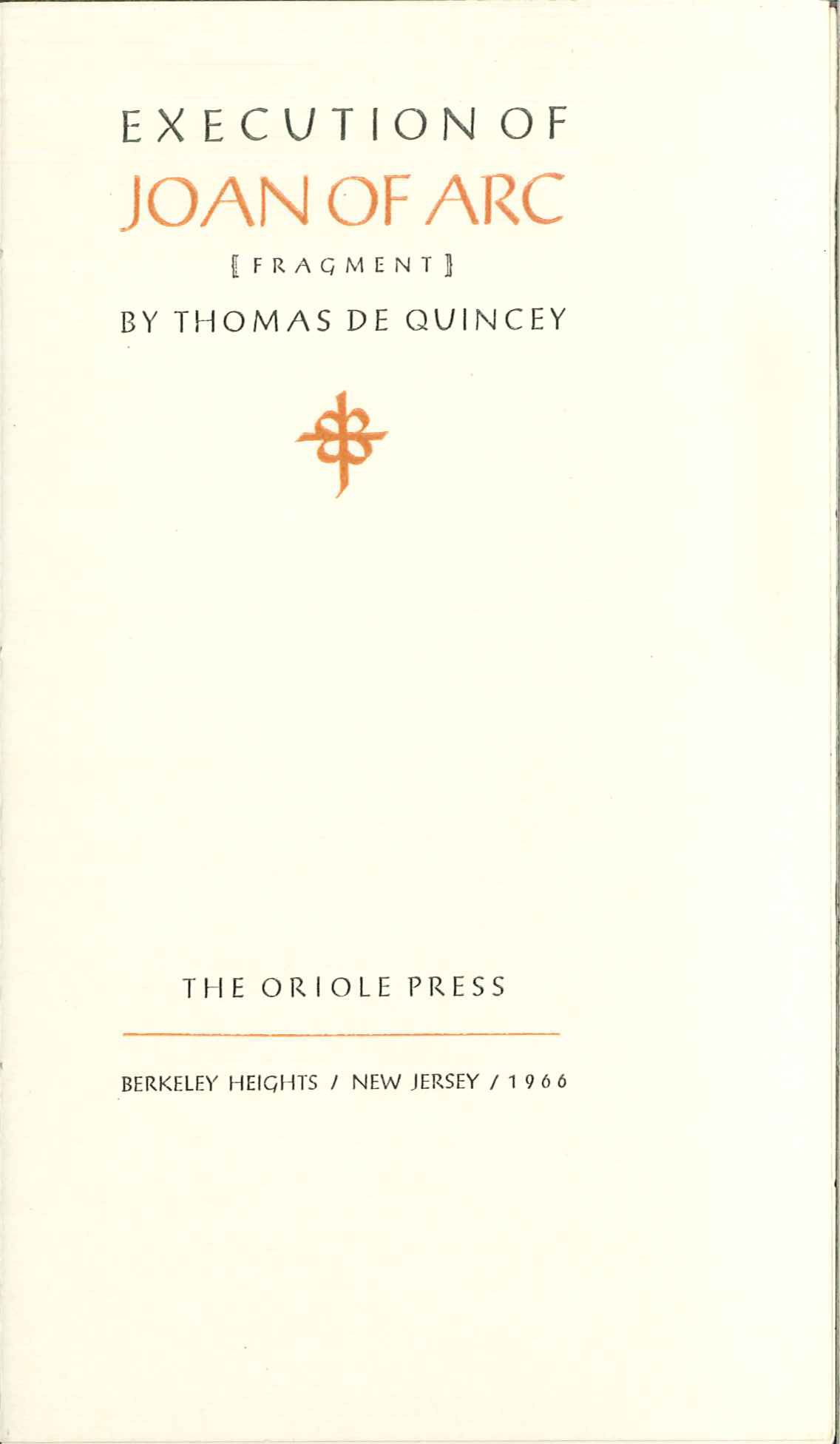 Limited to 100 copies. A near fine copy. The last book printed by Joseph Ishill; an additional book was typeset by him before his death, but printed by another. This copy of "Joan" has stabholes for thread but is unsewn and unfastened (folded leaves fit together nicely and is otherwise fine). *Mendelsohn 193 giving a 1965 date.