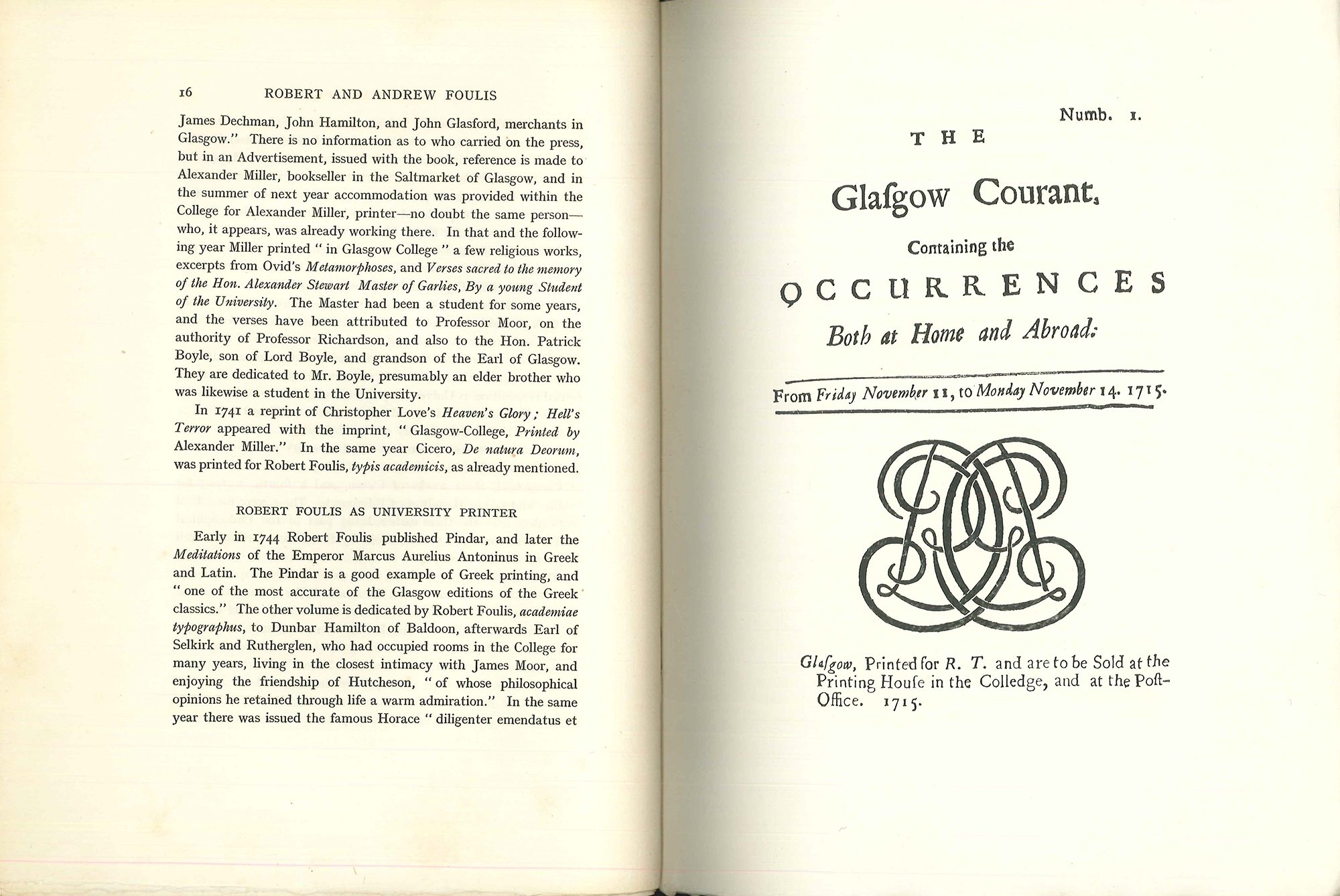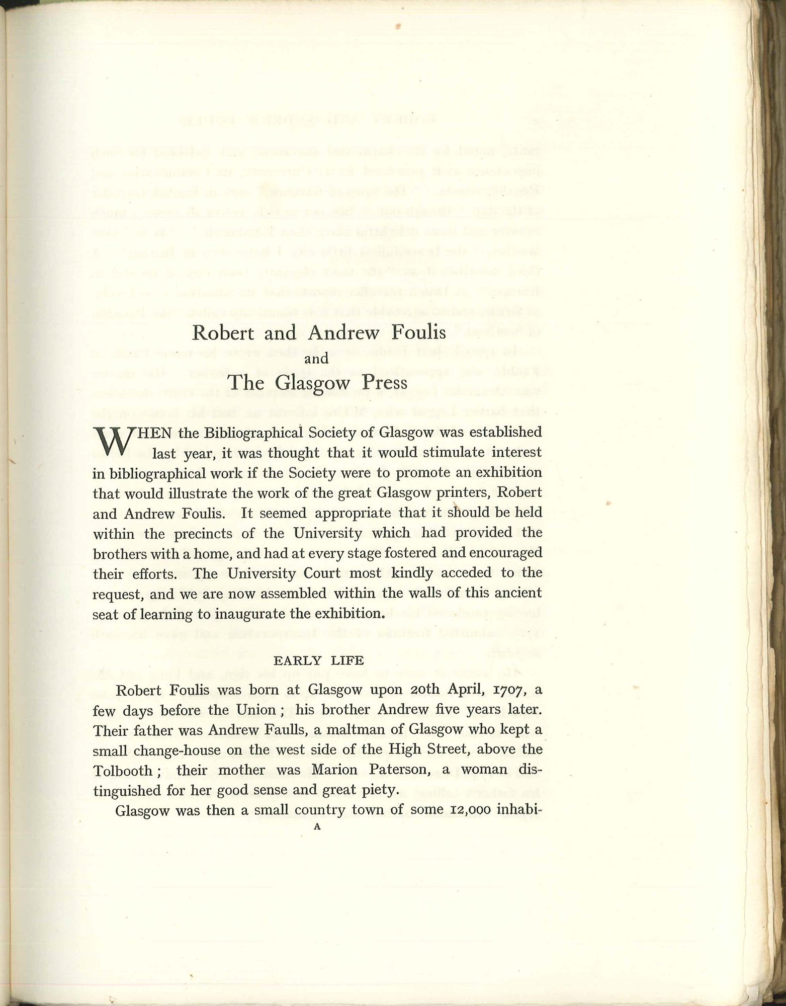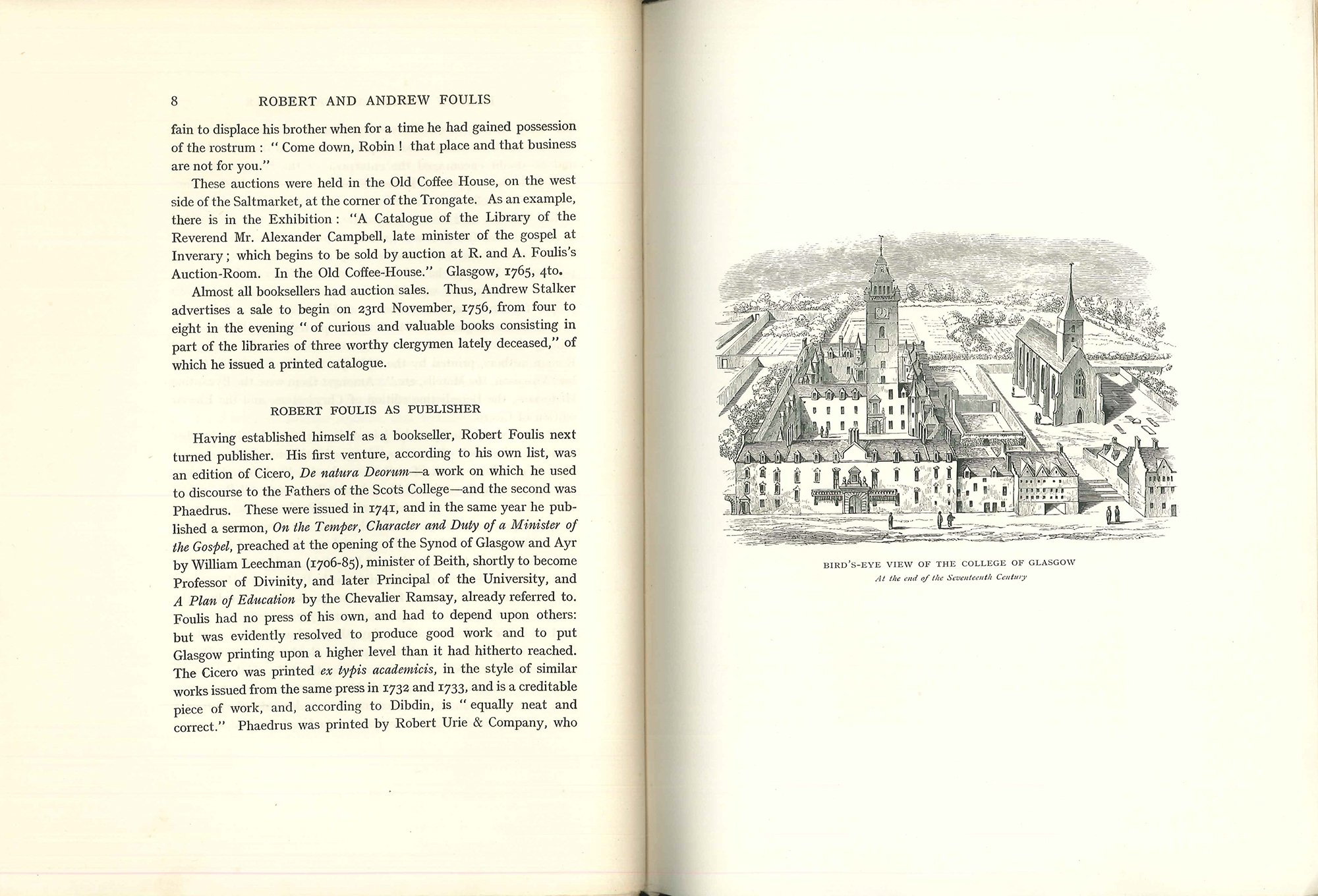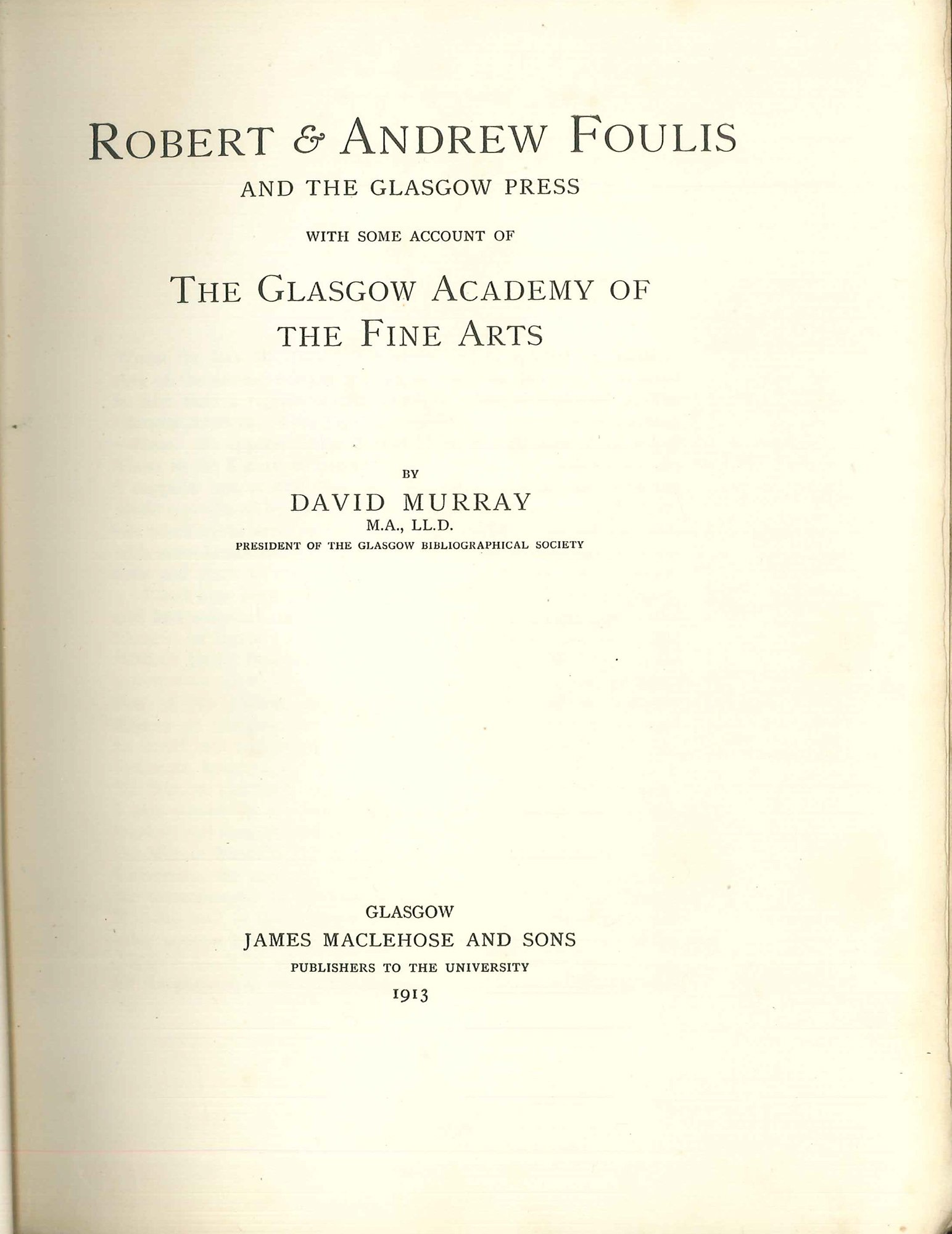 First edition (Appleton p.52). Two bookplates: one of W. MacDonald MacKay, the other unknown. Covers age darkened around edges. Chapters on Robert Foulis as bookseller, publisher and printer, notable books by the press, type founding in Glasgow, and biographies of both Andrew and Robert Foulis. With 13 full-page plates.