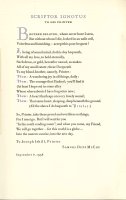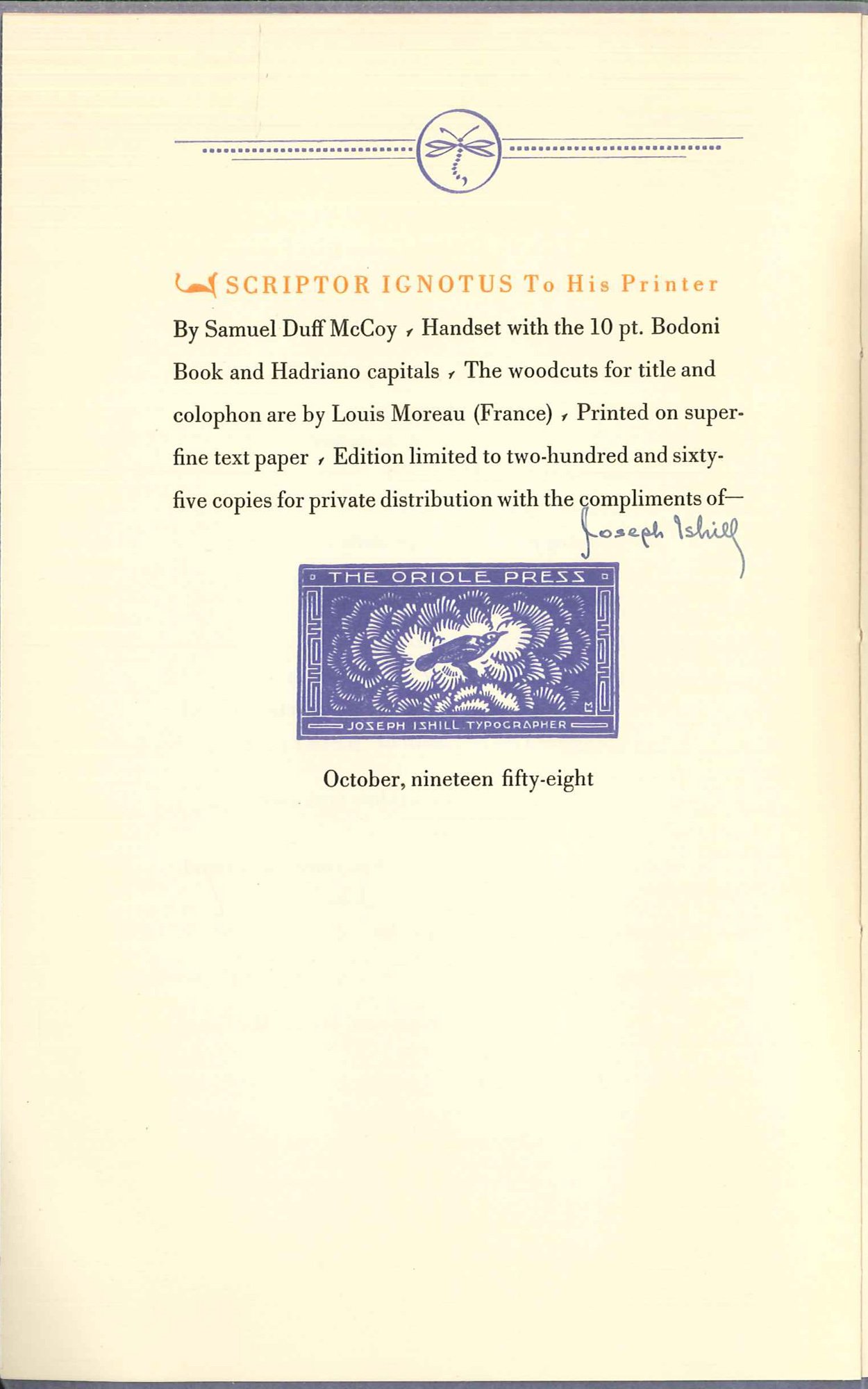 Limited to 265 signed copies printed by Joseph Ishill at The Oriole Press. This copy is signed by Ishill on the colophon. Poem. Newspaper clipping on an exhibit of Ishill's books laid in. In very good condition. Printed in two colors and woodcuts for the title-page and colophon by Louis Moreau.
