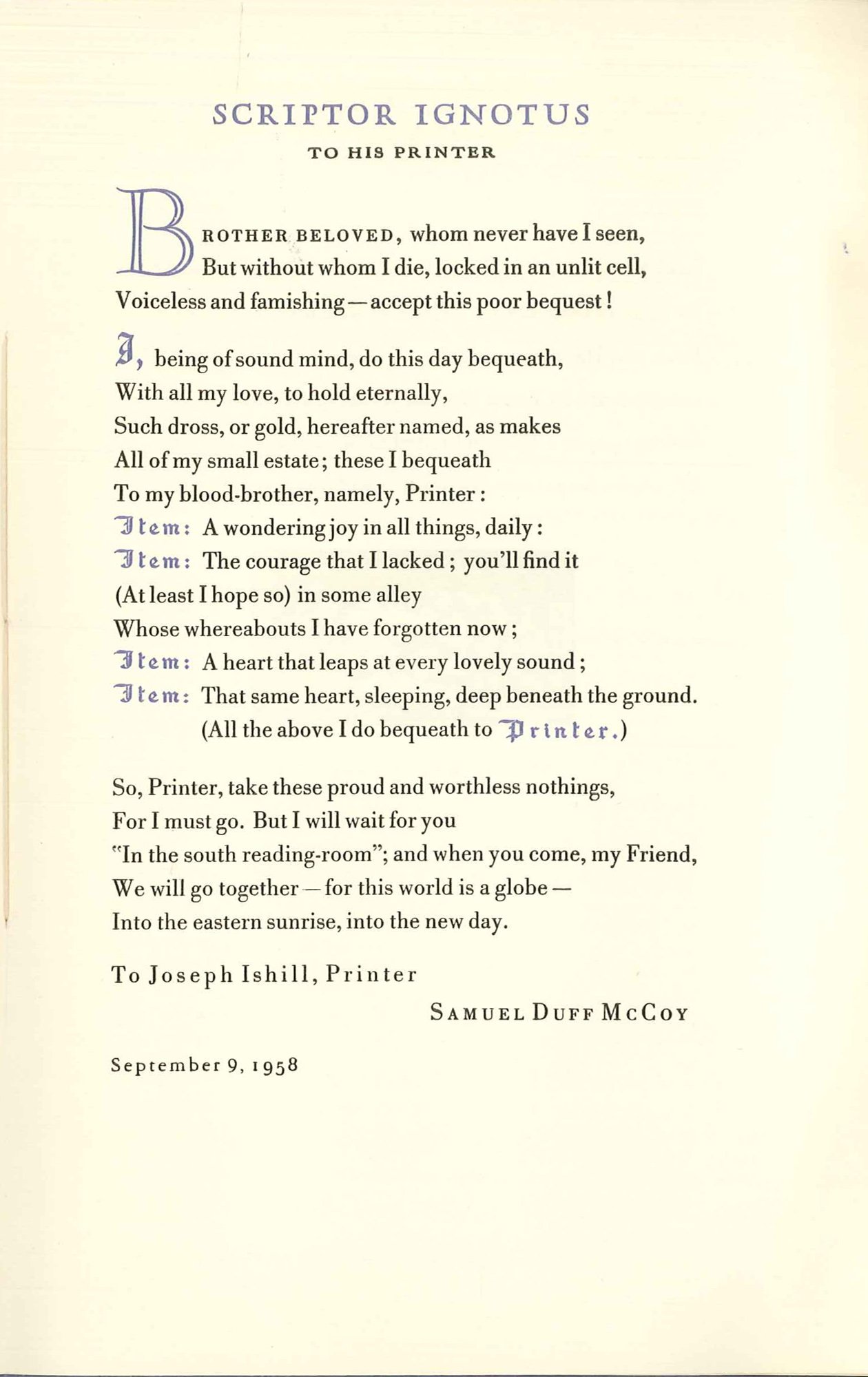 Berkeley Heights, NJ: The Oriole Press, (1958); 12mo., stiff paper wrappers, cord-tied; (iv) pages. Book # 142197