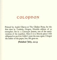 Tualatin, OR: The Clinker Press, 2019; 8vo., quarter cloth over decorated paper-covered boards; (xi), 18, (10) pages. Book # 134224