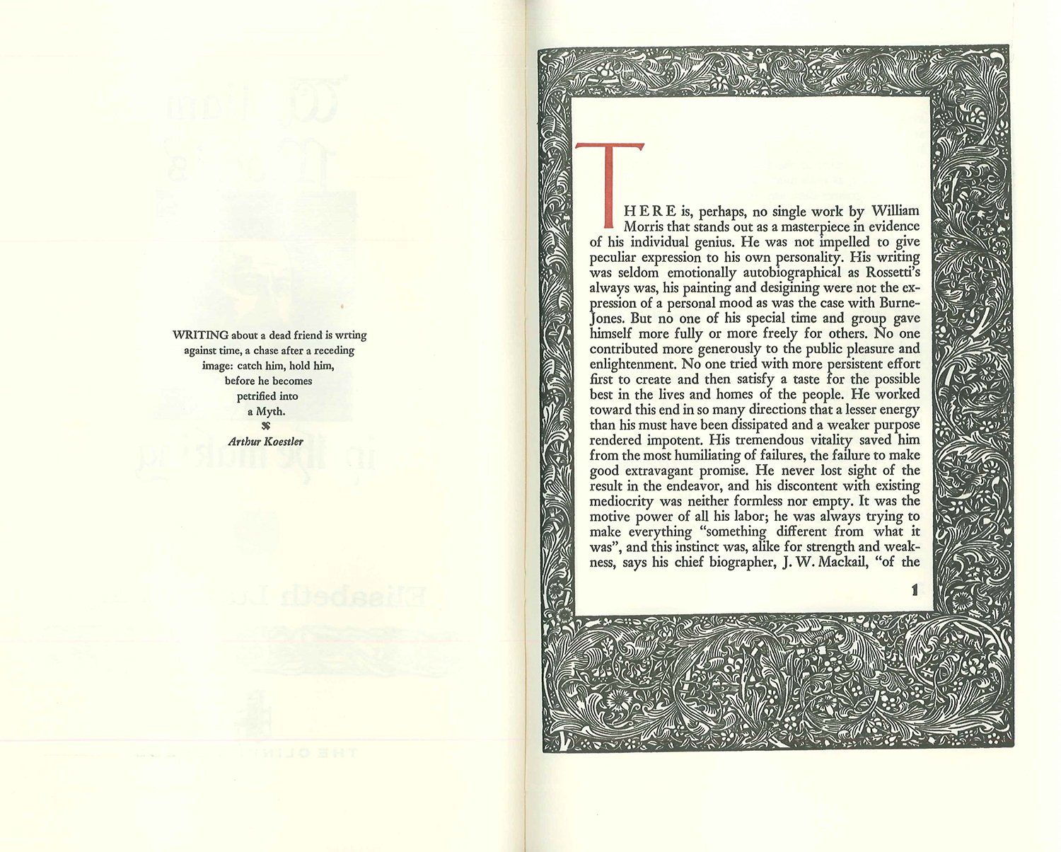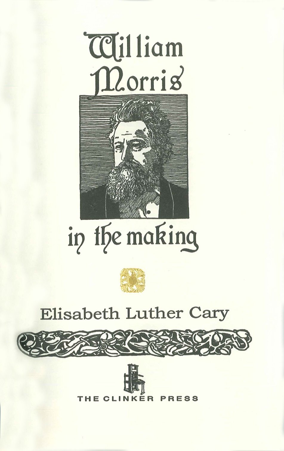 Limited to one of 30 unnumbered copies. Printed by Andre Chaves at The Clinker Press. Set in 11 Linotype Jenson on handmade paper. Bound by Sam Ellenport. A biography of William Morris written within six years after his death.