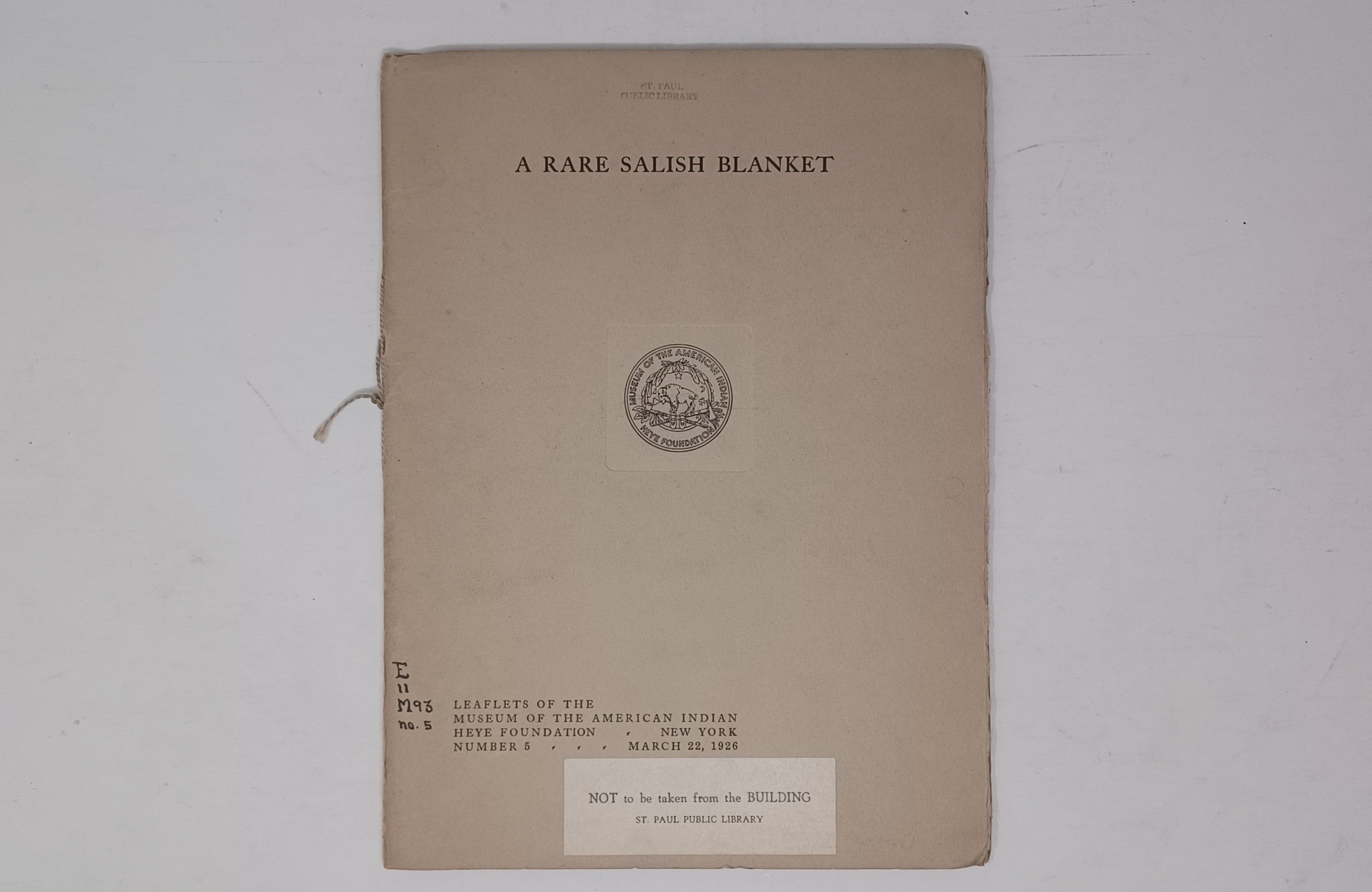 no 5 A Rare Salish Blanket, 1926, 1st edition, 15 pages, 1 color plate, 4 b/w plates,, illustrations in text