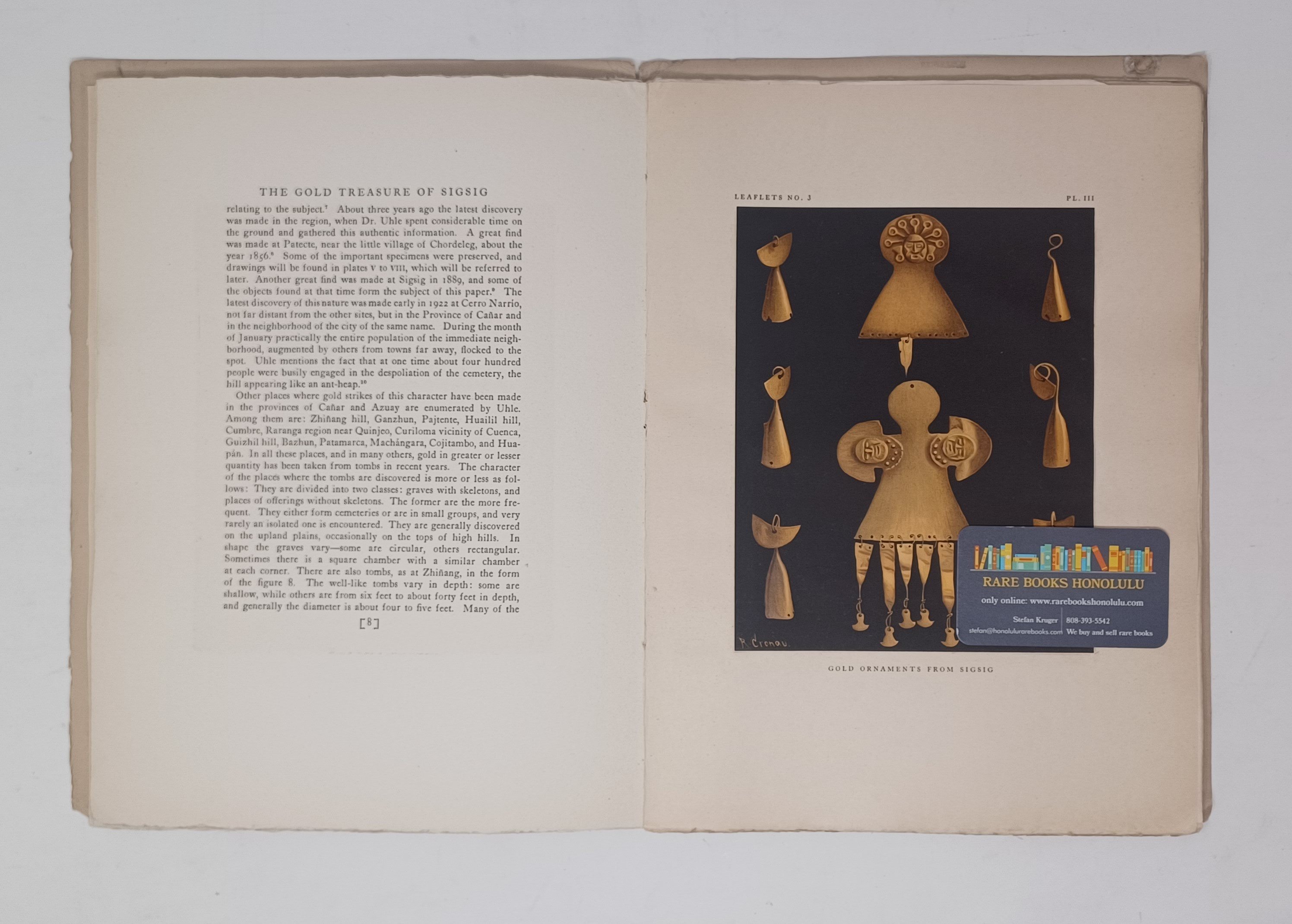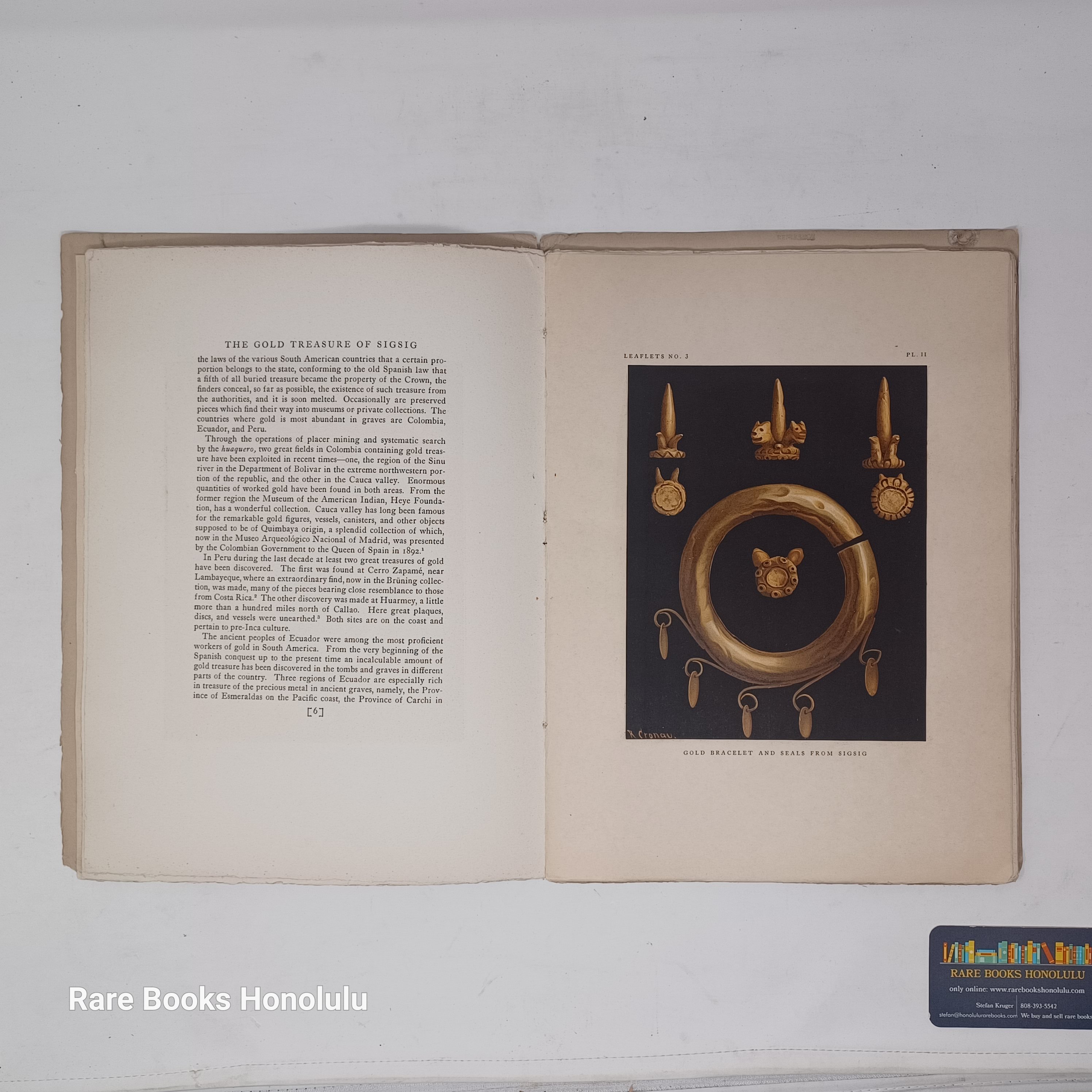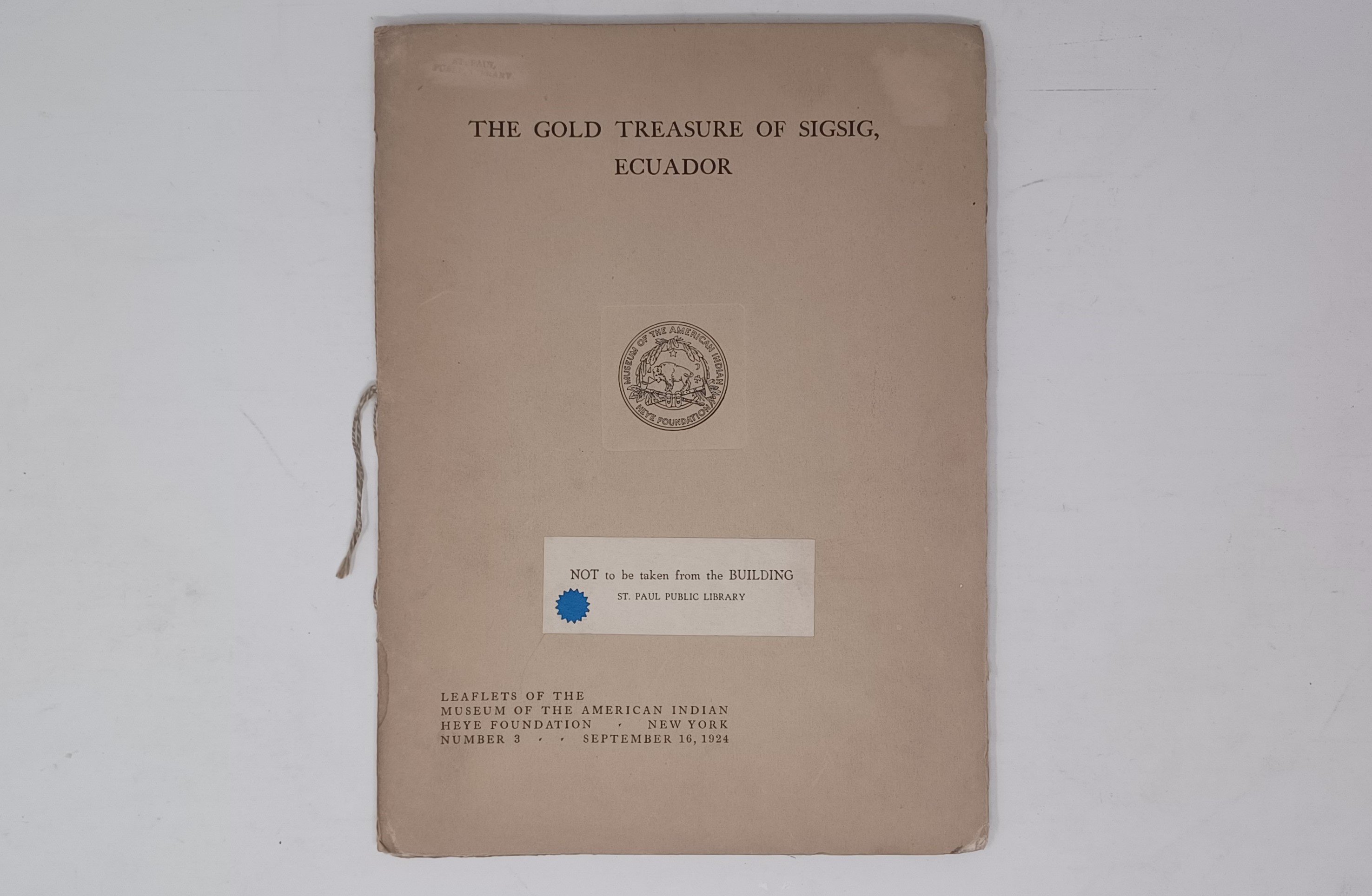 no. 3 The Gold Tresure of Sigsig, Ecuador, 1924, 1st edition, 20 pages, 3 tipped in color plates, 4 b/w plates, wrapper spine split half way, but still solid