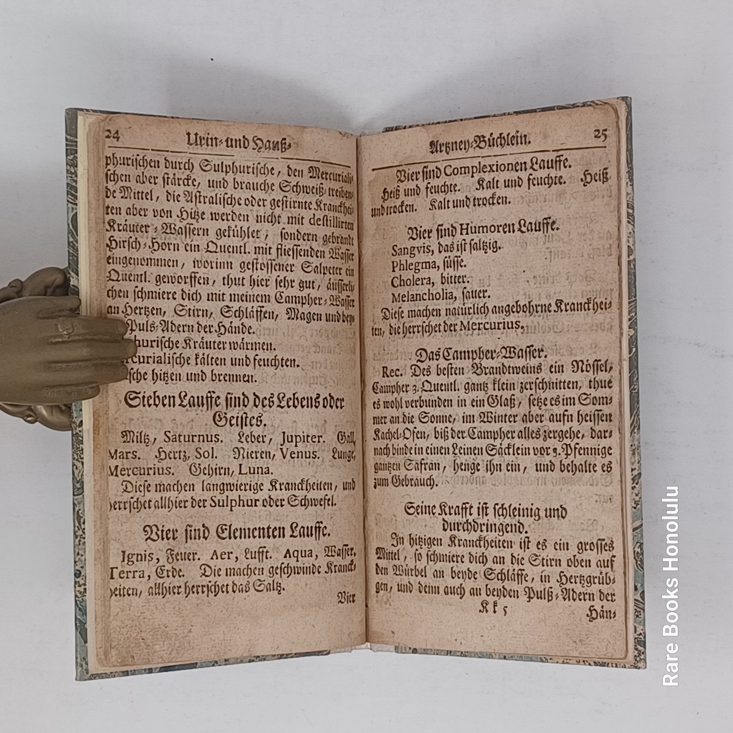 German booklet on the uses of Urine in self-diagnosis and curing of disease. One part of a four-part publication from a larger medical work (Der curiöse Chymicvs, Oder curiöses Laboratorium (...), but separately paginated. Pages 31, misnumbered 39.