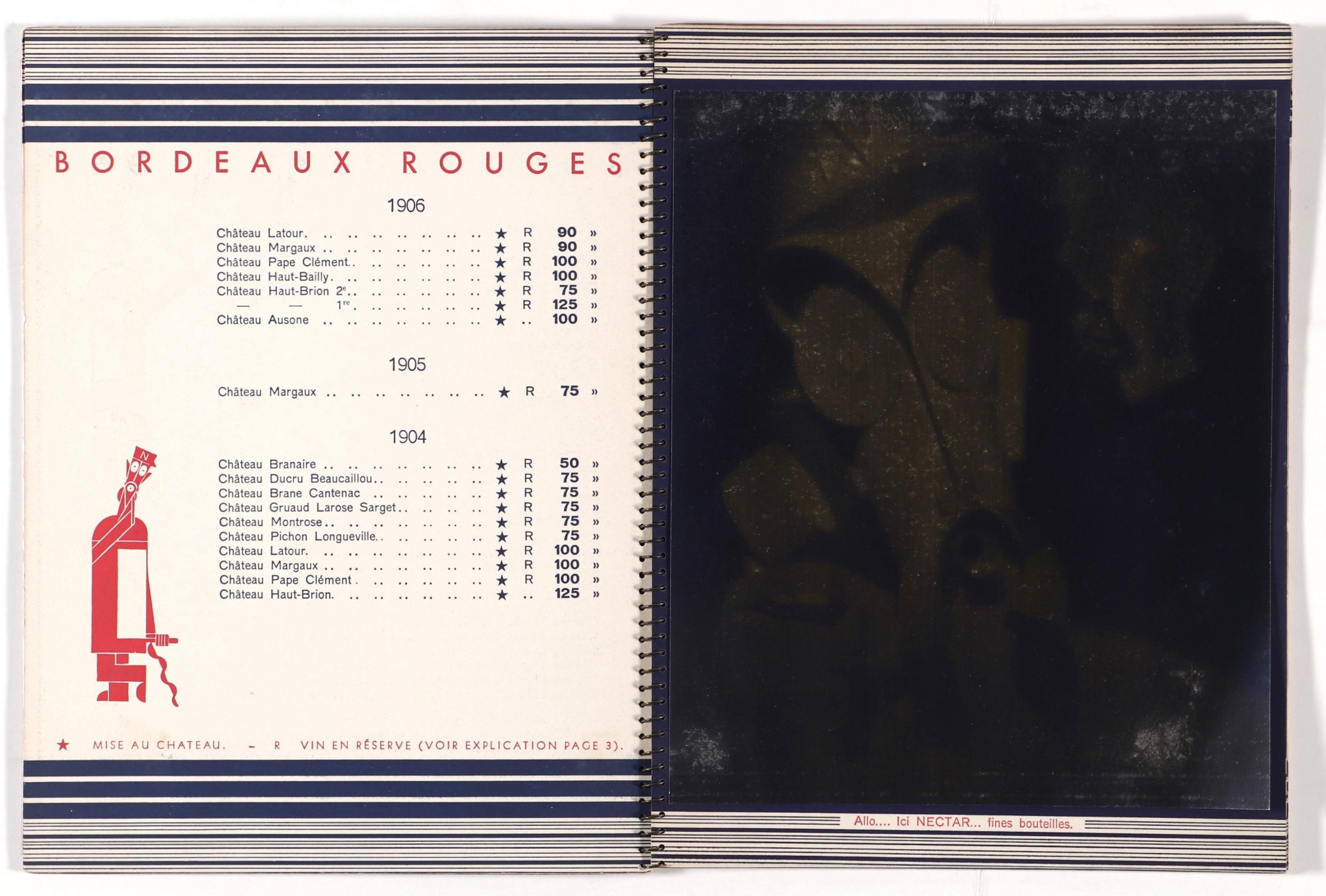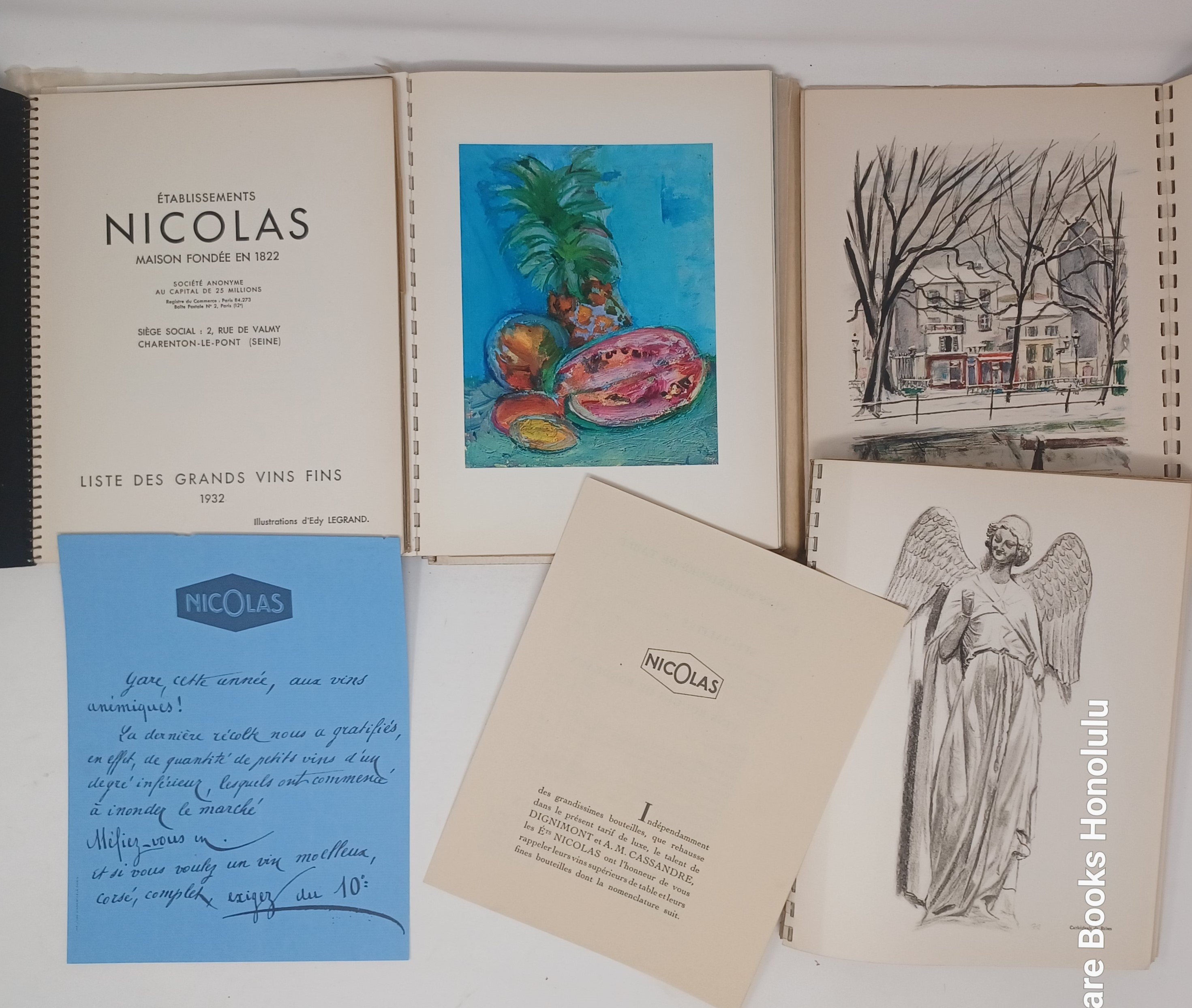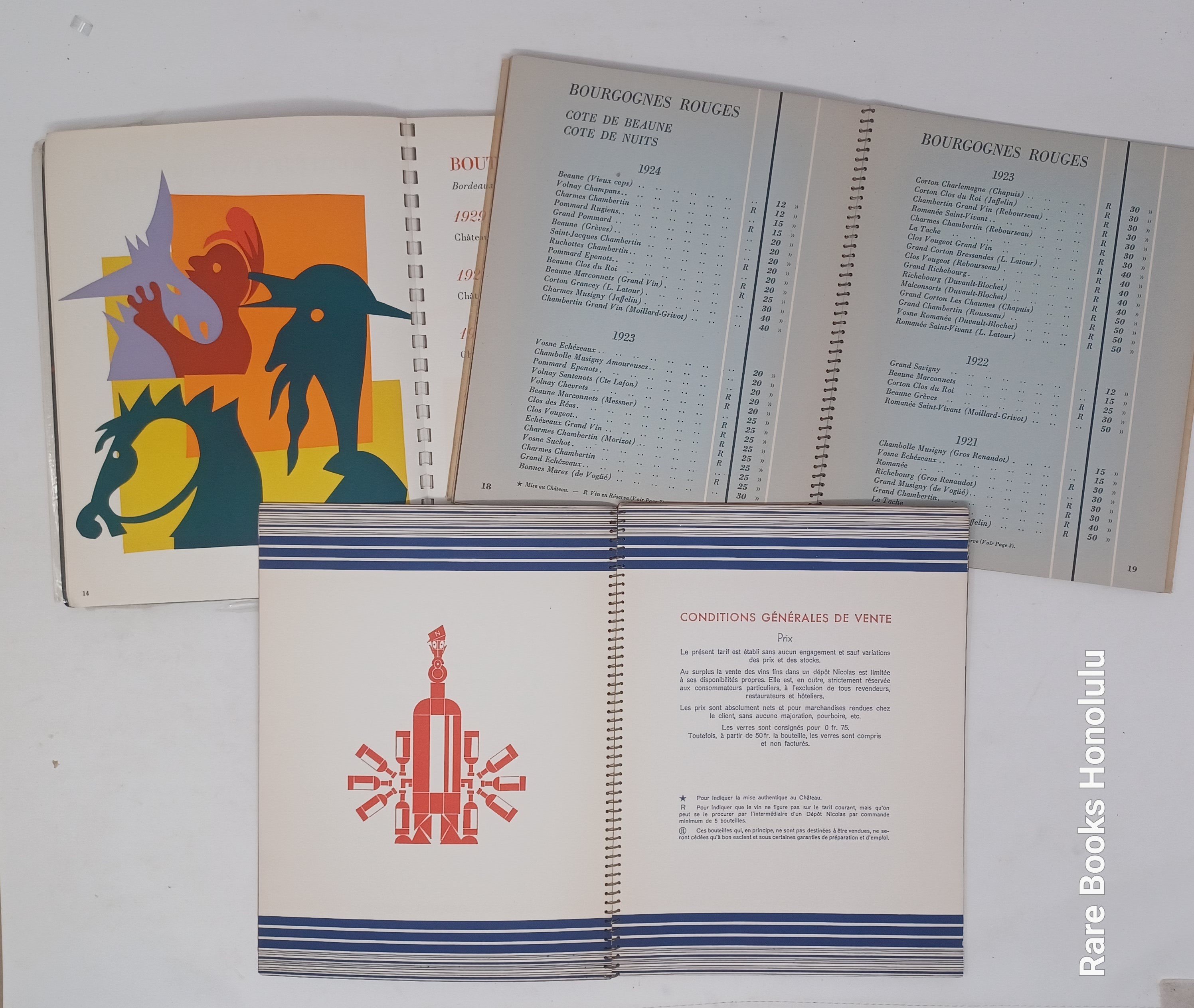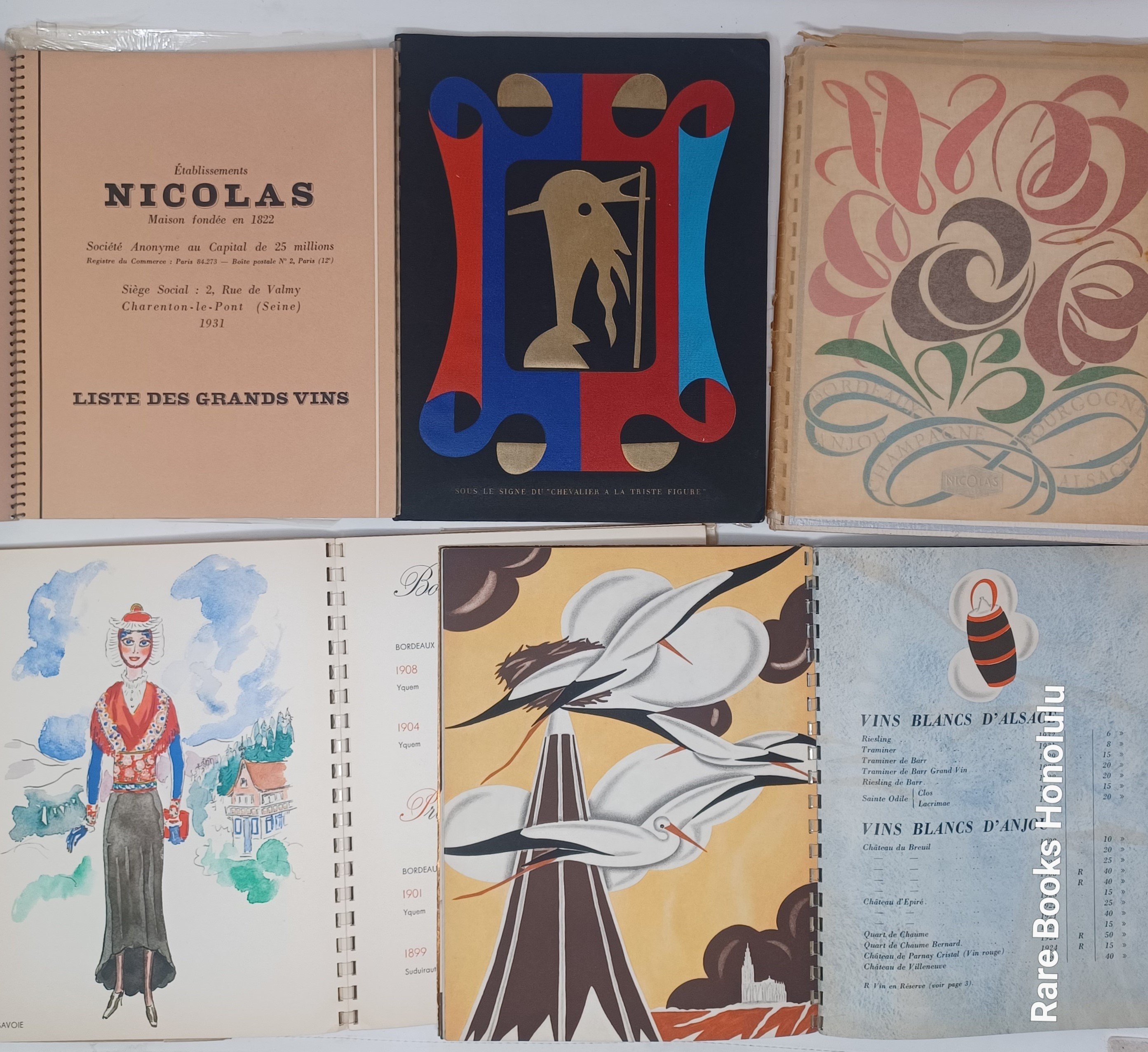 Établissements Nicolas, maison fondée en 1822. Liste des grands vins fins 1930-1961, 21 volumes (complete for this time frame, see details below). Paris, 1930-1961, design and typography b. A.M. CASSANDRE, DRANZY, E. LEGRAND, DARCY, C. VAN DONGEN, DIGNIMONT and others. Originals, not uniform, in wrappers.