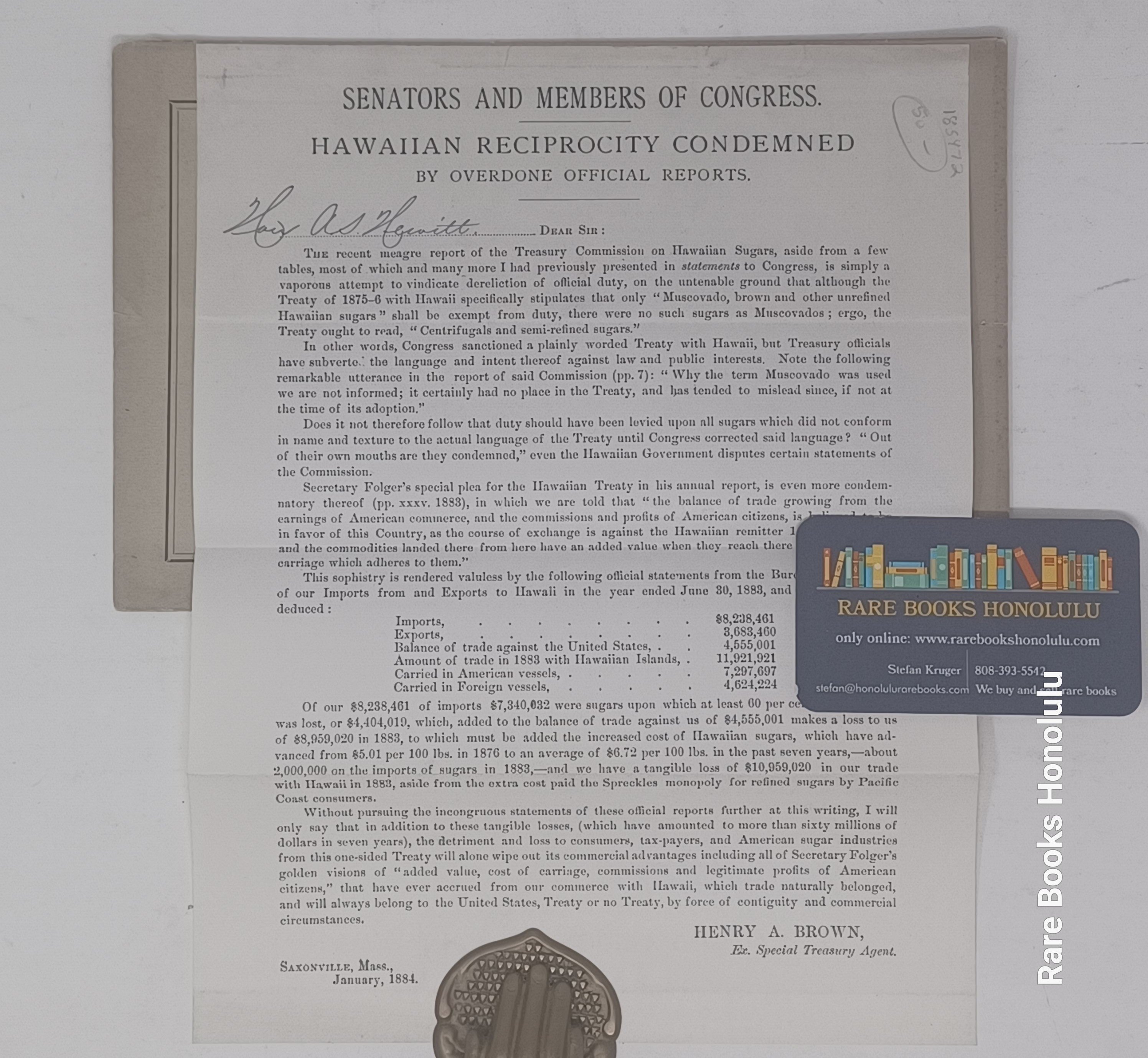 The original wrapper is lightly browned, there is a crease from the top to the bottom throughout the pamphlet. The letter has been tipped to one edge of the cover. The letter is addressed to the Senators and Members of Congress, Hewitt's name is written in the 'Dear Sir' area. '