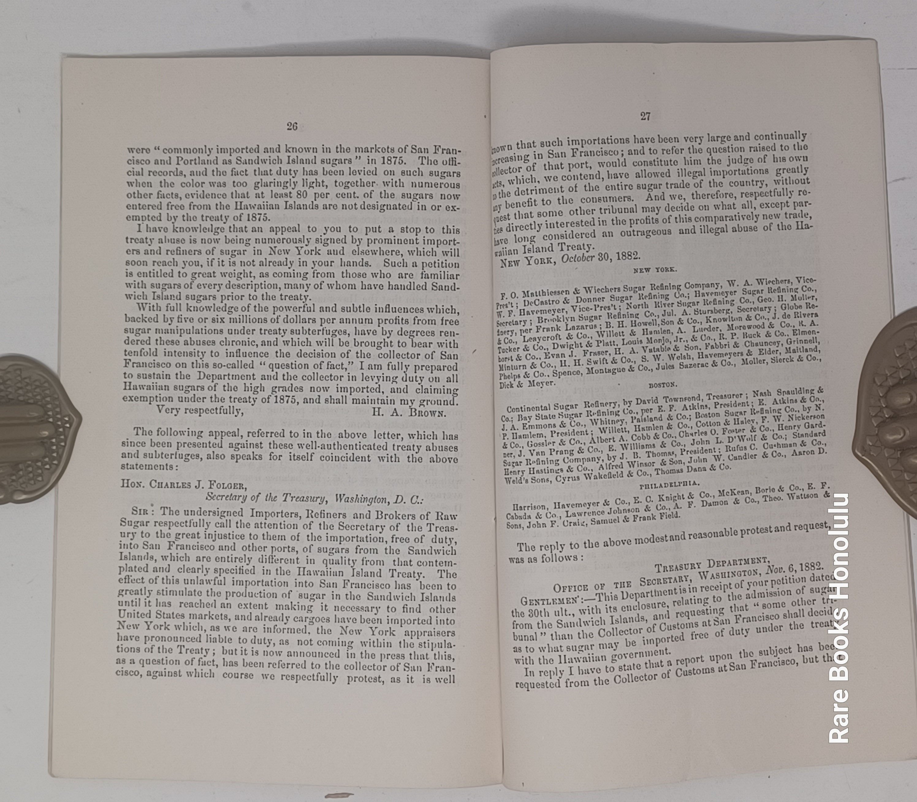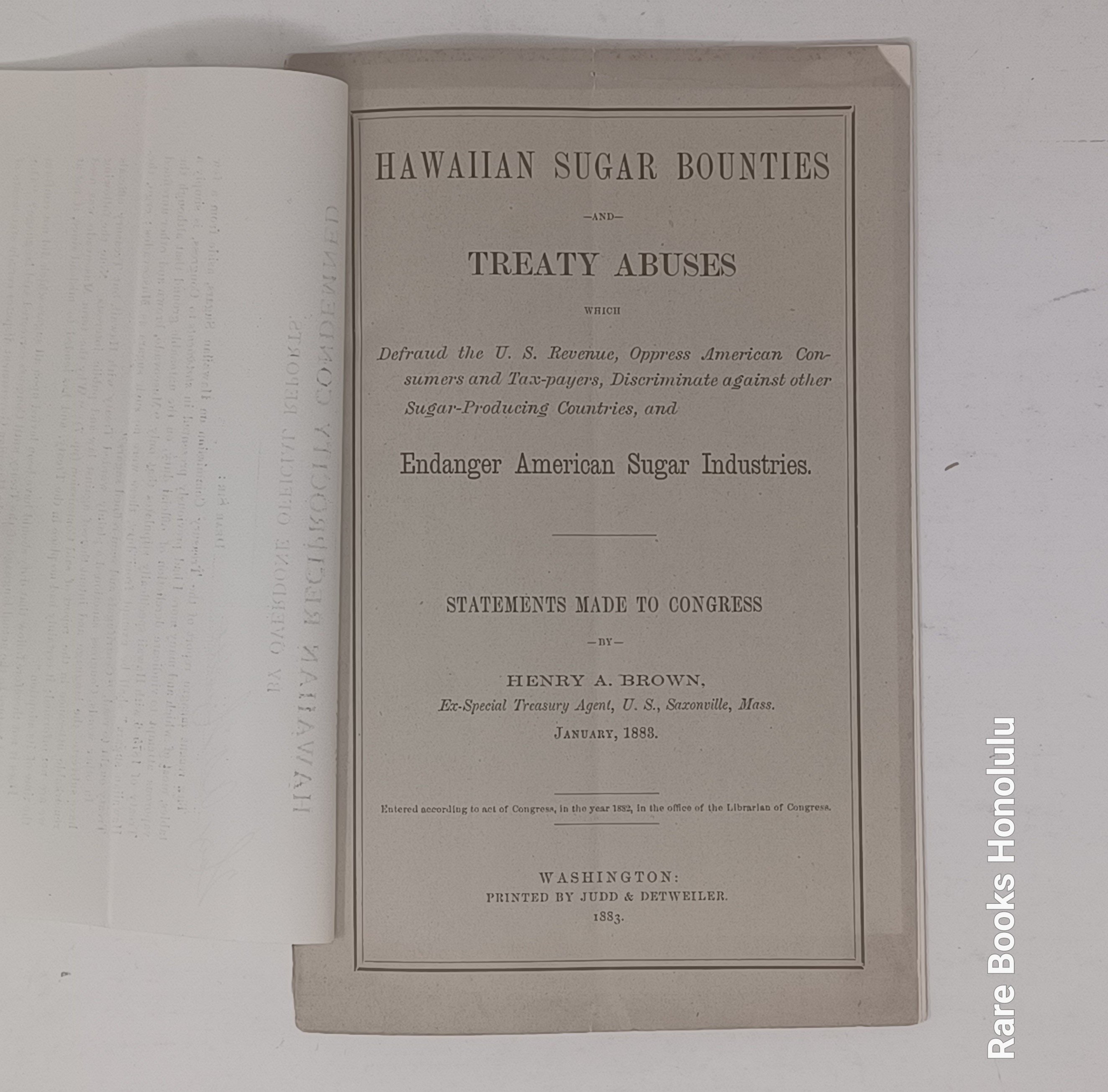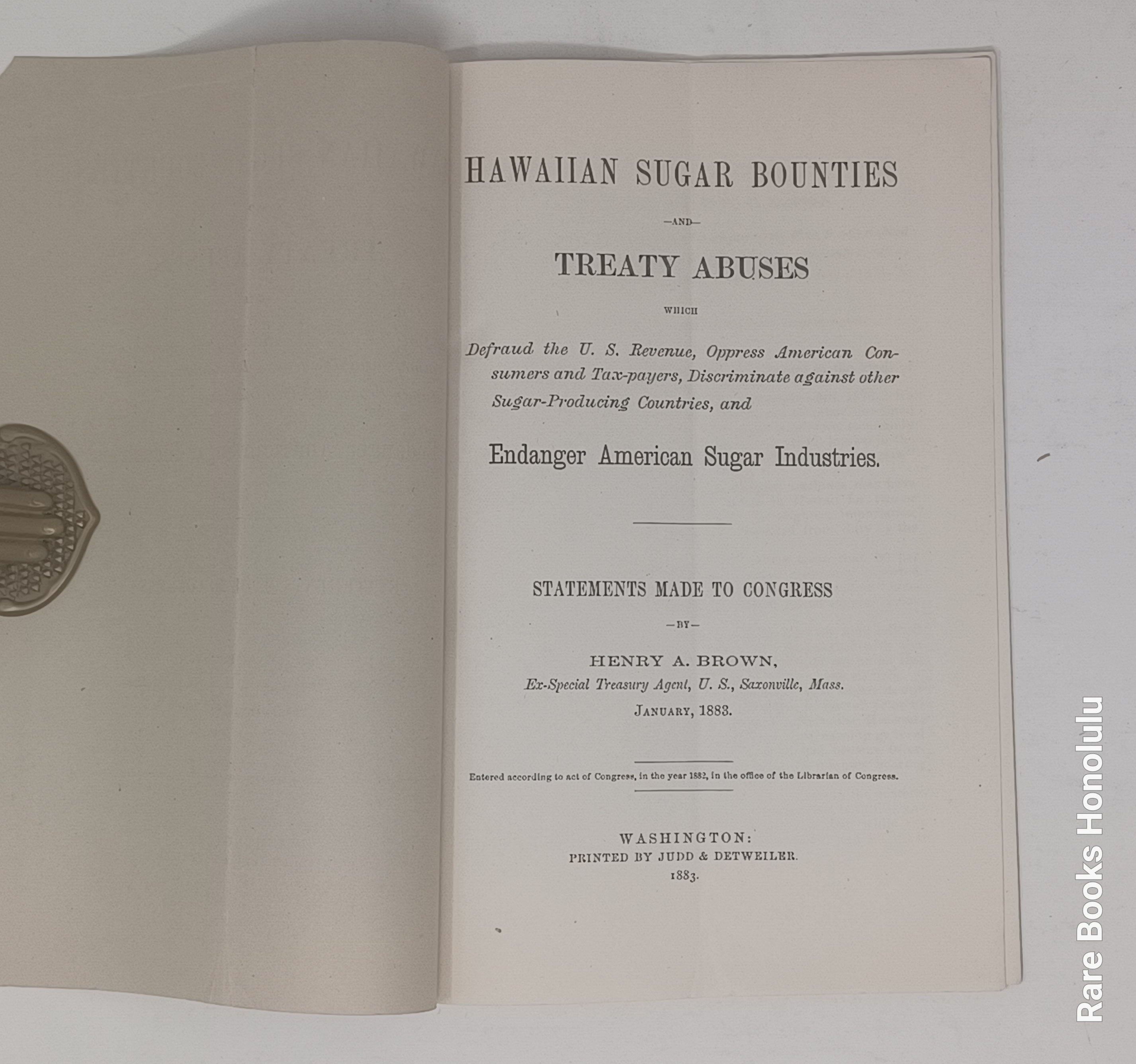 Full title: "Hawaiian Sugar Bounties And Treaty Abuses Which Defraud The U. S. Revenue, Oppress American Consumers And Tax-payers, Discriminate Against Other Sugar-producing Countries, And Endanger American Sugar Industries. Statements Made to Congress by Henry A. Brown"