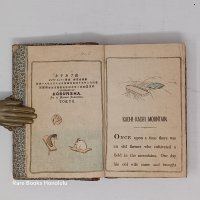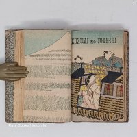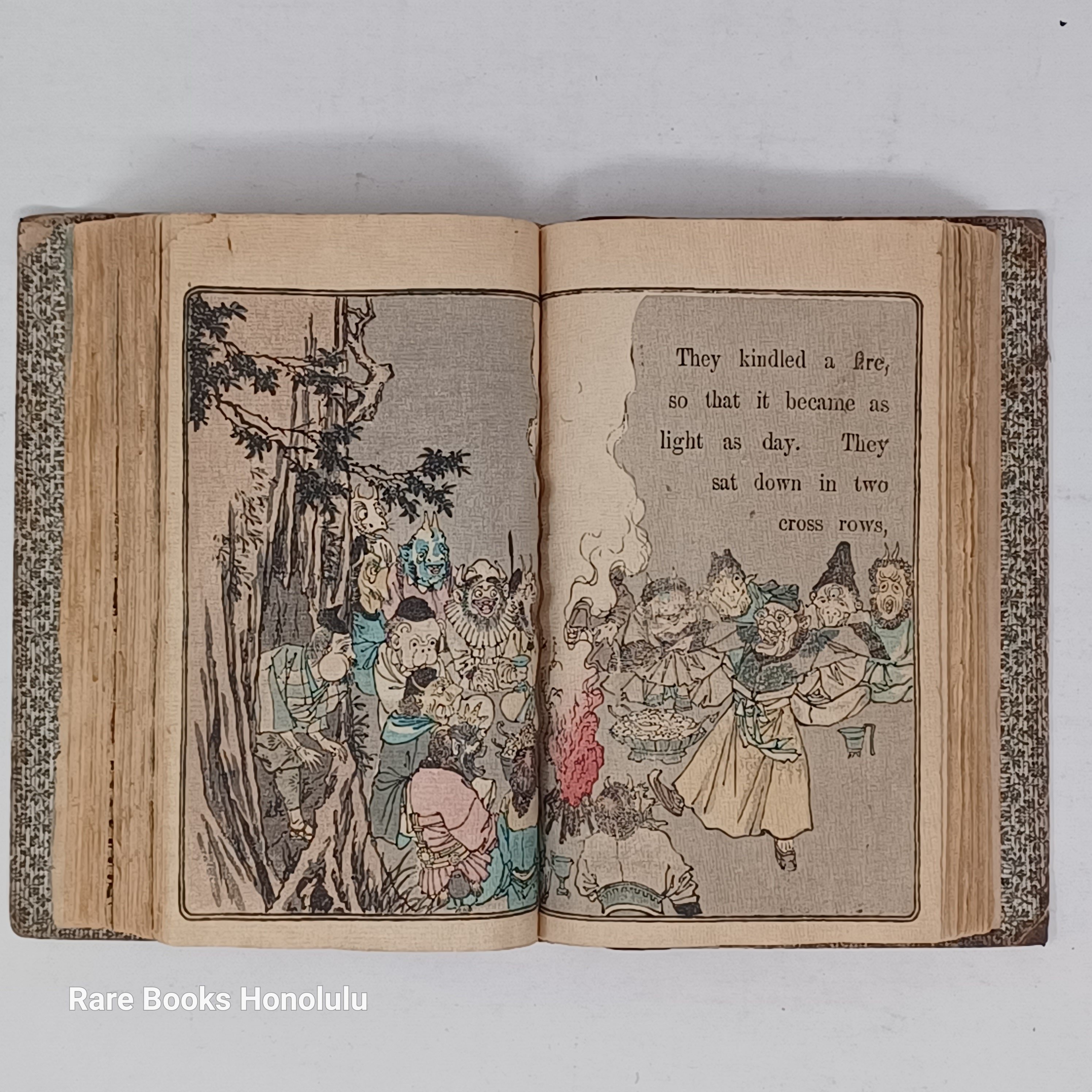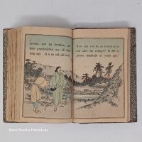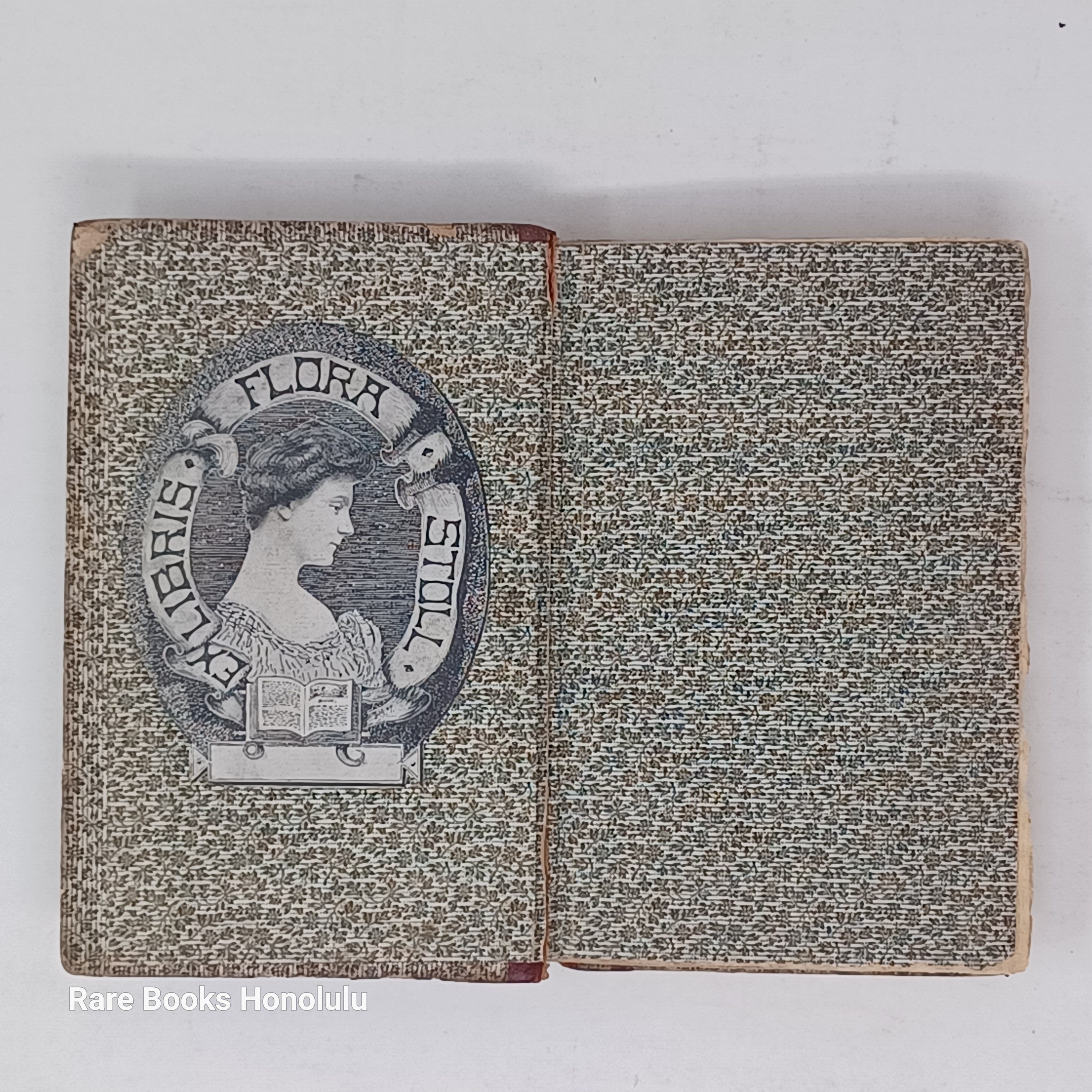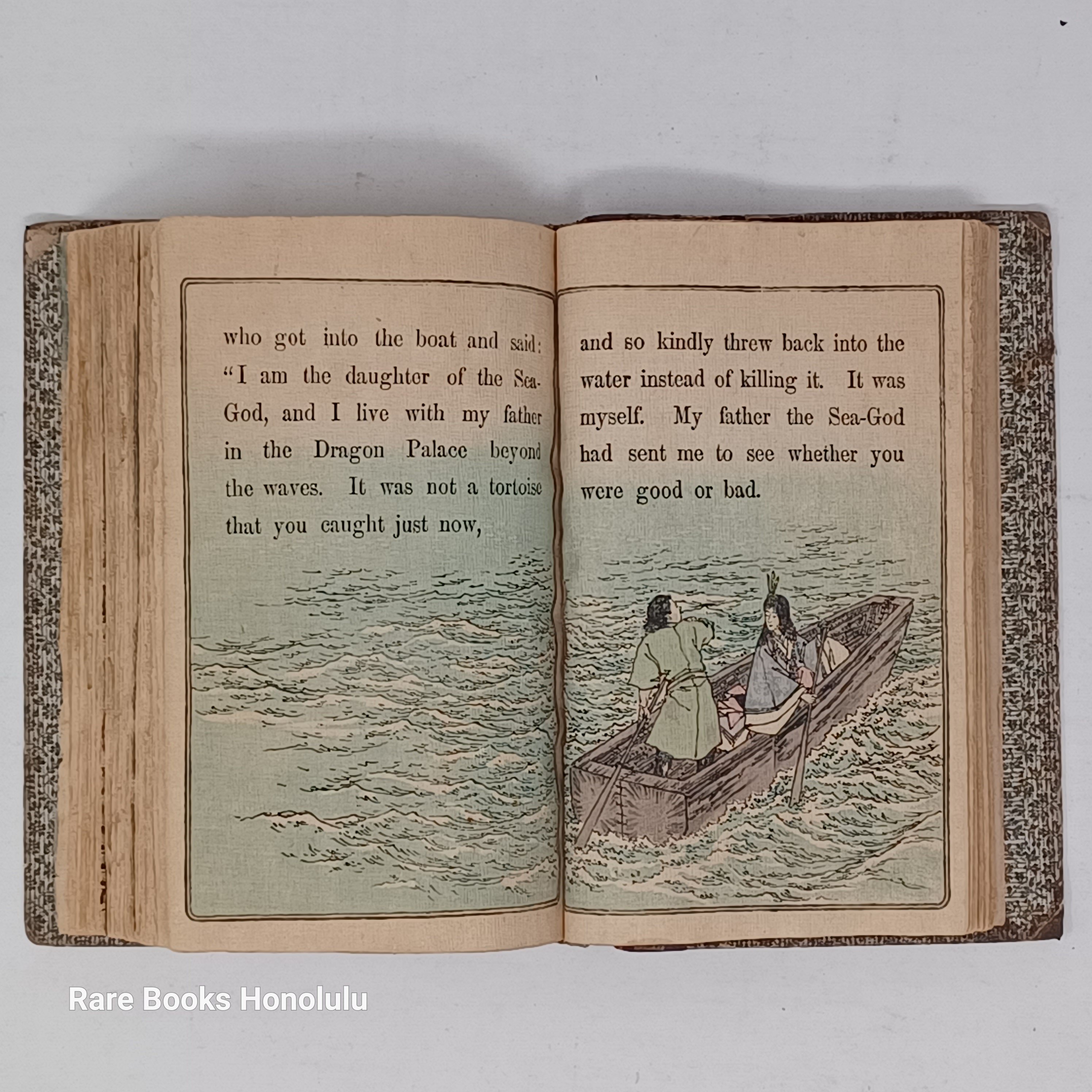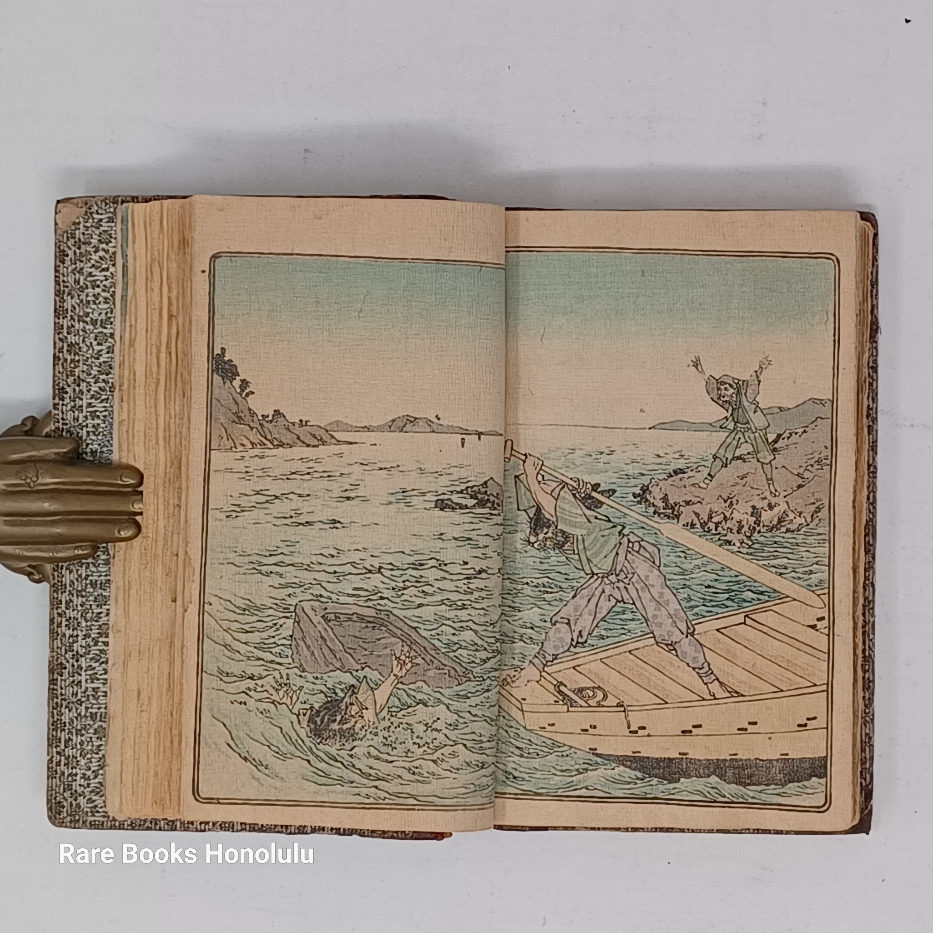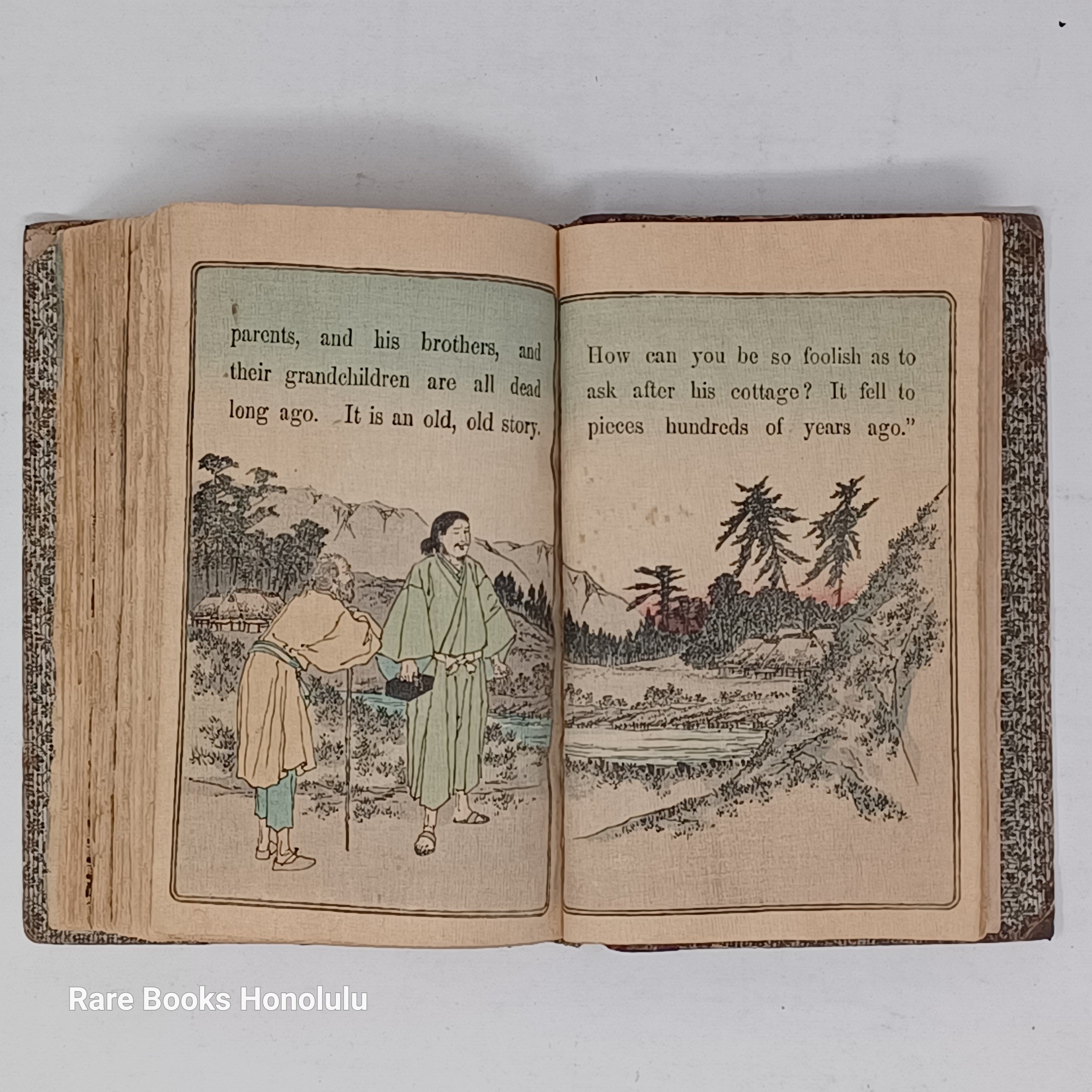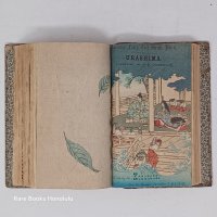 Published by KOBUNSHA, Tokyo, 1886 - 1899), 6" x 3.75" x 1.25" (book). Crepe paper illustration of KACHI- KACHI MOUNTAIN mounted to front cover. Back cover also has Crepe paper mounted. If it had an illustration, it has been rubbed off over time. Percaline spine with gilded title. Illustrated endpaper, very interesting, large ex-libris for a Flora Stoll on inside cover.