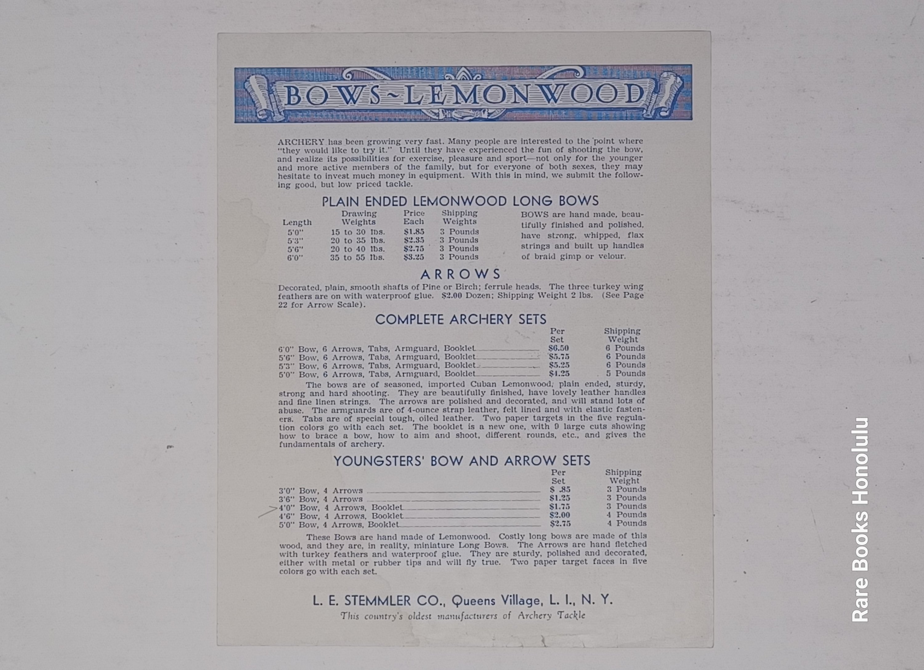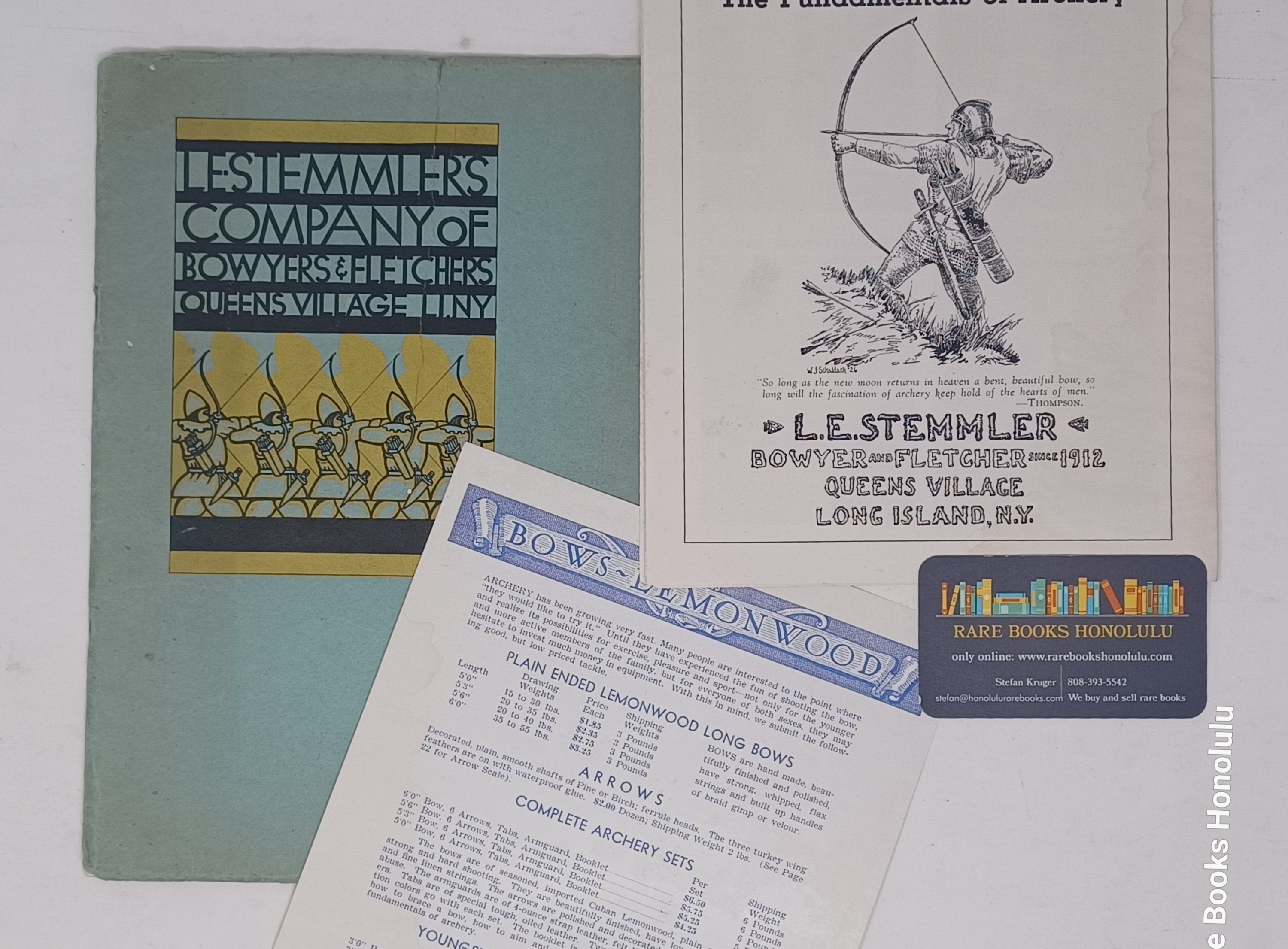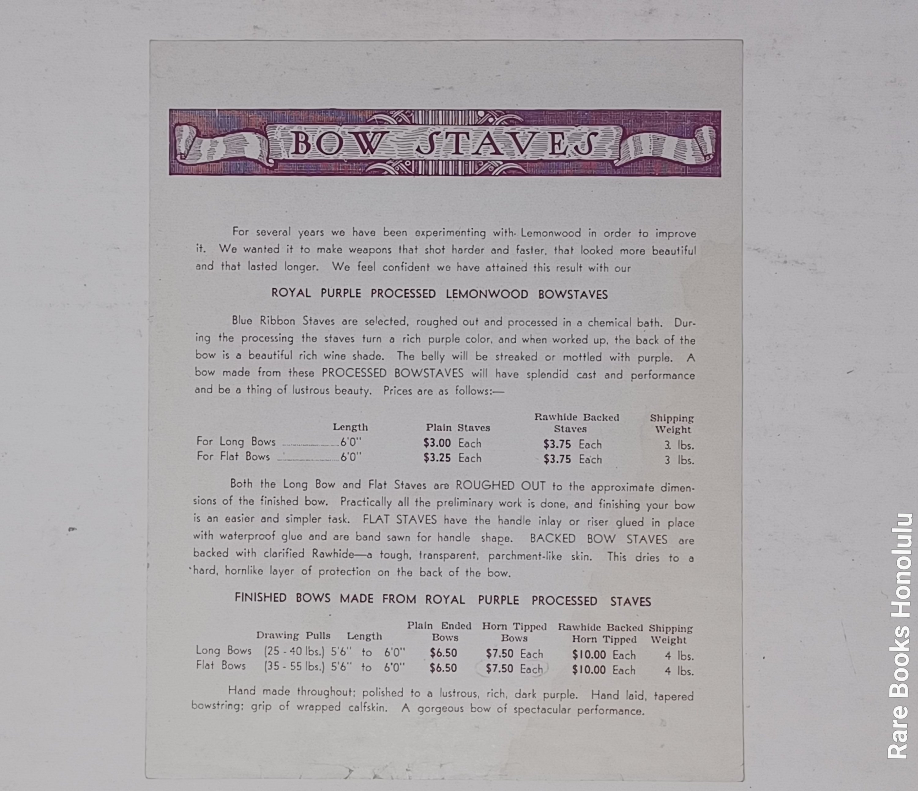 3/ prospectus, one double sided leaf: "BOWS - Lemon Wood" on one side, printed in blue and "Bow Staves" on the other, printed in red, with descriptions and prices. 8.25" x 6.8". Very Good