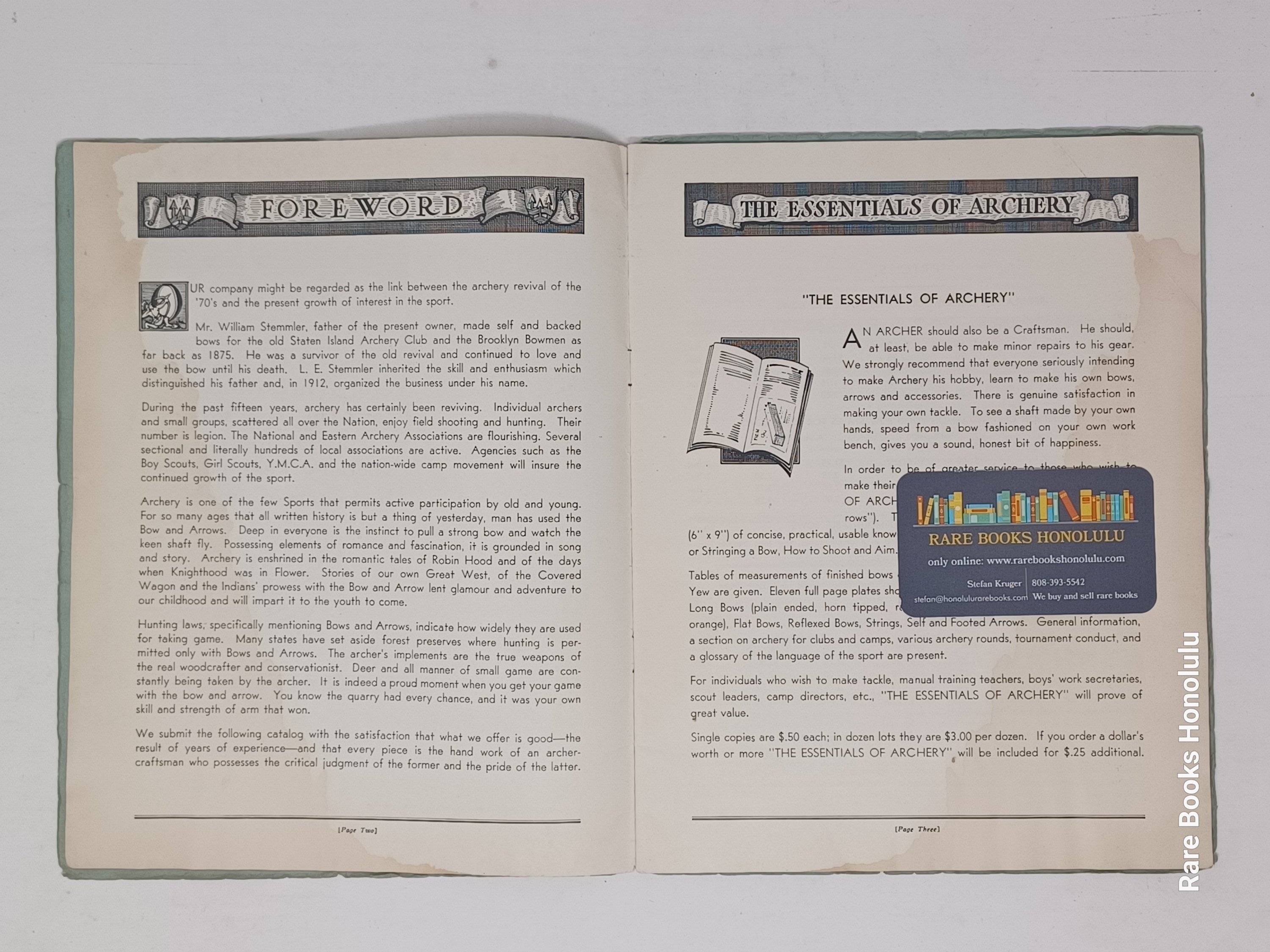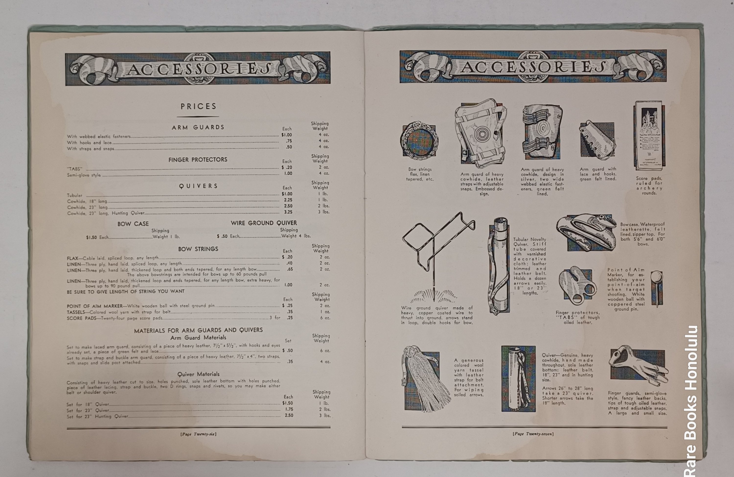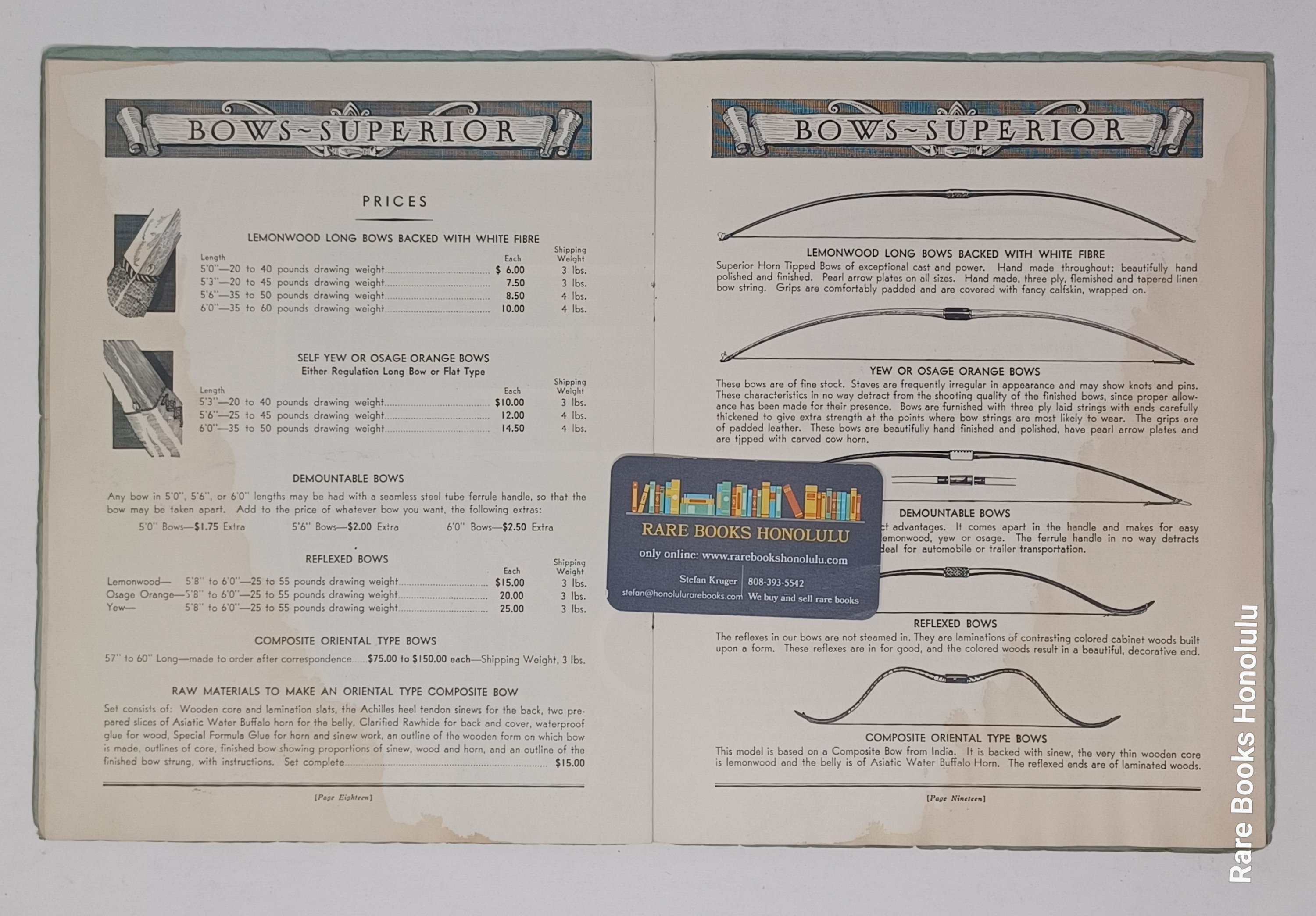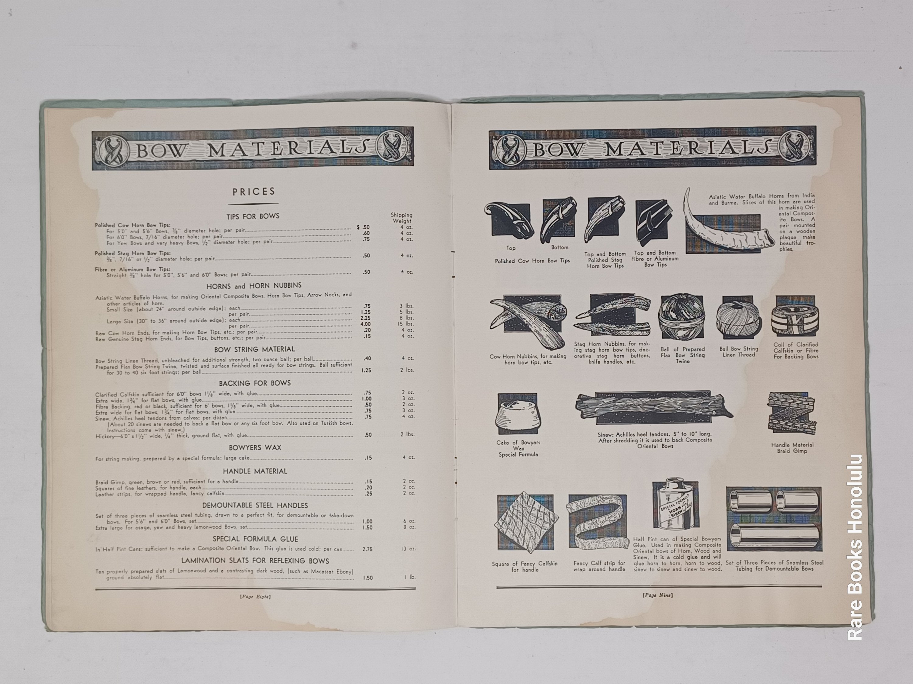 3/ prospectus, one double sided leaf: "BOWS - Lemon Wood" on one side, printed in blue and "Bow Staves" on the other, printed in red, with descriptions and prices. 8.25" x 6.8". Very Good