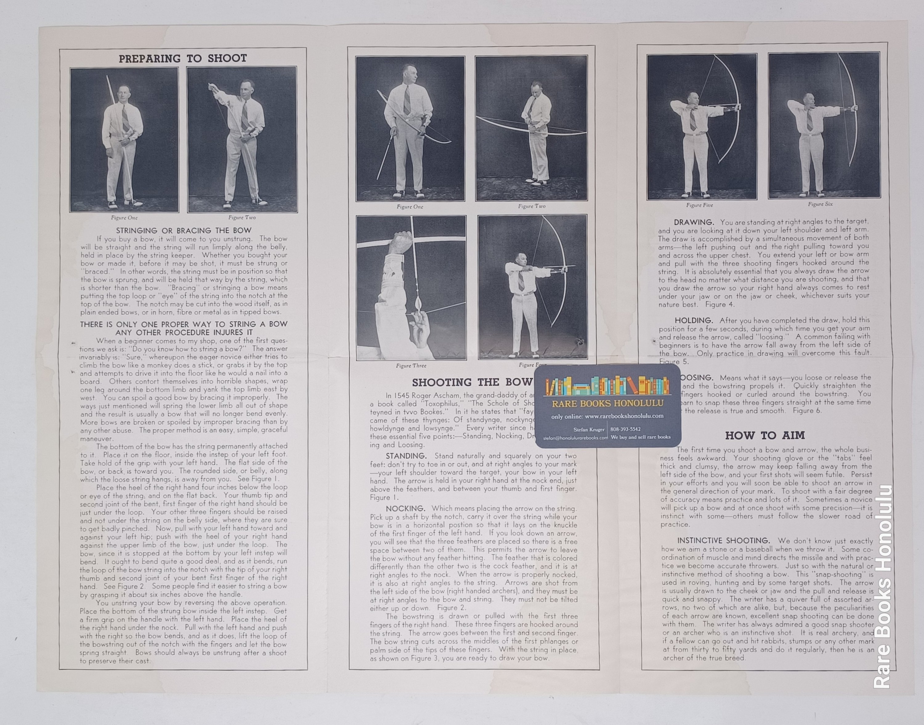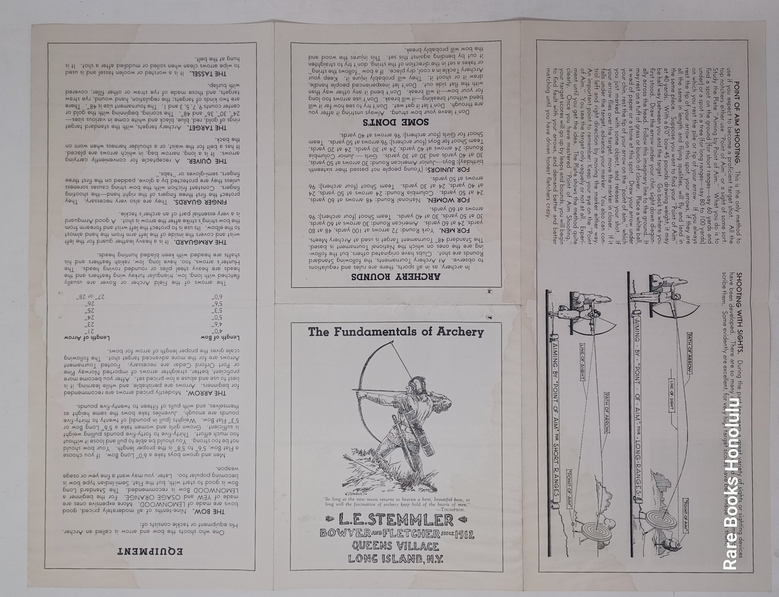 2/ Long Island, NY, L. E. Stemmler Company, The Essentials of Archery: How to Use and Make Bows and Arrows one sheet that folds out to 12 pages with 8 photos of man demonstrating the correct stance to shoot a bow, 21" x 12", with illustrated title page and text on 'How to aim", etc. Very Good