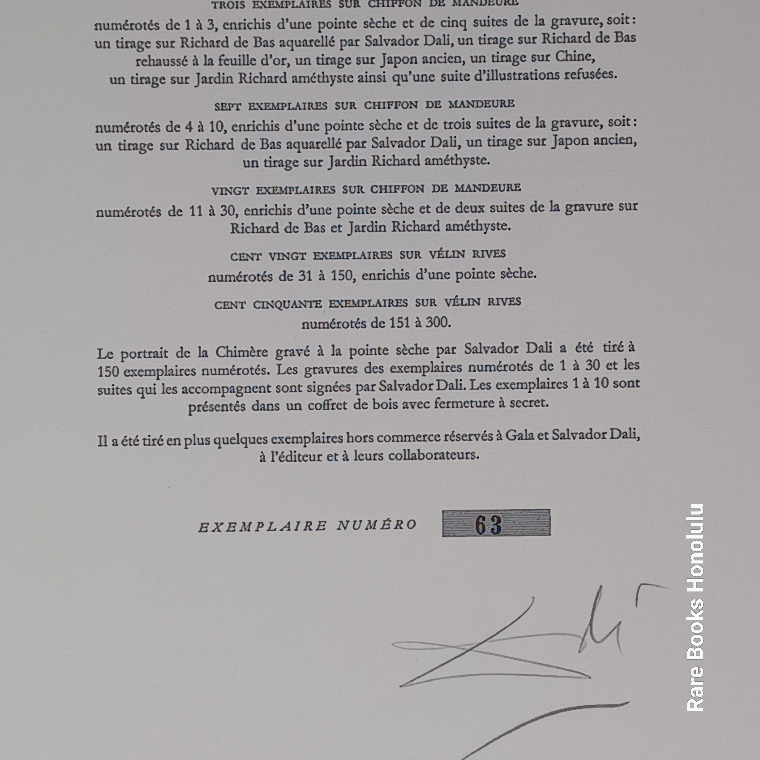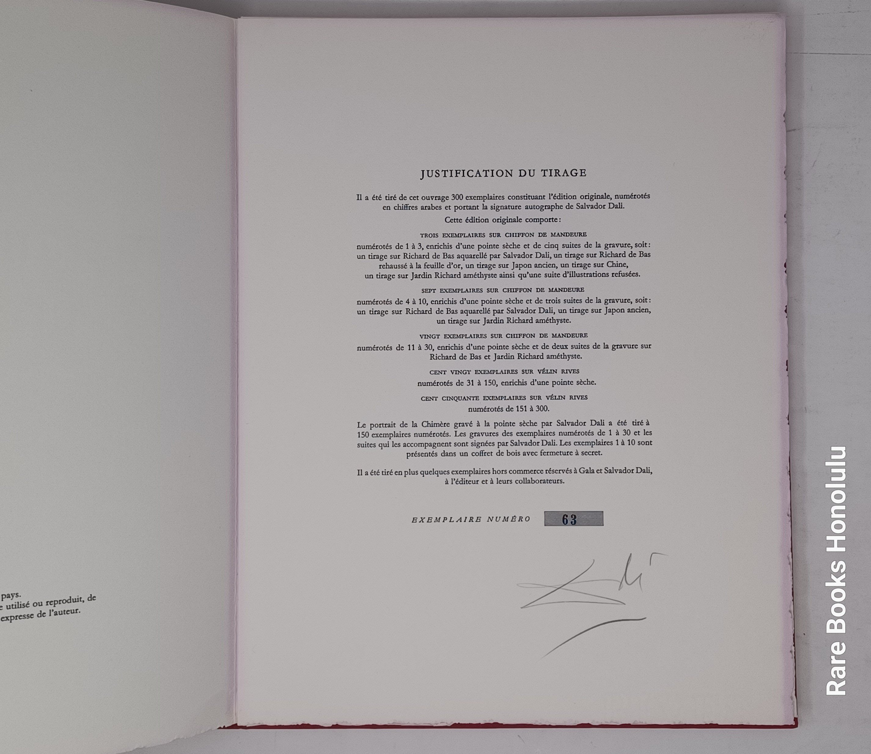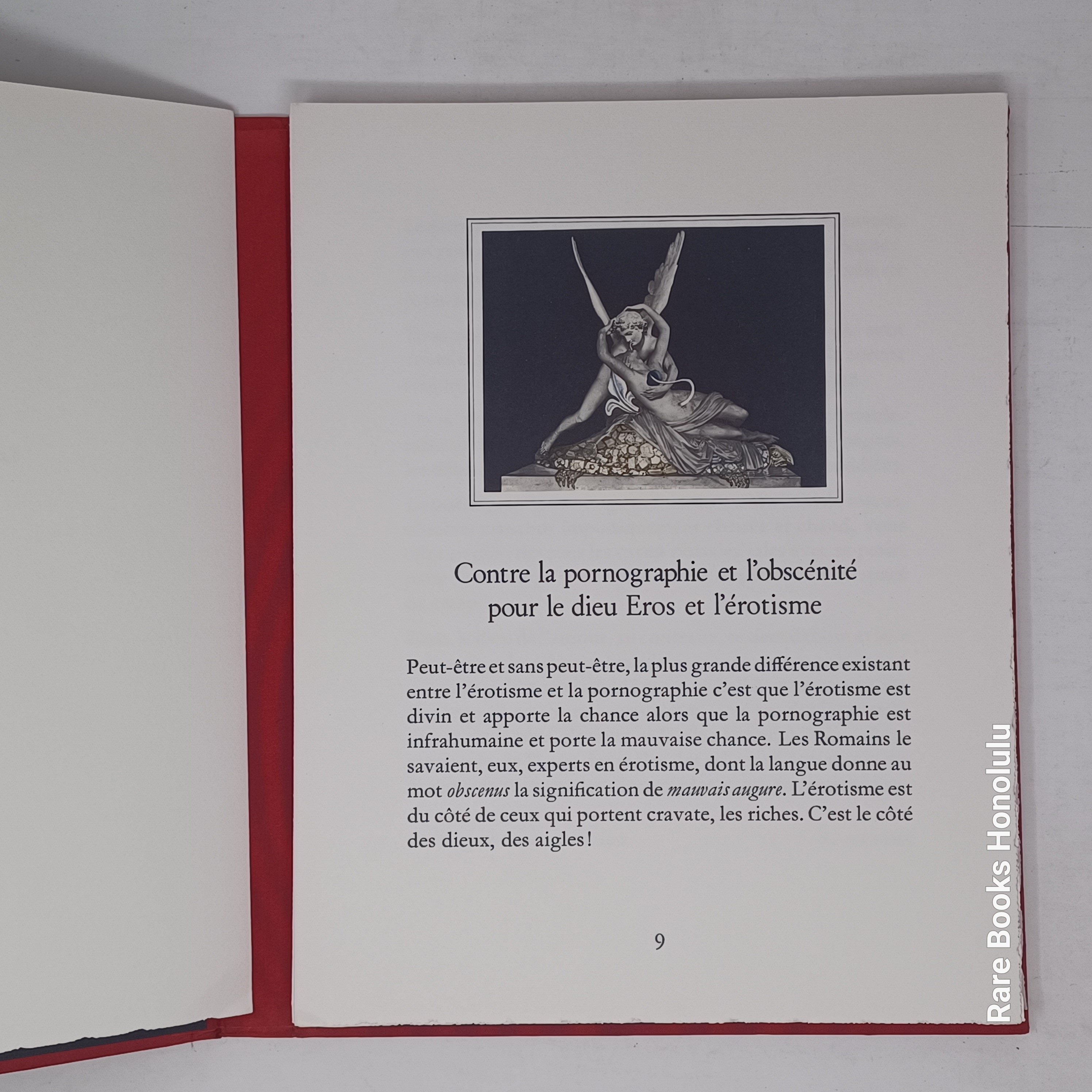 Red canvas in cassette. No. 115/300 copies numbered and signed by the artist. One of 120 copies printed on Rives vellum, with an original drypoint signed by the artist. Includes a two-page introduction by the artist entitled "Against pornography and obscenity, for the god Eros and eroticism."